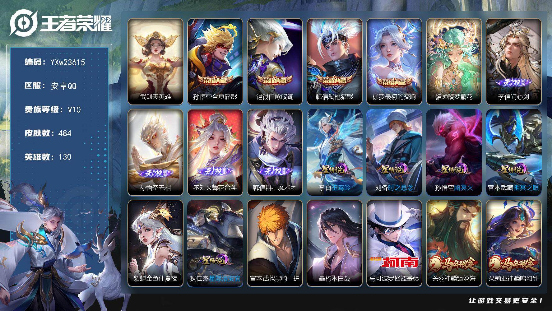 PX_2557128-??贵族v10·50传说·全皮孙悟空·小兵马上有钱·繁花交响诗天幕·珍品无双·馥梦繁花·韩信群星魔术团·怪盗基德·6星传说·玉鸾吟·黑崎一护天幕·夜礼服假面·永恒水手月亮·可二次】YXw23615-安卓Q-130英雄-484皮肤-10王者印记-300铭文-贵族积分20w【贵族10】【5典藏·1珍品无双·4无双·3珍品·6星传说·50传说·2天幕·12按键·3个性戳戳·幸运值】【因赛季更新游戏段付以上号为准!】 【英雄全皮】:嬴政全皮,刘禅全皮,孙权全皮,孙悟空全皮,钟馗全皮,苍全皮,苏烈全皮,沈梦溪全皮,敖隐全皮,戈娅全皮,空空儿全皮,影全皮,海诺全皮 【荣耀典藏】:武则天英雄,孙悟空全息碎影,铠银白咏叹调,韩信弑枪猎影,伽罗最初的交响 【珍品无双】:貂蝉馥梦繁花 【无双皮肤】:李信问心剑,孙悟空无相,不知火舞花合斗,韩信群星魔术团 【珍品传说】:宫本武藏黑崎一护,暃朽木白哉,马可波罗怪盗基德 【星元皮肤】:貂蝉金色仲夏夜,宫本武藏幽冥之眼,孙悟空幽冥火,刘备时之思念,狄仁杰星际治安官,李白玉鸾吟 【天幕】:繁花交响诗天幕,黑崎一护天幕 【小兵皮肤】:小兵马上有钱 【传说皮肤】:关羽神骥镇沧海,朵莉亚神骥鸣幻洲,后羿神树通天,大司命死亡执政官,澜愿照九州拓,云缨幻光神枪,嬴政玄雷天君,桑启鸣野蒿,墨子黄金天蝎座,典韦战鼓燎原,孙策乘龙淬吴钩,马超琥珀纪元,铠琥珀纪元,澜逐花归海,艾琳觅芳踪,露娜霜月吟,狄仁杰夜礼服假面,王昭君永恒水手月亮,公孙离记忆之芯,孙悟空齐天大圣,后羿无尽星芒,赵云淬星耀世,王昭君乞巧织情,周瑜音你心动,小乔音你心动,李元芳飞鸢探春,诸葛亮时雨天司,铠绛天战甲,镜炽阳神光,虞姬启明星使,孙悟空零号赤焰,李信一念神魔,刘备时之恋人,张良黄金白羊座,干将莫邪久胜战神,虞姬云霓雀翎,达摩黄金狮子座,百里玄策白虎志,花木兰冠军飞将,梦奇胖达荣荣,后羿黄金射手座,诸葛亮武陵仙君,貂蝉仲夏夜之梦,李白凤求凰,孙尚香末日机甲,宫本武藏地狱之眼,孙悟空地狱火,吕布天魔缭乱,武则天海洋之心,狄仁杰超时空战士 【限定皮肤】:白起狰,蒙犽顽岩魄,蔡文姬夏日便利店,虞姬夏日便利店,姜子牙天穹之誓,狄仁杰阴阳师,赵云皇家上将,赵云引擎之心,嬴政优雅恋人,嬴政白昼王子,孙尚香蔷薇恋人,鲁班七号狮舞东方,庄周高山流水,钟无艳超时空战士,扁鹊奇幻香踪,芈月重明,吕布天魔缭乱,吕布猎兽之王,吕布御风骁将,周瑜赤莲之焰,元歌云间偶戏,元歌无心,夏侯惇朔风刀,甄姬落雪兰心,曹操烛龙,曹操天狼征服者,典韦穷奇,典韦蓝屏警告,马可波罗暗影游猎,狄仁杰魔术师,狄仁杰万华元夜,达摩星际陆战队,达摩沙漠行僧,项羽海滩派对,老夫子醍醐杖,老夫子航海奇遇记,程咬金演武夺筹,露娜一生所爱,韩信逐梦之影,韩信飞衡,韩信傲雪梅枪,王昭君凤凰于飞,兰陵王驯魔猎人,兰陵王金庭之子,花木兰青春决赛季,花木兰瑞麟志,亚瑟潮玩骑士王,孙悟空美猴王,孙悟空至尊宝,孙悟空大圣娶亲,孙悟空零号赤焰,孙悟空孙行者,孙悟空齐天大圣,牛魔御旌,后羿无尽星芒,张飞虎魄,李元芳银河之约,李元芳匿光侦查者,李元芳云中旅人,虞姬启明星使,钟馗神迹守卫,钟馗驱傩正仪,杨玉环遇见飞天,杨戬潮玩骑兵,女娲朔望之晖,哪吒逐梦之翼,干将莫邪冰霜恋舞曲,雅典娜单词大作战,蔡文姬繁星吟游,太乙真人饕餮,东皇太一逐梦之光,鬼谷子原初探秘者,鬼谷子五谷丰年,诸葛亮武陵仙君,诸葛亮时雨天司,铠青龙志,苏烈玄武志,苏烈千军破阵,百里玄策白虎志,百里玄策原初追逐者,百里守约朱雀志,弈星混沌棋,沈梦溪星空之诺,沈梦溪大漠名商,沈梦溪匿光破解者,明世隐疑决卦,裴擒虎天狼狩猎者,裴擒虎李小龙,裴擒虎擒涛扼浪,狂铁御狮,米莱狄御霄,米莱狄胡桃异想国,云中君纤云弄巧,盾山御銮,猪八戒西部大镖客,上官婉儿梁祝,嫦娥暖冬兔眠,西施玲珑珍味,蒙犽狂想玩偶喵,鲁班大师探海日志,桑启海盐诗旅,暃星界游侠,戈娅驭风魔法,艾琳女武神,艾琳流音漫舞,司空震地狱燃心,阿古朵江河有灵,张良古海寻踪,王昭君永恒水手月亮,狄仁杰夜礼服假面,裴擒虎梅西,蒙犽百解令,艾琳觅芳踪,蒙恬荣光圣徽,高渐离燃音魔法,妲己灵卜魔法,鬼谷子天穹祈灯,伽罗琥珀纪元,铠琥珀纪元,马超琥珀纪元,安琪拉乘龙聚宝船,孙策乘龙淬吴钩,沈梦溪龙舞盛年,鲁班七号蔬乡物语,李元芳蔬乡物语,刘邦剑破天穹,程咬金群星魔术团,韩信群星魔术团,关羽决胜骁骑,镜青焰无极,项羽苍威无极,海诺心动手记,刘备异域游侠,芈月浮光幕影,周瑜熔金海岸,不知火舞花合斗 【年限皮肤】:孙悟空美猴王,王昭君凤凰于飞,李白凤求凰,花木兰瑞麟志,苏烈玄武志,百里玄策白虎志,百里守约朱雀志,铠青龙志,韩信飞衡,诸葛亮时雨天司,吕布御风骁将,孙策乘龙淬吴钩,安琪拉乘龙聚宝船,澜愿照九州拓 【赛季限定】:白起狰,太乙真人饕餮,曹操烛龙,芈月重明,典韦穷奇,狂铁御狮,米莱狄御霄,牛魔御旌,盾山御銮,夏侯惇朔风刀,弈星混沌棋,明世隐疑决卦,老夫子醍醐杖,鬼谷子原初探秘者,狄仁杰万华元夜,程咬金演武夺筹,钟馗驱傩正仪,苏烈千军破阵,达摩沙漠行僧,兰陵王金庭之子,沈梦溪大漠名商,李元芳云中旅人,桑启海盐诗旅,裴擒虎擒涛扼浪,鲁班大师探海日志,张良古海寻踪,鬼谷子天穹祈灯,刘邦剑破天穹,姜子牙天穹之誓,东皇太一噬灭天穹,太乙真人谧流熔炉,钟馗虚灵犬护,甄姬逆浪荇歌,亚