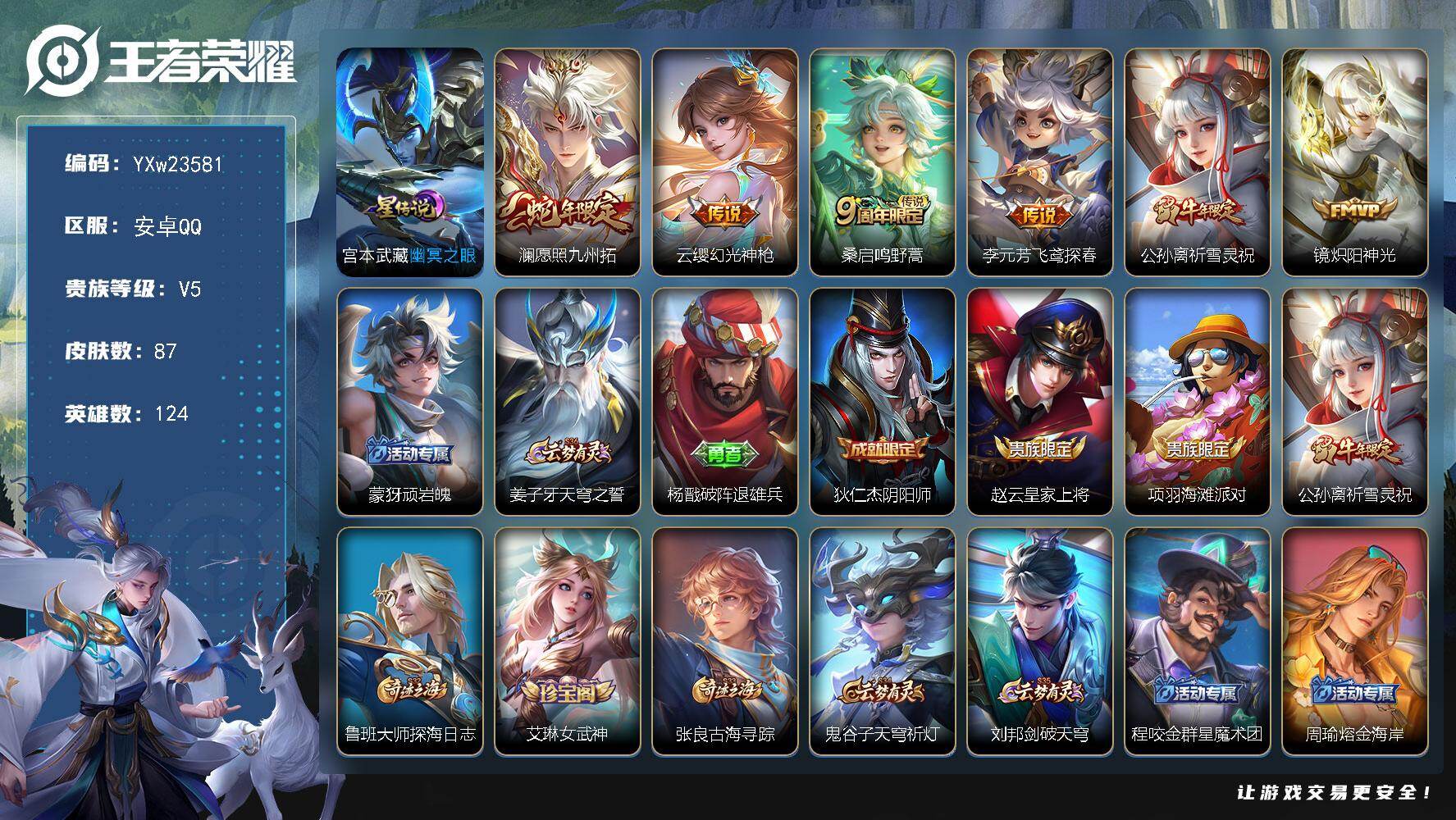 PX_2556958-??小号推荐·祈雪灵祝·愿照九州拓·幽冥之眼·炽阳神光·飞鸢探春·幻光神枪·可二次】YXw23581-安卓Q-124英雄-87皮肤-3王者印记-100铭文-贵族积分0w【贵族5】【1星传说·6传说·5按键】【因赛季更新游戏段付以上号为准!】 【星元皮肤】:宫本武藏幽冥之眼 【传说皮肤】:澜愿照九州拓,云缨幻光神枪,桑启鸣野蒿,李元芳飞鸢探春,公孙离祈雪灵祝,镜炽阳神光 【限定皮肤】:蒙犽顽岩魄,姜子牙天穹之誓,杨戬破阵退雄兵,狄仁杰阴阳师,赵云皇家上将,项羽海滩派对,公孙离祈雪灵祝,鲁班大师探海日志,艾琳女武神,张良古海寻踪,鬼谷子天穹祈灯,刘邦剑破天穹,程咬金群星魔术团,周瑜熔金海岸 【年限皮肤】:公孙离祈雪灵祝,澜愿照九州拓 【赛季限定】:鲁班大师探海日志,张良古海寻踪,鬼谷子天穹祈灯,刘邦剑破天穹,姜子牙天穹之誓,东皇太一噬灭天穹,太乙真人谧流熔炉,钟馗虚灵犬护 【战令限定】:周瑜线条小狗 【史诗皮肤】:周瑜线条小狗,公孙离涂山容容,赵怀真器灵浮梦炉,姬小满战舞者,蒙犽顽岩魄,狄仁杰鹰眼统帅,程咬金功夫厨神,李元芳逐浪之夏,刘禅天才门将,安琪拉心灵骇客,夏侯惇乘风破浪,花木兰水晶猎龙者,吕布末日机甲,妲己魅力维加斯,孙尚香水果甜心,王昭君偶像歌手,甄姬冰雪圆舞曲,貂蝉圣诞恋歌,赵云皇家上将 【其他皮肤】:兰陵王雾影缉谜,艾琳鹤鸣心笺,白起死霸装,姬小满小满鸭,露娜命运加冕,阿古朵布丁狗之约,张良灵野札记,苏烈春野闲踪,钟馗虚灵犬护,戈娅玫蓝誓约,西施雪境奇遇,典韦铁骨偃魂,太乙真人谧流熔炉,苍苍林狼骑,东皇太一噬灭天穹,周瑜熔金海岸,姜子牙天穹之誓,杨戬破阵退雄兵,程咬金群星魔术团,盘古经纬探寻者,刘邦剑破天穹,钟无艳春野之旅,鬼谷子天穹祈灯,亚连破局者,钟无艳聚星闪耀,张良古海寻踪,鲁班大师探海日志,太乙真人劲辣红锅,猪八戒潮玩探月行,鲁班大师乓乓大师,盾山圆桌骑士,哪吒次元突破,明世隐虹云星官,孙尚香沉稳之力,老夫子功夫老勺,狂铁命运角斗场,王昭君幻想奇妙夜,狄仁杰阴阳师,花木兰兔女郎,亚瑟死亡骑士,典韦黄金武士,妲己少女阿狸,姜子牙时尚教父,扁鹊救世之瞳,白起白色死神,艾琳女武神,露娜哥特玫瑰,项羽海滩派对,暃碧珀绯影,云缨赤焰之缨,西施归虚梦演,猪八戒年年有余,公孙离花间舞,东皇太一东海龙王,黄忠芝加哥教父,杨戬埃及法老,小乔万圣前夜,张良一千零一夜,狄仁杰锦衣卫,王昭君精灵公主,貂蝉异域舞娘,露娜绯红之刃 【内测皮肤】:艾琳女武神