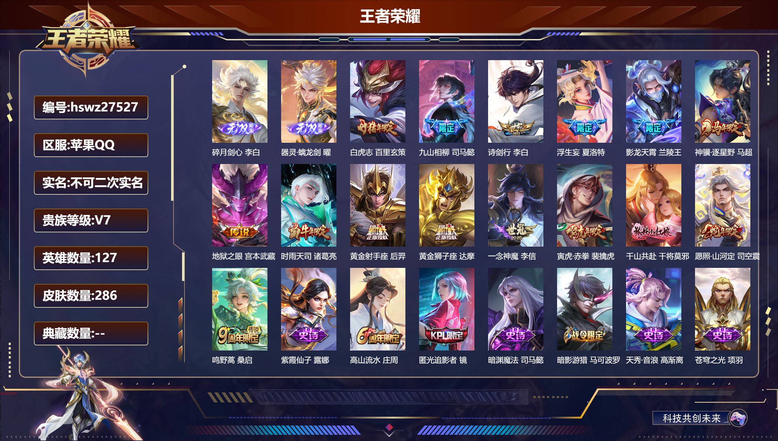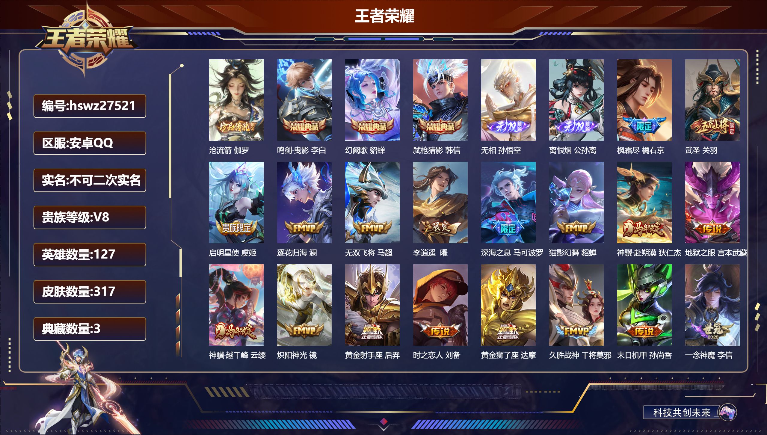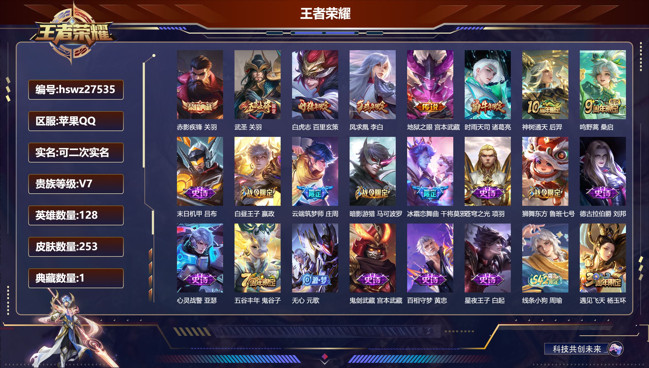 PX_2541617-Q/非凡王者/253皮肤/128英雄/1典藏/0珍品无双/0无双/0珍品传说/7传说/68史诗/9稀有英雄 【1,典藏皮肤】赤影疾锋,关羽, 【7,传说皮肤】武圣,关羽,白虎志,百里玄策,凤求凰,李白,地狱之眼,宫本武藏,时雨天司,诸葛亮,神树通天,后羿,鸣野蒿,桑启, 【68,史诗皮肤】末日机甲,吕布,白昼王子,嬴政,云端筑梦师,庄周,暗影游猎,马可波罗,冰霜恋舞曲,干将莫邪,苍穹之光,项羽,狮舞东方,鲁班七号,德古拉伯爵,刘邦,心灵战警,亚瑟,五谷丰年,鬼谷子,无心,元歌,鬼剑武藏,宫本武藏,百相守梦,黄忠,星夜王子,白起,线条小狗,周瑜,遇见飞天,杨玉环,摇滚巨星,嬴政,电玩高手,狂铁,修罗,橘右京,魅力维加斯,妲己,黄金分割率,诸葛亮,九幽镇关,项羽,星界游侠,暃,繁星吟游,蔡文姬,暗夜贵公子,嬴政,鹰眼统帅,狄仁杰,逐梦之光,东皇太一,飞衡,韩信,李小龙,裴擒虎,纤云弄巧,云中君,龙骑士,墨子,金属风暴,墨子,特工魅影,百里守约,猫狗日记,孙策,逐浪之夏,李元芳,未来纪元,赵云,黎明之约,雅典娜,魔术师,狄仁杰,龙之律动,狂铁,皇家上将,赵云,冰冠公主,雅典娜,功夫厨神,程咬金,梁祝,上官婉儿,天才门将,刘禅,圣诞恋歌,貂蝉,水晶猎龙者,花木兰,决胜骁骑,关羽,一生所爱,露娜,圣诞狂欢,吕布,青焰无极,镜,岱宗,典韦,星界战将,牛魔,永昼,夏洛特,冰雪圆舞曲,甄姬,千年之狐,李白,节奏热浪,阿轲,超时空战士,钟无艳,青春决赛季,花木兰,曙光守护者,铠,万灵启世,女娲,心灵骇客,安琪拉,箭羽风息,伽罗,乱世虎臣,张飞,绅士熊喵,刘禅,缤纷独角兽,小乔,水果甜心,孙尚香,幽灵船长,曹操,暗隐猎兽者,兰陵王, 【128,勇者皮肤】圆桌骑士,盾山,烛龙,曹操,爱心护理,阿轲,沙漠行僧,达摩,大漠名商,沈梦溪,缤纷绘卷,张良,纽约教父,刘备,拳王,达摩,大发明家,达摩,龙舞盛年,沈梦溪,丁香结,小乔,功夫炙烤,廉颇,沉稳之力,孙尚香,海盐诗旅,桑启,朔风刀,夏侯惇,醍醐杖,老夫子,归虚梦演,孙膑,汉昭烈帝,刘备,白色死神,白起,黑桃队长,鲁班七号,黄金武士,典韦,落雪兰心,甄姬,御旌,牛魔,阴阳师,狄仁杰,炼金王,扁鹊,致命风华,阿轲,次元突破,哪吒,古海寻踪,张良,牛运亨通,牛魔,功夫老勺,老夫子,西部大镖客,牛魔,鲨炮海盗猫,沈梦溪,海滩派对,项羽,万华元夜,狄仁杰,无尽征程,廉颇,制霸全明星,牛魔,踏浪烽翎,莱西奥,演武夺筹,程咬金,红桃皇后,芈月,西部游侠,莱西奥,猎兽之王,吕布,野性能量,吕布,守护之力,大乔,无双福将,程咬金,百相守梦,影,原初探秘者,鬼谷子,潮玩探月行,猪八戒,决胜大满贯,曹操,西部大镖客,猪八戒,疑决卦,明世隐,化身博士,扁鹊,阿尔法小队,后羿,五福同心,张飞,次元傲视,杨戬,星际陆战队,程咬金,幻乐之宴,鬼谷子,东方不败,武则天,霸王丸,宫本武藏,虹云星官,明世隐,救世之瞳,扁鹊,死亡骑士,亚瑟,敏锐之力,李白,危途狂花,戈娅,幽兰居士,张良,玩偶对对碰,安琪拉,掌控之力,诸葛亮,海滩丽影,钟无艳,忍·炎影,赵云,狰,白起,重明,芈月,炽热元素使,姜子牙,坚韧之力,苏烈,万事如意,刘备,擒涛扼浪,裴擒虎,乓乓大师,鲁班大师,探海日志,鲁班大师,天使之翼,孙膑,玩趣恶龙,高渐离,兔女郎,花木兰,龙腾万里,关羽,罗小黑战记,哪吒,荣光之誓,亚瑟,花好人间,甄姬,万象初新,宫本武藏,潮玩造梦师,刘备,御銮,盾山,时尚教父,姜子牙,秘密基地,刘禅,穷奇,典韦,教廷特使,韩信,街头霸王,韩信,云中旅人,李元芳,西部大镖客,孙悟空,凯尔特女王,虞姬,少女阿狸,妲己,混沌棋,弈星,御霄,米莱狄,蔚蓝守将,蒙恬,春野闲踪,苏烈,布丁狗之约,阿古朵,暖冬·兔眠,嫦娥,命运加冕,露娜,午后时光,王昭君,幻想奇妙夜,王昭君,灵野札记,张良,驱傩正仪,钟馗,神迹守卫,钟馗,命运角斗场,狂铁,虚灵犬护,钟馗,御狮,狂铁,白执事,赵云,饕餮,太乙真人,劲辣红锅,太乙真人,罗小黑战记,张良,剑破天穹,刘邦,苍威无极,项羽,熔金海岸,周瑜,苍林狼骑,苍,天穹之誓,姜子牙,星梦巡礼,姜子牙,谧流熔炉,太乙真人,鹤鸣心笺,艾琳,逆浪荇歌,甄姬,线条小狗,周瑜,噬灭天穹,东皇太一,敬我三分,盘古,玫蓝誓约,戈娅,景韶洛都,明世隐, 【52,其他皮肤】前尘,金蝉,芝加哥教父,黄忠,三太子,哪吒,棒球奇才,沈梦溪,极冰防御线,盾山,龙域领主,铠,花见巫女,伽罗,爱与和平,苏烈,万圣前夜,小乔,灼热之刃,李信,海之征途,孙策,精灵王,后羿,冰刃幻境,镜,碧珀绯影,暃,海军大将,周瑜,星航指挥官,诸葛亮,魇语军师,司马懿,英喵野望,刘禅,午夜歌剧院,元歌,启蛰,司空震,隐刃,兰陵王,霓裳曲,杨玉环,花间舞,公孙离,街头旋风,裴擒虎,修竹墨客,上官婉儿,剑舞者,花木兰,维京掠夺者,苍,占星师,明世隐,激情绿茵,马可波罗,埃及法老,杨戬,阿摩司公爵,鬼谷子,年年有余,猪八戒,锦衣卫,狄仁杰,一千零一夜,张良,归虚梦演,曜,威尼斯狂欢,百里玄策,决胜骁骑,关羽,幸存者,马超,战争女神,雅典娜,荷鲁斯之眼,云中君,创世神祝,盘古,特种部队,李元芳,绝影神枪,百里守约,加勒比小姐,虞姬,踏雪寻梅,弈星,秩序猎龙将,蒙恬,精灵公主,王昭君,赤焰之缨,云缨,地府判官,钟馗,美梦成真,梦奇,天启骑士,关羽,西部大镖客,孙悟空, 【9,稀有英雄】敖隐,嬴政,不知火舞,橘右京,夏洛特,娜可露露,韩信,艾琳,赵云, 营地ID:,