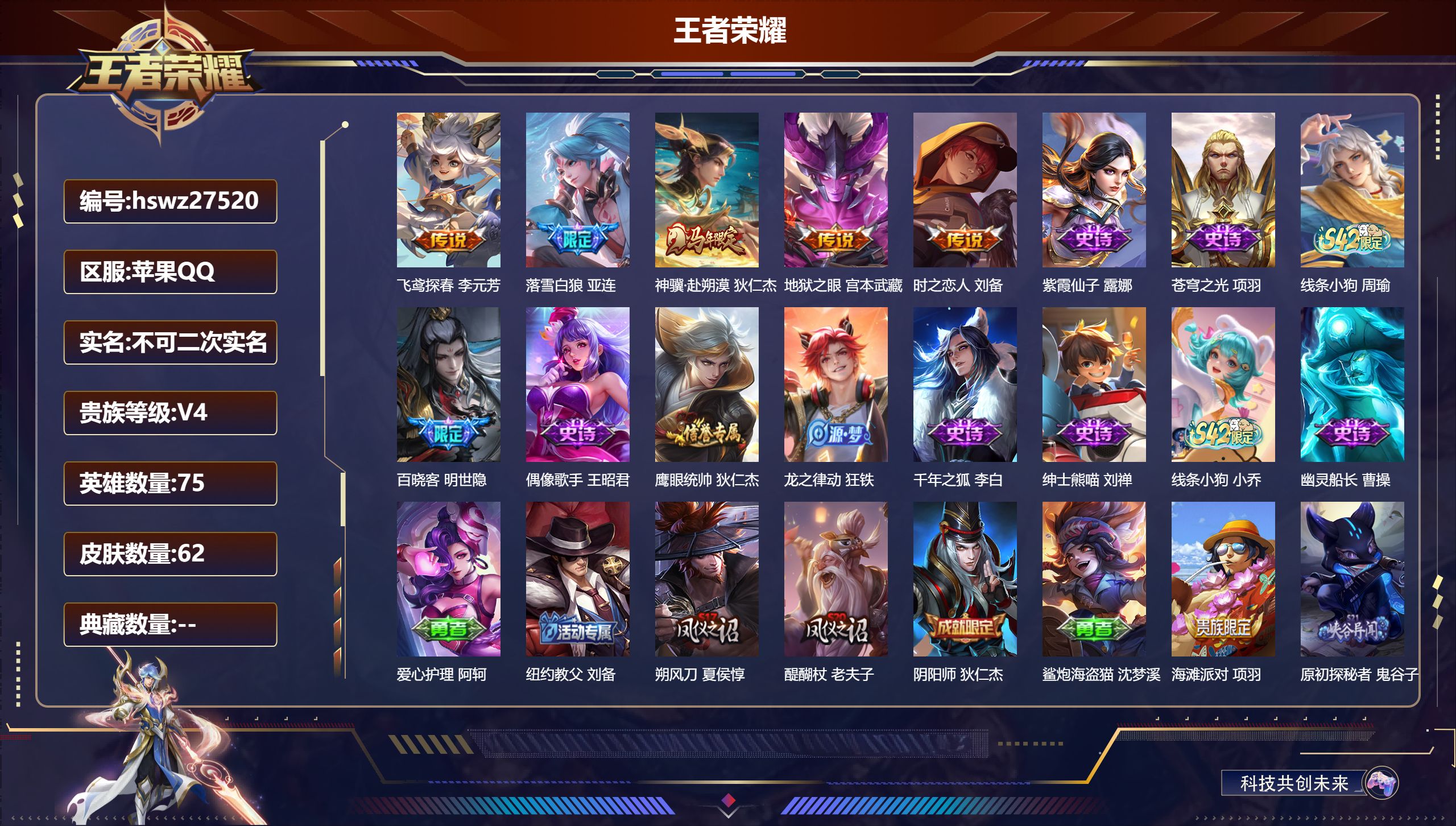 PX_2541522-Q/绝世王者/62皮肤/75英雄/0典藏/0珍品无双/0无双/0珍品传说/5传说/11史诗/6稀有英雄 【5,传说皮肤】飞鸢探春,李元芳,落雪白狼,亚连,神骥·赴朔漠,狄仁杰,地狱之眼,宫本武藏,时之恋人,刘备, 【11,史诗皮肤】紫霞仙子,露娜,苍穹之光,项羽,线条小狗,周瑜,百晓客,明世隐,偶像歌手,王昭君,鹰眼统帅,狄仁杰,龙之律动,狂铁,千年之狐,李白,绅士熊喵,刘禅,线条小狗,小乔,幽灵船长,曹操, 【27,勇者皮肤】爱心护理,阿轲,纽约教父,刘备,朔风刀,夏侯惇,醍醐杖,老夫子,阴阳师,狄仁杰,鲨炮海盗猫,沈梦溪,海滩派对,项羽,原初探秘者,鬼谷子,疑决卦,明世隐,舞狮寰,吕布,赤刃凌霄,敖隐,死亡骑士,亚瑟,乓乓大师,鲁班大师,溯影追猎,虞姬,天使之翼,孙膑,荣光之誓,亚瑟,花好人间,甄姬,御銮,盾山,教廷特使,韩信,街头霸王,韩信,混沌棋,弈星,驱傩正仪,钟馗,班班快跑,鲁班七号,魅影绮裳,影,线条小狗,妲己,线条小狗,周瑜,线条小狗,桑启, 【20,其他皮肤】三太子,哪吒,龙域领主,铠,花见巫女,伽罗,熊喵少女,阿古朵,精灵王,后羿,绯红之刃,露娜,启蛰,司空震,隐刃,兰陵王,花间舞,公孙离,街头旋风,裴擒虎,激情绿茵,马可波罗,一千零一夜,张良,归虚梦演,曜,威尼斯狂欢,百里玄策,荷鲁斯之眼,云中君,特种部队,李元芳,森,瑶,孤猎,澜,赤焰之缨,云缨,露花倒影,嫦娥, 【6,稀有英雄】不知火舞,橘右京,娜可露露,韩信,艾琳,赵云, 营地ID:,