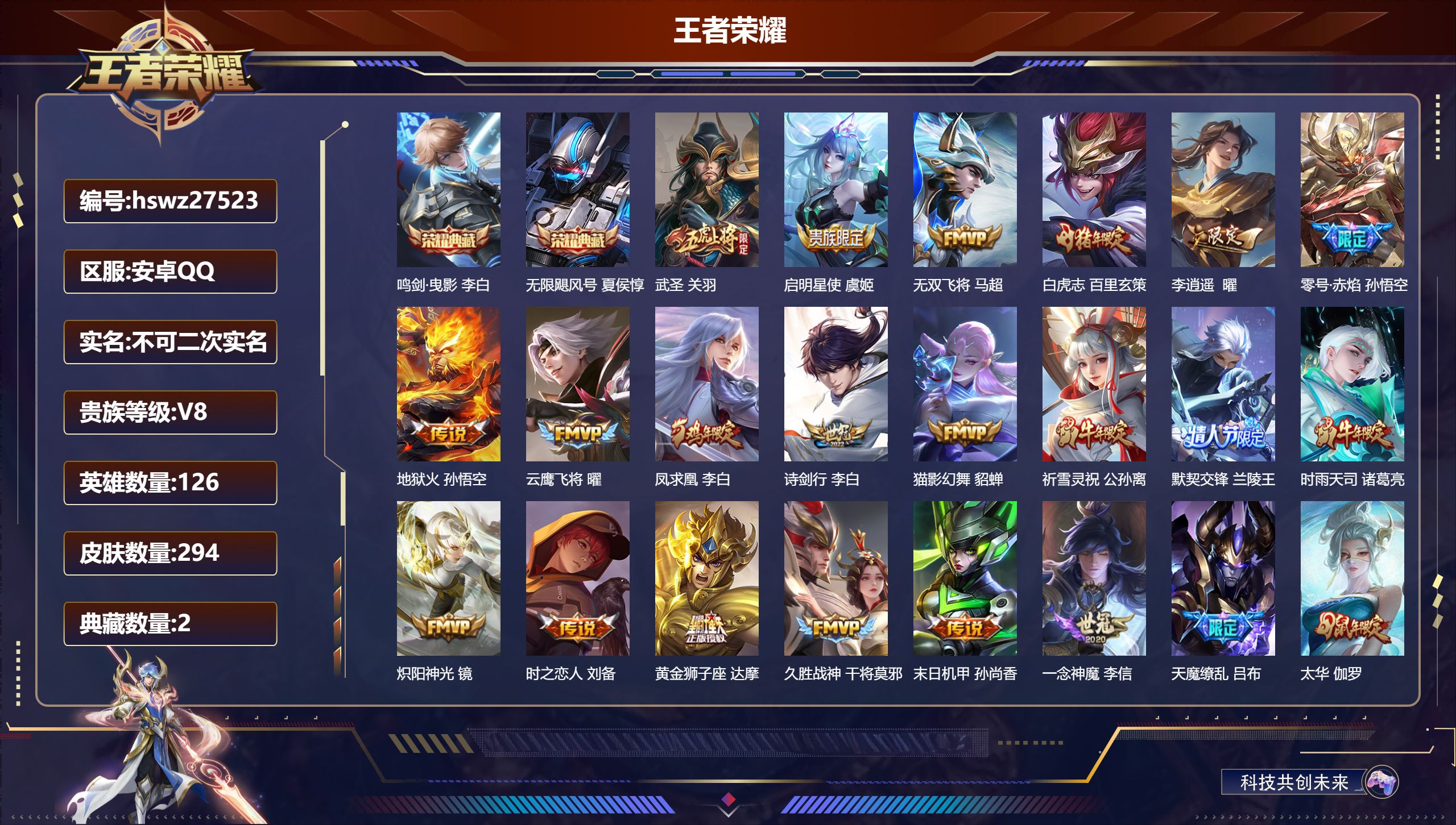 PX_2541538-Q/至尊星耀/294皮肤/126英雄/2典藏/0珍品无双/0无双/0珍品传说/24传说/80史诗/7稀有英雄 【2,典藏皮肤】鸣剑·曳影,李白,无限飓风号,夏侯惇, 【24,传说皮肤】武圣,关羽,启明星使,虞姬,无双飞将,马超,白虎志,百里玄策,李逍遥,,曜,零号·赤焰,孙悟空,地狱火,孙悟空,云鹰飞将,曜,凤求凰,李白,诗剑行,李白,猫影幻舞,貂蝉,祈雪灵祝,公孙离,默契交锋,兰陵王,时雨天司,诸葛亮,炽阳神光,镜,时之恋人,刘备,黄金狮子座,达摩,久胜战神,干将莫邪,末日机甲,孙尚香,一念神魔,李信,天魔缭乱,吕布,太华,伽罗,绛天战甲,铠,神树通天,后羿, 【80,史诗皮肤】奔雷神使,牛魔,龙鼓争鸣,蒙犽,电玩小子,鲁班七号,紫霞仙子,露娜,银河之约,李元芳,暗影游猎,马可波罗,猫狗日记,大乔,妄想食味,姬小满,德古拉伯爵,刘邦,心灵战警,亚瑟,五谷丰年,鬼谷子,诗语江南,西施,鬼剑武藏,宫本武藏,百相守梦,黄忠,迷踪丽影,阿轲,星夜王子,白起,无限星赏官,公孙离,线条小狗,周瑜,摇滚巨星,嬴政,顽趣,梦奇,修罗,橘右京,魅力维加斯,妲己,黄金分割率,诸葛亮,偶像歌手,王昭君,霸王别姬,虞姬,赏金猎手,澜,晚萤,娜可露露,舞动绿茵,蔡文姬,繁星吟游,蔡文姬,暗夜贵公子,嬴政,鹰眼统帅,狄仁杰,胡桃异想国,米莱狄,白晶晶,芈月,飞衡,韩信,李小龙,裴擒虎,纤云弄巧,云中君,如梦令,后羿,金属风暴,墨子,特工魅影,百里守约,猫狗日记,孙策,原初追逐者,百里玄策,逐浪之夏,李元芳,灵蛊蚀心,扁鹊,朱雀志,百里守约,黎明之约,雅典娜,优雅恋人,嬴政,魔术师,狄仁杰,龙之律动,狂铁,神威,马超,皇家上将,赵云,至尊宝,孙悟空,功夫厨神,程咬金,圣诞恋歌,貂蝉,云间偶戏,元歌,水晶猎龙者,花木兰,涂山容容,公孙离,烈魂,黄忠,圣诞狂欢,吕布,魅语,不知火舞,天狼绘梦者,上官婉儿,岱宗,典韦,天狼运算者,孙膑,地狱岩魂,廉颇,冰雪圆舞曲,甄姬,默契交锋,花木兰,千年之狐,李白,节奏热浪,阿轲,曙光守护者,铠,心灵骇客,安琪拉,乱世虎臣,张飞,龙胆,赵云,王者之锤,钟无艳,绅士熊喵,刘禅,缤纷独角兽,小乔,时之恋人,孙尚香,水果甜心,孙尚香,狂想玩偶喵,蒙犽,幽灵船长,曹操,乘风破浪,夏侯惇,暗隐猎兽者,兰陵王, 【128,勇者皮肤】圆桌骑士,盾山,烛龙,曹操,星际陆战队,达摩,沙漠行僧,达摩,大漠名商,沈梦溪,缤纷绘卷,张良,纽约教父,刘备,拳王,达摩,大发明家,达摩,龙舞盛年,沈梦溪,丁香结,小乔,功夫炙烤,廉颇,沉稳之力,孙尚香,海盐诗旅,桑启,朔风刀,夏侯惇,醍醐杖,老夫子,归虚梦演,孙膑,汉昭烈帝,刘备,白色死神,白起,黑桃队长,鲁班七号,黄金武士,典韦,夺宝奇兵,刘邦,御旌,牛魔,阴阳师,狄仁杰,炼金王,扁鹊,次元突破,哪吒,古海寻踪,张良,科学大爆炸,项羽,功夫老勺,老夫子,鲨炮海盗猫,沈梦溪,海滩派对,项羽,万华元夜,狄仁杰,无尽征程,廉颇,克喵,鬼谷子,踏浪烽翎,莱西奥,演武夺筹,程咬金,红桃皇后,芈月,西部游侠,莱西奥,蜃楼王,庄周,野性能量,吕布,哥特玫瑰,露娜,守护之力,大乔,无双福将,程咬金,瓷语鉴心,露娜,百相守梦,影,原初探秘者,鬼谷子,星空之诺,沈梦溪,潮玩探月行,猪八戒,决胜大满贯,曹操,西部大镖客,猪八戒,疑决卦,明世隐,化身博士,扁鹊,潮玩骑士王,亚瑟,阿尔法小队,后羿,次元傲视,杨戬,星际陆战队,程咬金,幻乐之宴,鬼谷子,东方不败,武则天,霸王丸,宫本武藏,虹云星官,明世隐,雾影缉谜,兰陵王,死亡骑士,亚瑟,浪漫序章,刘备,敏锐之力,李白,玩偶对对碰,安琪拉,掌控之力,诸葛亮,海滩丽影,钟无艳,忍·炎影,赵云,狰,白起,雪境奇遇,西施,重明,芈月,炽热元素使,姜子牙,坚韧之力,苏烈,万事如意,刘备,擒涛扼浪,裴擒虎,乓乓大师,鲁班大师,死亡摇滚,高渐离,溯影追猎,虞姬,妖精王,孙膑,极光幻客,蚩奼,探海日志,鲁班大师,天使之翼,孙膑,兔女郎,花木兰,龙腾万里,关羽,金庭之子,兰陵王,未来纪元,宫本武藏,千军破阵,苏烈,荣光之誓,亚瑟,花好人间,甄姬,万象初新,宫本武藏,御銮,盾山,单词大作战,雅典娜,时尚教父,姜子牙,秘密基地,刘禅,穷奇,典韦,教廷特使,韩信,街头霸王,韩信,云中旅人,李元芳,西部大镖客,孙悟空,重装意志,盘古,凯尔特女王,虞姬,进击墨子号,墨子,少女阿狸,妲己,混沌棋,弈星,御霄,米莱狄,春野闲踪,苏烈,小满鸭,姬小满,幻想奇妙夜,王昭君,灵野札记,张良,驱傩正仪,钟馗,命运角斗场,狂铁,死霸装,白起,虚灵犬护,钟馗,御狮,狂铁,班班快跑,鲁班七号,白执事,赵云,饕餮,太乙真人,华丽摇滚,太乙真人,苍林狼骑,苍,星梦巡礼,姜子牙,金福满堂,东皇太一,鹤鸣心笺,艾琳,逆浪荇歌,甄姬,线条小狗,周瑜,线条小狗,桑启,噬灭天穹,东皇太一,敬我三分,盘古,玫蓝誓约,戈娅, 【62,其他皮肤】金属狂潮,高渐离,前尘,金蝉,战争骑士,夏侯惇,圣殿之光,刘邦,芝加哥教父,黄忠,潮流仙人,老夫子,三太子,哪吒,极冰防御线,盾山,龙域领主,铠,生化警戒,钟无艳,爱与和平,苏烈,未来旅行,孙膑,第七人偶,干将莫邪,灼热之刃,李信,熊喵少女,阿古朵,海之征途,孙策,福禄兄弟,鲁班七号,帝国元帅,项羽,精灵王,后羿,绯红之刃,露娜,冰刃幻境,镜,碧珀绯影,暃,星航指挥官,诸葛亮,午夜歌剧院,元歌,启蛰,司空震,花间舞,公孙离,街头旋风,裴擒虎,归虚梦演,鲁班大师,东海龙王,东皇太一,修竹墨客,上官婉儿,剑舞者,花木兰,范海辛,李白,维京掠夺者,苍,占星师,明世隐,归虚梦演,蒙犽,激情绿茵,马可波罗,埃及法老,杨戬,归虚梦演,西施,阿摩司公爵,鬼谷子,画中游,桑启,年年有余,