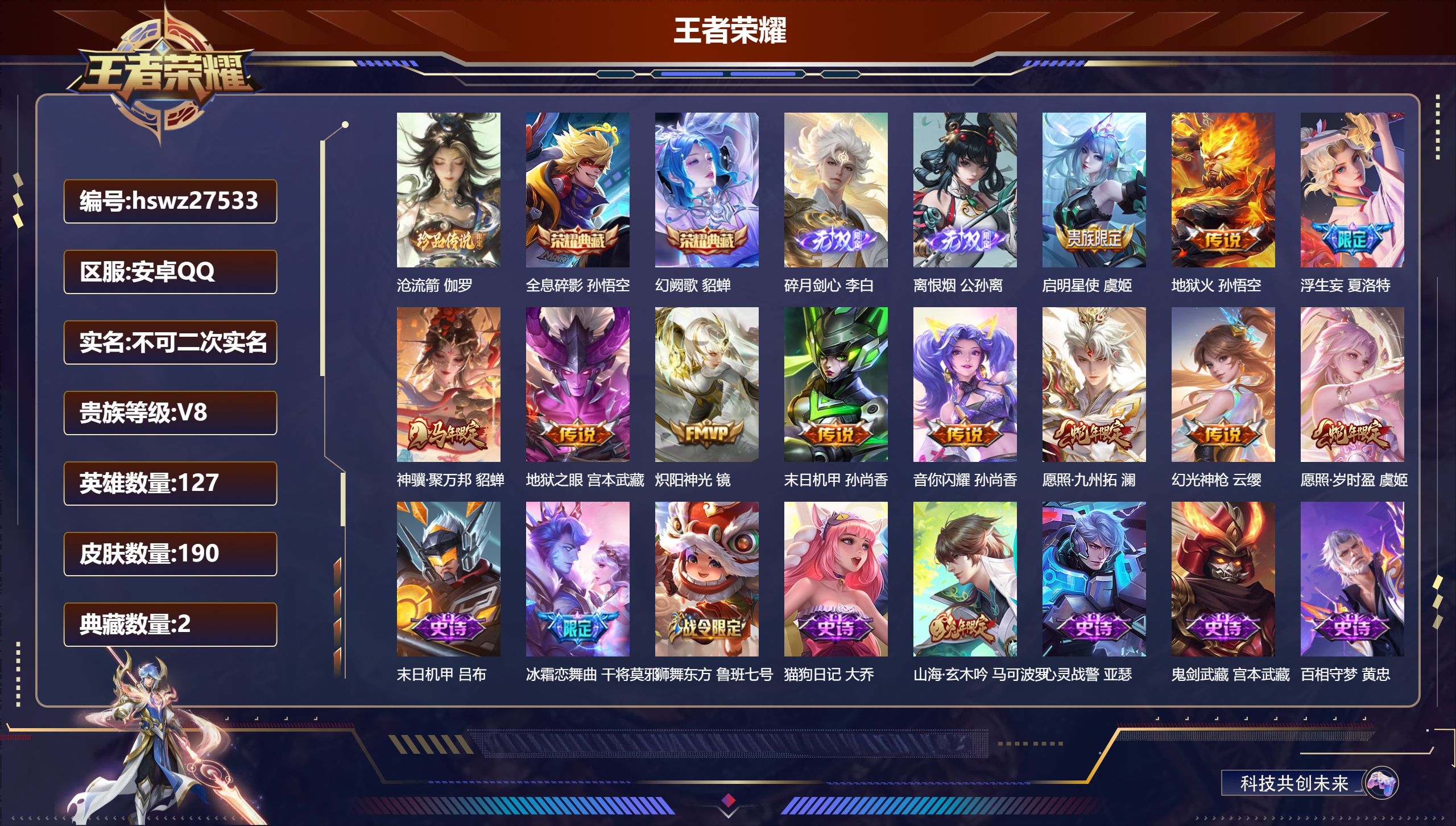 PX_2541602-Q/非凡王者/190皮肤/127英雄/2典藏/0珍品无双/2无双/1珍品传说/11传说/48史诗/8稀有英雄 【1,珍品传说】沧流箭,伽罗, 【2,典藏皮肤】全息碎影,孙悟空,幻阙歌,貂蝉, 【2,无双皮肤】碎月剑心,李白,离恨烟,公孙离, 【11,传说皮肤】启明星使,虞姬,地狱火,孙悟空,浮生妄,夏洛特,神骥·聚万邦,貂蝉,地狱之眼,宫本武藏,炽阳神光,镜,末日机甲,孙尚香,音你闪耀,孙尚香,愿照·九州拓,澜,幻光神枪,云缨,愿照·岁时盈,虞姬, 【48,史诗皮肤】末日机甲,吕布,冰霜恋舞曲,干将莫邪,狮舞东方,鲁班七号,猫狗日记,大乔,山海·玄木吟,马可波罗,心灵战警,亚瑟,鬼剑武藏,宫本武藏,百相守梦,黄忠,星夜王子,白起,线条小狗,周瑜,摇滚巨星,嬴政,魅力维加斯,妲己,黄金分割率,诸葛亮,女仆咖啡,妲己,舞动绿茵,蔡文姬,繁星吟游,蔡文姬,鹰眼统帅,狄仁杰,大圣娶亲,孙悟空,傩神司,兰陵王,李小龙,裴擒虎,光弋星穹,莱西奥,纤云弄巧,云中君,特工魅影,百里守约,逐浪之夏,李元芳,石田雨龙,后羿,魔术师,狄仁杰,龙之律动,狂铁,皇家上将,赵云,冰冠公主,雅典娜,至尊宝,孙悟空,功夫厨神,程咬金,梁祝,上官婉儿,天才门将,刘禅,水晶猎龙者,花木兰,圣诞狂欢,吕布,魅语,不知火舞,百相守梦,刘备,蔷薇恋人,孙尚香,冰雪圆舞曲,甄姬,节奏热浪,阿轲,暗夜猫娘,阿轲,乱世虎臣,张飞,线条小狗,小乔,水果甜心,孙尚香,化蝶舞,阿轲,绮世丹青,狄仁杰,幽灵船长,曹操,暗隐猎兽者,兰陵王, 【92,勇者皮肤】圆桌骑士,盾山,烛龙,曹操,沙漠行僧,达摩,拳王,达摩,大发明家,达摩,丁香结,小乔,功夫炙烤,廉颇,沉稳之力,孙尚香,幻泉雾影,海月,朔风刀,夏侯惇,醍醐杖,老夫子,汉昭烈帝,刘备,白色死神,白起,黄金武士,典韦,御旌,牛魔,阴阳师,狄仁杰,径山谋武,孙权,次元突破,哪吒,古海寻踪,张良,科学大爆炸,项羽,戏梦巡演,空空儿,功夫老勺,老夫子,海滩派对,项羽,完美运算,后羿,踏浪烽翎,莱西奥,美猴王,孙悟空,野性能量,吕布,哥特玫瑰,露娜,守护之力,大乔,潮玩探月行,猪八戒,天穹祈灯,鬼谷子,疑决卦,明世隐,化身博士,扁鹊,阿尔法小队,后羿,五福同心,张飞,幻乐之宴,鬼谷子,赤刃凌霄,敖隐,死亡骑士,亚瑟,浪漫序章,刘备,敏锐之力,李白,胡桃狂想曲,蒙犽,玩偶对对碰,安琪拉,掌控之力,诸葛亮,海滩丽影,钟无艳,落日弦歌,高渐离,忍·炎影,赵云,雪境奇遇,西施,重明,芈月,坚韧之力,苏烈,万事如意,刘备,溯影追猎,虞姬,极光幻客,蚩奼,雾都夜雨,干将莫邪,兔女郎,花木兰,龙腾万里,关羽,罗小黑战记,哪吒,往忆晖光,明世隐,荣光之誓,亚瑟,花好人间,甄姬,万象初新,宫本武藏,御銮,盾山,穷奇,典韦,教廷特使,韩信,街头霸王,韩信,西部大镖客,孙悟空,紫罗兰之誓,妲己,进击墨子号,墨子,少女阿狸,妲己,灵卜魔法,妲己,混沌棋,弈星,御霄,米莱狄,蔚蓝守将,蒙恬,幻想奇妙夜,王昭君,神迹守卫,钟馗,虚灵犬护,钟馗,御狮,狂铁,白执事,赵云,神迹守卫,孙悟空,青衿临川,桑启,天穹之誓,姜子牙,星梦巡礼,姜子牙,谧流熔炉,太乙真人,金福满堂,东皇太一,鹤鸣心笺,艾琳,云械蓝图,云中君,逆浪荇歌,甄姬,线条小狗,周瑜,线条小狗,桑启,噬灭天穹,东皇太一,灵卦秘语,少司缘,爆裂喵拳,达摩,玫蓝誓约,戈娅, 【37,其他皮肤】沧流箭,伽罗,金属狂潮,高渐离,前尘,金蝉,战争骑士,夏侯惇,芝加哥教父,黄忠,龙域领主,铠,死神来了,曹操,花见巫女,伽罗,爱与和平,苏烈,未来旅行,孙膑,万圣前夜,小乔,灼热之刃,李信,福禄兄弟,鲁班七号,帝国元帅,项羽,精灵王,后羿,绯红之刃,露娜,冰刃幻境,镜,魇语军师,司马懿,隐刃,兰陵王,花间舞,公孙离,异域舞娘,貂蝉,街头旋风,裴擒虎,修竹墨客,上官婉儿,范海辛,李白,激情绿茵,马可波罗,埃及法老,杨戬,归虚梦演,西施,阿摩司公爵,鬼谷子,画中游,桑启,战争女神,雅典娜,创世神祝,盘古,绝影神枪,百里守约,森,瑶,赤焰之缨,云缨,地府判官,钟馗,圆桌骑士,太乙真人,西部大镖客,孙悟空, 【8,稀有英雄】嬴政,不知火舞,橘右京,夏洛特,娜可露露,韩信,艾琳,赵云, 营地ID:,