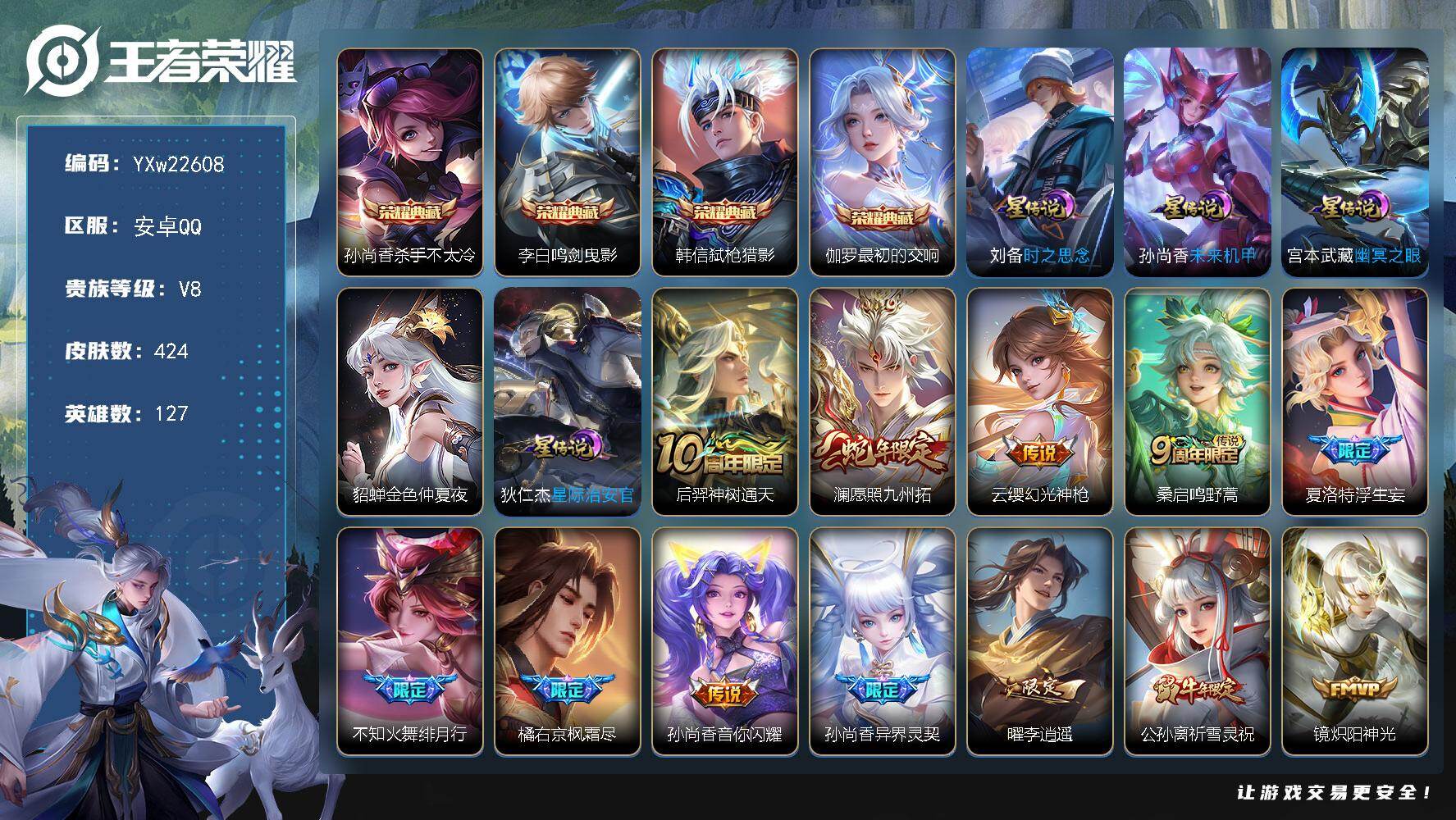 PX_2549448-??精品推荐·1w战孙尚香·杀手不太冷·鸣剑曳影·弑枪猎影·最初的交响·金色仲夏夜·星际治安官·时之思念·李逍遥·浮生妄·枫霜尽·白虎志·异界灵契·祈雪灵祝·愿照九州拓·可二次】YXw22608-安卓Q-127英雄-424皮肤-27王者印记-180铭文-7w贵族积分【贵族9】【4典藏·3星传说·25传说·1天幕·5按键】【因赛季更新游戏段付以上号为准!】 【英雄全皮】:刘禅全皮,孙权全皮,橘右京全皮,鬼谷子全皮,狂铁全皮,敖隐全皮,鲁班大师全皮,蒙恬全皮,夏洛特全皮,戈娅全皮,空空儿全皮 【荣耀典藏】:孙尚香杀手不太冷,李白鸣剑曳影,韩信弑枪猎影,伽罗最初的交响 【内测皮肤】:孙尚香蔷薇恋人,艾琳女武神,狂铁特工战影 【星元皮肤】:宫本武藏幽冥之眼,貂蝉金色仲夏夜,狄仁杰星际治安官,孙尚香未来机甲,刘备时之思念 【传说皮肤】:后羿神树通天,澜愿照九州拓,云缨幻光神枪,桑启鸣野蒿,夏洛特浮生妄,不知火舞绯月行,橘右京枫霜尽,孙尚香音你闪耀,孙尚香异界灵契,曜李逍遥,,公孙离祈雪灵祝,镜炽阳神光,虞姬启明星使,李信一念神魔,刘备时之恋人,张良黄金白羊座,干将莫邪久胜战神,达摩黄金狮子座,百里玄策白虎志,梦奇胖达荣荣,后羿黄金射手座,貂蝉仲夏夜之梦,孙尚香末日机甲,宫本武藏地狱之眼,狄仁杰超时空战士 【限定皮肤】:白起狰,姜子牙天穹之誓,狄仁杰阴阳师,虞姬凯尔特女王,赵云皇家上将,墨子神迹守卫,嬴政白昼王子,孙尚香蔷薇恋人,孙尚香异界灵契,鲁班七号狮舞东方,庄周蜃楼王,庄周高山流水,高渐离死亡摇滚,钟无艳王者之锤,钟无艳超时空战士,扁鹊炼金王,扁鹊奇幻香踪,芈月重明,芈月幻夜卜梦,吕布猎兽之王,周瑜赤莲之焰,元歌云间偶戏,元歌无心,夏侯惇朔风刀,甄姬游园惊梦,甄姬落雪兰心,曹操烛龙,典韦穷奇,典韦蓝屏警告,马可波罗逐梦之星,马可波罗暗影游猎,狄仁杰魔术师,狄仁杰万华元夜,达摩星际陆战队,达摩沙漠行僧,项羽海滩派对,老夫子醍醐杖,老夫子航海奇遇记,关羽冰锋战神,程咬金演武夺筹,韩信飞衡,王昭君午后时光,兰陵王金庭之子,不知火舞绯月行,橘右京枫霜尽,亚瑟狮心王,亚瑟潮玩骑士王,孙悟空至尊宝,孙悟空大圣娶亲,孙悟空孙行者,牛魔御旌,后羿圣弓游侠,李元芳银河之约,李元芳云中旅人,虞姬启明星使,钟馗神迹守卫,钟馗驱傩正仪,杨玉环遇见飞天,杨戬潮玩骑兵,女娲朔望之晖,干将莫邪冰霜恋舞曲,干将莫邪真爱魔法,雅典娜单词大作战,雅典娜黎明之约,蔡文姬繁星吟游,太乙真人饕餮,太乙真人华丽摇滚,鬼谷子原初探秘者,鬼谷子五谷丰年,黄忠火炮绅士,铠青龙志,苏烈千军破阵,百里玄策白虎志,百里玄策原初追逐者,弈星混沌棋,梦奇顽趣,公孙离祈雪灵祝,沈梦溪星空之诺,沈梦溪大漠名商,明世隐疑决卦,裴擒虎天狼狩猎者,裴擒虎李小龙,裴擒虎擒涛扼浪,狂铁御狮,狂铁电玩高手,米莱狄御霄,米莱狄胡桃异想国,云中君纤云弄巧,伽罗天狼溯光者,盾山御銮,猪八戒西部大镖客,上官婉儿梁祝,嫦娥拒霜思,嫦娥暖冬兔眠,曜李逍遥,,西施玲珑珍味,鲁班大师匿光启智者,鲁班大师探海日志,镜匿光追影者,桑启海盐诗旅,夏洛特浮生妄,暃星界游侠,戈娅驭风魔法,艾琳女武神,司空震地狱燃心,阿古朵江河有灵,张良古海寻踪,蒙犽百解令,蒙恬荣光圣徽,鬼谷子天穹祈灯,姬小满妄想食味,沈梦溪龙舞盛年,鲁班七号蔬乡物语,李元芳蔬乡物语,刘邦剑破天穹,刘备异域游侠,周瑜熔金海岸 【年限皮肤】:百里玄策白虎志,铠青龙志,韩信飞衡,公孙离祈雪灵祝,澜愿照九州拓 【赛季限定】:亚瑟狮心王,庄周蜃楼王,扁鹊炼金王,虞姬凯尔特女王,白起狰,太乙真人饕餮,曹操烛龙,芈月重明,典韦穷奇,狂铁御狮,米莱狄御霄,牛魔御旌,盾山御銮,夏侯惇朔风刀,弈星混沌棋,明世隐疑决卦,老夫子醍醐杖,鬼谷子原初探秘者,狄仁杰万华元夜,程咬金演武夺筹,钟馗驱傩正仪,苏烈千军破阵,达摩沙漠行僧,兰陵王金庭之子,沈梦溪大漠名商,李元芳云中旅人,桑启海盐诗旅,裴擒虎擒涛扼浪,鲁班大师探海日志,张良古海寻踪,鬼谷子天穹祈灯,刘邦剑破天穹,姜子牙天穹之誓,东皇太一噬灭天穹,太乙真人谧流熔炉,钟馗虚灵犬护,甄姬逆浪荇歌,亚瑟荣光之誓,百里玄策原初追逐者,雅典娜黎明之约,梦奇顽趣,蒙恬荣光圣徽,牛魔星界战将,项羽九幽镇关 【战令限定】:嬴政白昼王子,吕布猎兽之王,典韦蓝屏警告,女娲朔望之晖,鲁班七号狮舞东方,钟馗神迹守卫,周瑜赤莲之焰,李元芳银河之约,沈梦溪星空之诺,马可波罗暗影游猎,猪八戒西部大镖客,雅典娜单词大作战,元歌云间偶戏,亚瑟潮玩骑士王,米莱狄胡桃异想国,达摩星际陆战队,老夫子航海奇遇记,墨子神迹守卫,干将莫邪真爱魔法,后羿圣弓游侠,黄忠火炮绅士,芈月幻夜卜梦,狂铁电玩高手,王昭君午后时光,钟无艳超时空战士,甄姬落雪兰心,暃星界游侠,嫦娥暖冬兔眠,扁鹊奇幻香踪,杨戬潮玩骑兵,戈娅驭风魔法,西施玲珑珍味,司空震地狱燃心,鲁班七号蔬乡物语,李元芳蔬乡物语,刘禅鸭鸭历险记,沈梦溪鸭鸭历险记,莱西奥光弋星穹,明世隐往忆晖光,周瑜线条小狗,小乔线条小狗 【史诗皮肤】:周瑜线条小狗,小乔线条小狗,项羽九幽镇关,百里玄策罗小黑战记,莱西奥光弋星穹,公孙离涂山容容,后羿石田雨龙,扁鹊灵蛊蚀心,狂铁龙之律动,刘禅鸭鸭历险记,阿轲化蝶舞,弈星万物之道,牛魔星界战将,鲁班七号蔬乡物语,姬小满妄想食味,蒙恬