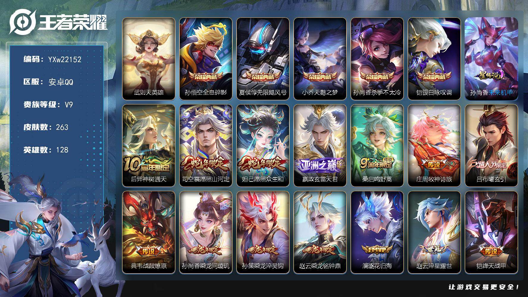 PX_2549452-??精品推荐·银白咏叹调·杀手不太冷·天鹅之梦·无限飓风号·全息碎影·武则天·武圣·白虎志·曦玄引·愿照山河定·愿照众生和·乘龙问璇玑·乘龙淬吴钩·乘龙铭钟鼎·太华·炽阳神光·可二次】YXw22152-安卓Q-128英雄-263皮肤-13王者印记-200铭文-贵族积分12w【贵族9】【6典藏·1星传说·33传说·3按键】【因赛季更新游戏段付以上号为准!】 【英雄全皮】:司空震全皮 【荣耀典藏】:武则天英雄,孙悟空全息碎影,夏侯惇无限飓风号,小乔天鹅之梦,孙尚香杀手不太冷,铠银白咏叹调 【星元皮肤】:孙尚香未来机甲 【传说皮肤】:后羿神树通天,司空震愿照山河定,妲己愿照众生和,嬴政玄雷天君,桑启鸣野蒿,庄周牧神诗旅,吕布曦玄引,典韦战鼓燎原,孙尚香乘龙问璇玑,孙策乘龙淬吴钩,赵云乘龙铭钟鼎,澜逐花归海,赵云淬星耀世,铠绛天战甲,镜炽阳神光,虞姬启明星使,关羽武圣,曜云鹰飞将,李信一念神魔,刘备时之恋人,伽罗太华,貂蝉猫影幻舞,干将莫邪久胜战神,虞姬云霓雀翎,达摩黄金狮子座,百里玄策白虎志,花木兰冠军飞将,后羿黄金射手座,孙尚香末日机甲,宫本武藏地狱之眼,孙悟空地狱火,武则天海洋之心,狄仁杰超时空战士 【限定皮肤】:狄仁杰阴阳师,赵云皇家上将,嬴政优雅恋人,孙尚香蔷薇恋人,扁鹊奇幻香踪,典韦岱宗,马可波罗暗影游猎,狄仁杰魔术师,狄仁杰万华元夜,达摩沙漠行僧,项羽海滩派对,老夫子醍醐杖,关羽武圣,兰陵王金庭之子,李元芳云中旅人,虞姬启明星使,钟馗驱傩正仪,杨戬潮玩骑兵,雅典娜单词大作战,蔡文姬繁星吟游,鬼谷子原初探秘者,黄忠烈魂,苏烈千军破阵,百里玄策白虎志,百里守约朱雀志,弈星混沌棋,梦奇顽趣,沈梦溪大漠名商,明世隐疑决卦,裴擒虎李小龙,裴擒虎擒涛扼浪,云中君纤云弄巧,伽罗太华,猪八戒西部大镖客,上官婉儿天狼绘梦者,嫦娥拒霜思,嫦娥暖冬兔眠,西施玲珑珍味,蒙犽狂想玩偶喵,鲁班大师探海日志,桑启海盐诗旅,暃星界游侠,戈娅驭风魔法,艾琳流音漫舞,司空震地狱燃心,阿古朵江河有灵,张良古海寻踪,蒙犽百解令,蒙恬荣光圣徽,高渐离燃音魔法,妲己灵卜魔法,鬼谷子天穹祈灯,安琪拉乘龙聚宝船,孙尚香乘龙问璇玑,孙策乘龙淬吴钩,赵云乘龙铭钟鼎,吕布曦玄引,沈梦溪龙舞盛年,刘邦剑破天穹 【年限皮肤】:百里玄策白虎志,百里守约朱雀志,伽罗太华,典韦岱宗,孙尚香乘龙问璇玑,孙策乘龙淬吴钩,赵云乘龙铭钟鼎,安琪拉乘龙聚宝船,司空震愿照山河定,妲己愿照众生和 【赛季限定】:弈星混沌棋,明世隐疑决卦,老夫子醍醐杖,鬼谷子原初探秘者,狄仁杰万华元夜,钟馗驱傩正仪,苏烈千军破阵,达摩沙漠行僧,兰陵王金庭之子,沈梦溪大漠名商,李元芳云中旅人,桑启海盐诗旅,裴擒虎擒涛扼浪,鲁班大师探海日志,张良古海寻踪,鬼谷子天穹祈灯,刘邦剑破天穹,东皇太一噬灭天穹,太乙真人谧流熔炉,钟馗虚灵犬护,甄姬逆浪荇歌,亚瑟荣光之誓,梦奇顽趣,蒙恬荣光圣徽,牛魔星界战将,项羽九幽镇关 【战令限定】:马可波罗暗影游猎,猪八戒西部大镖客,蒙犽狂想玩偶喵,雅典娜单词大作战,暃星界游侠,嫦娥暖冬兔眠,扁鹊奇幻香踪,杨戬潮玩骑兵,戈娅驭风魔法,西施玲珑珍味,司空震地狱燃心,艾琳流音漫舞,高渐离燃音魔法,妲己灵卜魔法,周瑜线条小狗 【史诗皮肤】:周瑜线条小狗,项羽九幽镇关,后羿石田雨龙,扁鹊灵蛊蚀心,赵怀真器灵浮梦炉,牛魔星界战将,安琪拉乘龙聚宝船,蒙恬荣光圣徽,高渐离燃音魔法,妲己灵卜魔法,蒙犽百解令,阿古朵江河有灵,司空震地狱燃心,戈娅驭风魔法,扁鹊奇幻香踪,暃星界游侠,梦奇顽趣,嫦娥拒霜思,云中君纤云弄巧,裴擒虎李小龙,蒙犽狂想玩偶喵,马可波罗暗影游猎,上官婉儿天狼绘梦者,黄忠烈魂,马超神威,橘右京修罗,不知火舞魅语,小乔青蛇,典韦岱宗,娜可露露晚萤,蔡文姬繁星吟游,狄仁杰鹰眼统帅,伽罗箭羽风息,百里守约朱雀志,大乔猫狗日记,白起星夜王子,程咬金功夫厨神,李元芳逐浪之夏,蔡文姬舞动绿茵,铠曙光守护者,百里守约特工魅影,雅典娜冰冠公主,诸葛亮黄金分割率,兰陵王暗隐猎兽者,夏侯惇乘风破浪,刘邦德古拉伯爵,花木兰水晶猎龙者,张飞乱世虎臣,李白千年之狐,曹操幽灵船长,刘禅绅士熊喵,吕布圣诞狂欢,墨子金属风暴,妲己女仆咖啡,嬴政摇滚巨星,嬴政优雅恋人,孙尚香水果甜心,孙尚香蔷薇恋人,宫本武藏鬼剑武藏,狄仁杰魔术师,王昭君偶像歌手,甄姬冰雪圆舞曲,貂蝉圣诞恋歌,赵云未来纪元,赵云皇家上将,阿轲暗夜猫娘,露娜紫霞仙子 【其他皮肤】:吕布舞狮寰,兰陵王雾影缉谜,蚩奼极光幻客,艾琳鹤鸣心笺,亚瑟荣光之誓,甄姬逆浪荇歌,张良灵野札记,钟馗虚灵犬护,明世隐景韶洛都,少司缘灵卦秘语,达摩爆裂喵拳,东皇太一金福满堂,姜子牙星梦巡礼,西施雪境奇遇,典韦铁骨偃魂,太乙真人谧流熔炉,苍苍林狼骑,吕布逐霄战戟,亚瑟动物派对,东皇太一噬灭天穹,貂蝉长夏之忆,大司命暗都幽影,刘邦剑破天穹,扁鹊无尽旅途,沈梦溪龙舞盛年,亚瑟鸿运当头,廉颇功夫炙烤,朵莉亚金色潮汐,海诺时空谍影,妲己灵卜魔法,鬼谷子天穹祈灯,程咬金暖冬絮语,后羿完美运算,亚连破局者,海月王牌新星,钟无艳聚星闪耀,张良古海寻踪,艾琳流音漫舞,李元芳妄想特派,姬小满零食大作战,西施玲珑珍味,鲁班大师探海日志,莱西奥西部游侠,太乙真人劲辣红锅,杨戬潮玩骑兵,裴擒虎擒涛扼浪,赵怀真太极少年,白起乐