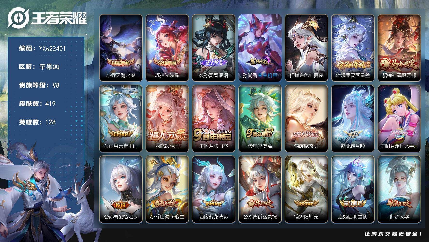 PX_2549450-??女号推荐·全皮西施·全皮少司缘·全皮公孙离·全皮嫦娥·天鹅之梦·拾光映像·离恨烟·器灵落星盏·金色仲夏夜·永恒水手月亮·祈雪灵祝·曦玄引·霜月吟·无二次包过】YXw22401-苹果Q-128英雄-419皮肤-15王者印记-210铭文-贵族积分8w【贵族8】【2典藏·1无双·1珍品·2星传说·20传说·22按键】【因赛季更新游戏段付以上号为准!】 【英雄全皮】:刘禅全皮,孙权全皮,鬼谷子全皮,公孙离全皮,嫦娥全皮,敖隐全皮,西施全皮,戈娅全皮,空空儿全皮,影全皮,少司缘全皮 【荣耀典藏】:小乔天鹅之梦,瑶拾光映像 【无双皮肤】:公孙离离恨烟 【珍品传说】:嫦娥器灵落星盏 【星元皮肤】:孙尚香未来机甲,貂蝉金色仲夏夜 【传说皮肤】:貂蝉神骥聚万邦,公孙离云诺千山,西施续相思,王昭君映山客,桑启鸣野蒿,貂蝉曦玄引,露娜霜月吟,王昭君永恒水手月亮,公孙离记忆之芯,小乔山海琳琅生,西施游龙清影,公孙离祈雪灵祝,镜炽阳神光,虞姬启明星使,伽罗太华,干将莫邪久胜战神,梦奇胖达荣荣,貂蝉仲夏夜之梦,李白凤求凰,孙尚香末日机甲 【限定皮肤】:公孙离离恨烟,暃埋骨钱,蒙犽顽岩魄,蔡文姬夏日便利店,大乔绒语心约,虞姬夏日便利店,姜子牙天穹之誓,杨戬破阵退雄兵,狄仁杰阴阳师,小乔山海琳琅生,赵云皇家上将,妲己时之彼端,孙尚香蔷薇恋人,鲁班七号狮舞东方,庄周玄嵩,扁鹊奇幻香踪,元歌无心,夏侯惇朔风刀,马可波罗暗影游猎,马可波罗山海玄木吟,狄仁杰魔术师,狄仁杰万华元夜,达摩沙漠行僧,项羽海滩派对,老夫子醍醐杖,貂蝉逐梦之音,安琪拉魔法小厨娘,程咬金演武夺筹,王昭君午后时光,兰陵王金庭之子,李元芳银河之约,李元芳云中旅人,虞姬霸王别姬,虞姬启明星使,钟馗神迹守卫,钟馗驱傩正仪,杨玉环遇见飞天,杨玉环寅虎心曲,杨戬潮玩骑兵,女娲朔望之晖,雅典娜黎明之约,蔡文姬繁星吟游,鬼谷子原初探秘者,鬼谷子五谷丰年,苏烈千军破阵,百里玄策原初追逐者,弈星混沌棋,梦奇顽趣,公孙离蜜橘之夏,公孙离祈雪灵祝,公孙离玉兔公主,沈梦溪星空之诺,沈梦溪大漠名商,明世隐疑决卦,裴擒虎李小龙,裴擒虎擒涛扼浪,瑶山海碧波行,云中君纤云弄巧,伽罗太华,猪八戒西部大镖客,上官婉儿天狼绘梦者,嫦娥如梦令,嫦娥拒霜思,嫦娥暖冬兔眠,西施玲珑珍味,西施至美乘鲤谣,鲁班大师探海日志,桑启海盐诗旅,暃星界游侠,戈娅驭风魔法,艾琳女武神,艾琳流音漫舞,司空震地狱燃心,阿古朵江河有灵,张良古海寻踪,王昭君永恒水手月亮,蒙犽百解令,蒙恬荣光圣徽,高渐离燃音魔法,妲己灵卜魔法,鬼谷子天穹祈灯,伽罗琥珀纪元,姬小满妄想食味,貂蝉曦玄引,沈梦溪龙舞盛年,鲁班七号蔬乡物语,李元芳蔬乡物语,刘邦剑破天穹,程咬金群星魔术团,镜青焰无极,项羽苍威无极,刘备异域游侠,芈月浮光幕影,周瑜熔金海岸 【年限皮肤】:李白凤求凰,庄周玄嵩,伽罗太华,公孙离祈雪灵祝,杨玉环寅虎心曲,小乔山海琳琅生,瑶山海碧波行,马可波罗山海玄木吟 【赛季限定】:夏侯惇朔风刀,弈星混沌棋,明世隐疑决卦,老夫子醍醐杖,鬼谷子原初探秘者,狄仁杰万华元夜,程咬金演武夺筹,钟馗驱傩正仪,苏烈千军破阵,达摩沙漠行僧,兰陵王金庭之子,沈梦溪大漠名商,李元芳云中旅人,桑启海盐诗旅,裴擒虎擒涛扼浪,鲁班大师探海日志,张良古海寻踪,鬼谷子天穹祈灯,刘邦剑破天穹,姜子牙天穹之誓,东皇太一噬灭天穹,太乙真人谧流熔炉,钟馗虚灵犬护,甄姬逆浪荇歌,亚瑟荣光之誓,百里玄策原初追逐者,雅典娜黎明之约,梦奇顽趣,蒙恬荣光圣徽,牛魔星界战将 【战令限定】:女娲朔望之晖,鲁班七号狮舞东方,钟馗神迹守卫,李元芳银河之约,沈梦溪星空之诺,马可波罗暗影游猎,猪八戒西部大镖客,王昭君午后时光,暃星界游侠,嫦娥暖冬兔眠,扁鹊奇幻香踪,杨戬潮玩骑兵,戈娅驭风魔法,西施玲珑珍味,司空震地狱燃心,艾琳流音漫舞,高渐离燃音魔法,妲己灵卜魔法,鲁班七号蔬乡物语,李元芳蔬乡物语,镜青焰无极,项羽苍威无极,蔡文姬夏日便利店,虞姬夏日便利店,亚连破空之剑,孙悟空神迹守卫,孙膑茶境仙,马超访茗客,刘禅鸭鸭历险记,沈梦溪鸭鸭历险记,周瑜百相守梦,孙策百相守梦,莱西奥光弋星穹,明世隐往忆晖光,周瑜线条小狗,小乔线条小狗 【史诗皮肤】:上官婉儿春霖将至,明世隐百晓客,周瑜线条小狗,小乔线条小狗,少司缘巫礼祀神,女娲万灵启世,莱西奥光弋星穹,公孙离涂山容容,西施织梦人,朵莉亚幻珠鲛人,黄忠百相守梦,周瑜百相守梦,后羿石田雨龙,扁鹊灵蛊蚀心,狂铁龙之律动,刘禅鸭鸭历险记,阿轲化蝶舞,赵怀真器灵浮梦炉,弈星万物之道,孙膑茶境仙,牛魔星界战将,艾琳陌上桑,亚连破空之剑,姬小满战舞者,大司命东方月初,少司缘涂山红红,暃埋骨钱,蒙犽顽岩魄,蔡文姬夏日便利店,芈月浮光幕影,黄忠怒海争锋,镜青焰无极,鲁班七号蔬乡物语,姬小满妄想食味,伽罗琥珀纪元,蒙恬荣光圣徽,高渐离燃音魔法,妲己灵卜魔法,蒙犽百解令,西施至美乘鲤谣,阿古朵江河有灵,司空震地狱燃心,百里守约真我赫兹,戈娅驭风魔法,刘禅电玩爆裂旋风,扁鹊奇幻香踪,杨玉环银翎春语,瑶山海碧波行,马可波罗山海玄木吟,暃星界游侠,梦奇顽趣,元歌无心,鬼谷子五谷丰年,弈星滕王阁序,貂蝉唤灵魅影,公孙离玉兔公主,杨玉环寅虎心曲,雅典娜黎明之约,嫦娥拒霜思,钟馗乐园奇幻夜,杨戬天秀启明,西施诗语江南,云中君纤云弄巧,裴擒