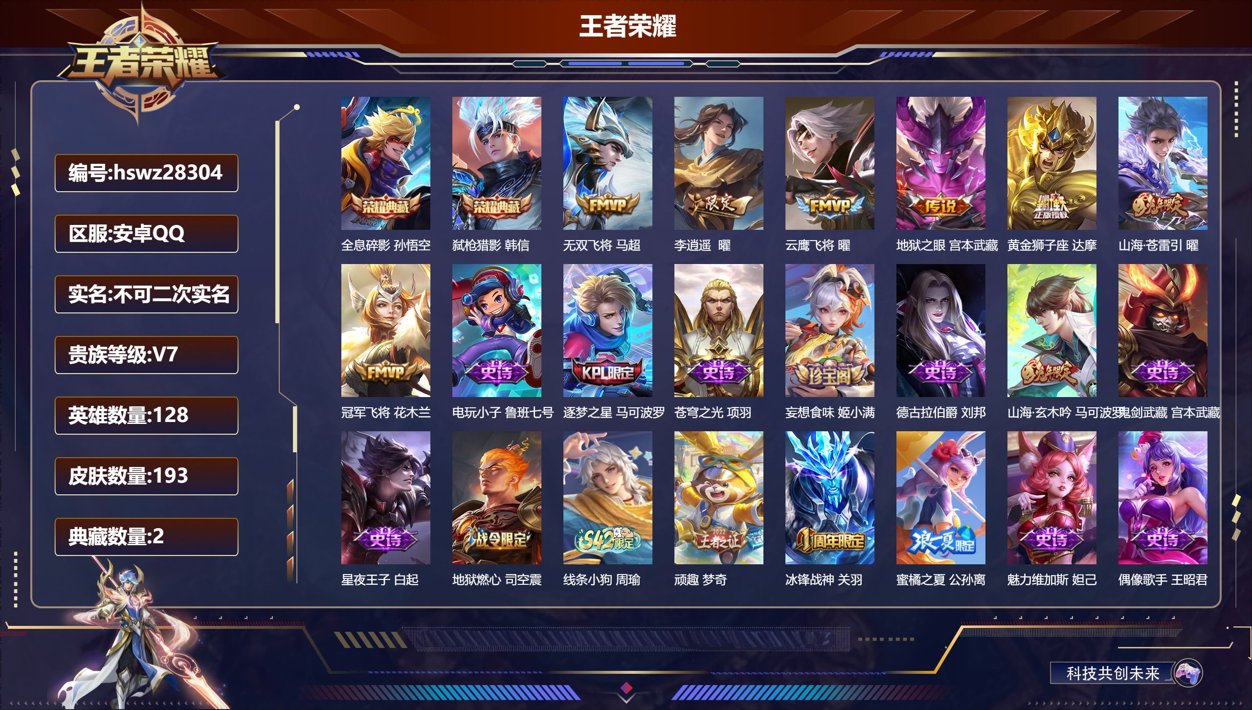 PX_2558126-Q/最强王者/193皮肤/128英雄/2典藏/0珍品无双/0无双/0珍品传说/7传说/58史诗/8稀有英雄 【2,典藏皮肤】全息碎影,孙悟空,弑枪猎影,韩信, 【7,传说皮肤】无双飞将,马超,李逍遥,,曜,云鹰飞将,曜,地狱之眼,宫本武藏,黄金狮子座,达摩,山海·苍雷引,曜,冠军飞将,花木兰, 【58,史诗皮肤】电玩小子,鲁班七号,逐梦之星,马可波罗,苍穹之光,项羽,妄想食味,姬小满,德古拉伯爵,刘邦,山海·玄木吟,马可波罗,鬼剑武藏,宫本武藏,星夜王子,白起,地狱燃心,司空震,线条小狗,周瑜,顽趣,梦奇,冰锋战神,关羽,蜜橘之夏,公孙离,魅力维加斯,妲己,偶像歌手,王昭君,梅西,裴擒虎,荣光圣徽,蒙恬,女仆咖啡,妲己,逐梦之音,貂蝉,暗夜贵公子,嬴政,鹰眼统帅,狄仁杰,大圣娶亲,孙悟空,李小龙,裴擒虎,驯魔猎人,兰陵王,龙骑士,墨子,特工魅影,百里守约,猫狗日记,孙策,原初追逐者,百里玄策,逐浪之夏,李元芳,未来纪元,赵云,黎明之约,雅典娜,魔术师,狄仁杰,皇家上将,赵云,冰冠公主,雅典娜,至尊宝,孙悟空,功夫厨神,程咬金,梁祝,上官婉儿,电玩·爆裂旋风,刘禅,水晶猎龙者,花木兰,御风骁将,吕布,圣诞狂欢,吕布,白龙吟,韩信,地狱岩魂,廉颇,蔷薇恋人,孙尚香,冰雪圆舞曲,甄姬,航海奇遇记,老夫子,千年之狐,李白,暗夜猫娘,阿轲,游园惊梦,甄姬,曙光守护者,铠,万灵启世,女娲,心灵骇客,安琪拉,乱世虎臣,张飞,真我赫兹,镜,水果甜心,孙尚香,江河有灵,阿古朵,幽灵船长,曹操,乘风破浪,夏侯惇, 【84,勇者皮肤】圆桌骑士,盾山,烛龙,曹操,爱心护理,阿轲,缤纷绘卷,张良,纽约教父,刘备,拳王,达摩,大发明家,达摩,丁香结,小乔,朔风刀,夏侯惇,醍醐杖,老夫子,汉昭烈帝,刘备,黑桃队长,鲁班七号,黄金武士,典韦,御旌,牛魔,阴阳师,狄仁杰,炼金王,扁鹊,径山谋武,孙权,致命风华,阿轲,次元突破,哪吒,古海寻踪,张良,鲨炮海盗猫,沈梦溪,海滩派对,项羽,完美运算,后羿,万华元夜,狄仁杰,无尽征程,廉颇,演武夺筹,程咬金,野性能量,吕布,瓷语鉴心,露娜,原初探秘者,鬼谷子,潮玩探月行,猪八戒,天穹祈灯,鬼谷子,疑决卦,明世隐,化身博士,扁鹊,五福同心,张飞,霸王丸,宫本武藏,救世之瞳,扁鹊,赤莲之焰,周瑜,死亡骑士,亚瑟,敏锐之力,李白,破局者,亚连,掌控之力,诸葛亮,海滩丽影,钟无艳,忍·炎影,赵云,狰,白起,重明,芈月,炽热元素使,姜子牙,擒涛扼浪,裴擒虎,乓乓大师,鲁班大师,溯影追猎,虞姬,妖精王,孙膑,极光幻客,蚩奼,探海日志,鲁班大师,天使之翼,孙膑,龙腾万里,关羽,流音漫舞,艾琳,未来纪元,宫本武藏,零食大作战,姬小满,荣光之誓,亚瑟,万象初新,宫本武藏,聚星闪耀,钟无艳,御銮,盾山,穷奇,典韦,教廷特使,韩信,黑猫爱糖果,李元芳,妄想特派,李元芳,西部大镖客,孙悟空,神迹守卫,墨子,凯尔特女王,虞姬,少女阿狸,妲己,混沌棋,弈星,御霄,米莱狄,蔚蓝守将,蒙恬,布丁狗之约,阿古朵,命运加冕,露娜,驱傩正仪,钟馗,特工战影,狂铁,虚灵犬护,钟馗,御狮,狂铁,饕餮,太乙真人,劲辣红锅,太乙真人,星梦巡礼,姜子牙,鹤鸣心笺,艾琳,逆浪荇歌,甄姬,线条小狗,周瑜, 【44,其他皮肤】伊势巫女,大乔,前尘,金蝉,战争骑士,夏侯惇,三太子,哪吒,棒球奇才,沈梦溪,极冰防御线,盾山,龙域领主,铠,生化警戒,钟无艳,死神来了,曹操,花见巫女,伽罗,爱与和平,苏烈,第七人偶,干将莫邪,灼热之刃,李信,火炮千金,孙尚香,福禄兄弟,鲁班七号,绯红之刃,露娜,碧珀绯影,暃,星航指挥官,诸葛亮,英喵野望,刘禅,午夜歌剧院,元歌,启蛰,司空震,隐刃,兰陵王,街头旋风,裴擒虎,剑舞者,花木兰,激情绿茵,马可波罗,埃及法老,杨戬,阿摩司公爵,鬼谷子,画中游,桑启,年年有余,猪八戒,锦衣卫,狄仁杰,一千零一夜,张良,归虚梦演,曜,华尔街大亨,程咬金,幸存者,马超,荷鲁斯之眼,云中君,创世神祝,盘古,绝影神枪,百里守约,孤猎,澜,赤焰之缨,云缨,露花倒影,嫦娥,地府判官,钟馗,天启骑士,关羽,圆桌骑士,太乙真人,西部大镖客,孙悟空, 【8,稀有英雄】嬴政,不知火舞,橘右京,夏洛特,娜可露露,韩信,艾琳,赵云, 营地ID:,