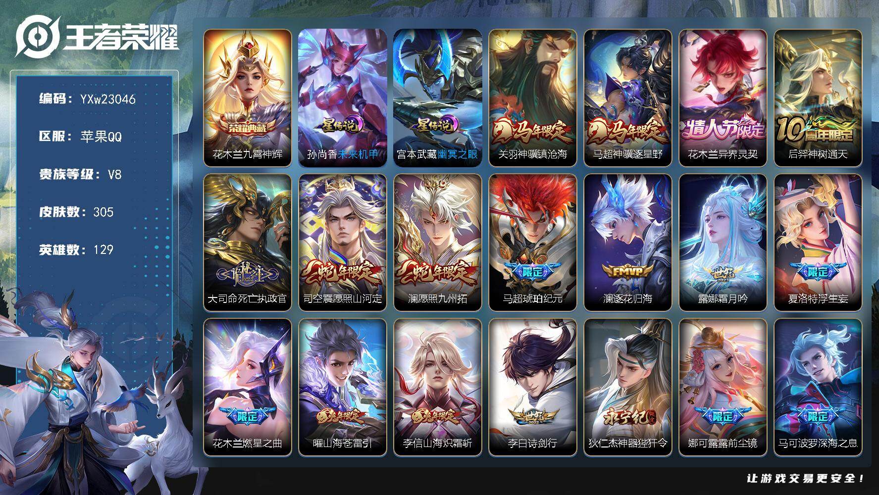PX_2549623-??推荐·九霄神辉·神骥镇沧海·神骥逐星野·花木兰异界灵契·死亡执政官·愿照山河定·愿照九州拓·马超琥珀纪元·李逍遥·寅虎赤拳·燃星之曲·深海之息·神器狴犴令·白虎志·浮生妄·无二次包过】YXw23046-苹果Q-129英雄-305皮肤-5王者印记-300铭文-贵族积分8w【贵族8】【1典藏·2星传说·32传说·1天幕·15按键】【因赛季更新游戏段付以上号为准!】 【英雄全皮】:孙权全皮,娜可露露全皮,马超全皮,敖隐全皮,夏洛特全皮,司空震全皮,影全皮 【荣耀典藏】:花木兰九霄神辉 【星元皮肤】:孙尚香未来机甲,宫本武藏幽冥之眼 【天幕】:共赏芳华天幕 【传说皮肤】:关羽神骥镇沧海,马超神骥逐星野,花木兰异界灵契,后羿神树通天,大司命死亡执政官,司空震愿照山河定,澜愿照九州拓,马超琥珀纪元,澜逐花归海,露娜霜月吟,夏洛特浮生妄,花木兰燃星之曲,曜山海苍雷引,李信山海炽霜斩,李白诗剑行,狄仁杰神器狴犴令,娜可露露前尘镜,马可波罗深海之息,马超无双飞将,裴擒虎寅虎赤拳,曜李逍遥,,镜炽阳神光,虞姬启明星使,曜云鹰飞将,李信一念神魔,刘备时之恋人,百里玄策白虎志,花木兰冠军飞将,貂蝉仲夏夜之梦,孙尚香末日机甲,宫本武藏地狱之眼,狄仁杰超时空战士 【限定皮肤】:狄仁杰阴阳师,赵云皇家上将,赵云引擎之心,墨子神迹守卫,嬴政优雅恋人,孙尚香蔷薇恋人,庄周高山流水,高渐离玩趣恶龙,钟无艳超时空战士,扁鹊奇幻香踪,白起夜都怪侠,芈月幻夜卜梦,吕布御风骁将,元歌无心,甄姬落雪兰心,典韦岱宗,马可波罗深海之息,马可波罗山海玄木吟,狄仁杰魔术师,狄仁杰万华元夜,狄仁杰神器狴犴令,达摩星际陆战队,达摩沙漠行僧,项羽海滩派对,老夫子醍醐杖,老夫子航海奇遇记,程咬金演武夺筹,韩信傲雪梅枪,王昭君午后时光,兰陵王金庭之子,花木兰燃星之曲,娜可露露前尘镜,孙悟空孙行者,后羿圣弓游侠,李元芳云中旅人,虞姬启明星使,钟馗驱傩正仪,杨戬潮玩骑兵,干将莫邪真爱魔法,雅典娜单词大作战,鬼谷子原初探秘者,鬼谷子五谷丰年,黄忠火炮绅士,苏烈千军破阵,百里玄策白虎志,弈星混沌棋,沈梦溪大漠名商,明世隐疑决卦,明世隐吟游魔法,裴擒虎天狼狩猎者,裴擒虎李小龙,裴擒虎寅虎赤拳,裴擒虎擒涛扼浪,狂铁电玩高手,米莱狄胡桃异想国,云中君纤云弄巧,李信山海炽霜斩,上官婉儿梁祝,上官婉儿神器万象笔,嫦娥拒霜思,嫦娥暖冬兔眠,曜李逍遥,,曜山海苍雷引,西施玲珑珍味,蒙犽狂想玩偶喵,鲁班大师探海日志,桑启海盐诗旅,夏洛特浮生妄,暃星界游侠,戈娅驭风魔法,艾琳流音漫舞,司空震地狱燃心,阿古朵江河有灵,张良古海寻踪,蒙犽百解令,高渐离燃音魔法,妲己灵卜魔法,鬼谷子天穹祈灯,马超琥珀纪元,鲁班七号蔬乡物语,李元芳蔬乡物语,刘邦剑破天穹 【年限皮肤】:百里玄策白虎志,典韦岱宗,吕布御风骁将,裴擒虎寅虎赤拳,曜山海苍雷引,李信山海炽霜斩,马可波罗山海玄木吟,司空震愿照山河定,澜愿照九州拓 【赛季限定】:弈星混沌棋,明世隐疑决卦,老夫子醍醐杖,鬼谷子原初探秘者,狄仁杰万华元夜,程咬金演武夺筹,钟馗驱傩正仪,苏烈千军破阵,达摩沙漠行僧,兰陵王金庭之子,沈梦溪大漠名商,李元芳云中旅人,桑启海盐诗旅,裴擒虎擒涛扼浪,鲁班大师探海日志,张良古海寻踪,鬼谷子天穹祈灯,刘邦剑破天穹,太乙真人谧流熔炉,甄姬逆浪荇歌,亚瑟荣光之誓 【战令限定】:蒙犽狂想玩偶喵,雅典娜单词大作战,米莱狄胡桃异想国,达摩星际陆战队,老夫子航海奇遇记,墨子神迹守卫,干将莫邪真爱魔法,后羿圣弓游侠,黄忠火炮绅士,芈月幻夜卜梦,明世隐吟游魔法,白起夜都怪侠,狂铁电玩高手,王昭君午后时光,钟无艳超时空战士,甄姬落雪兰心,暃星界游侠,嫦娥暖冬兔眠,扁鹊奇幻香踪,杨戬潮玩骑兵,戈娅驭风魔法,西施玲珑珍味,司空震地狱燃心,艾琳流音漫舞,高渐离燃音魔法,妲己灵卜魔法,鲁班七号蔬乡物语,李元芳蔬乡物语,廉颇撼地雄心,孙膑茶境仙,马超访茗客,周瑜线条小狗,小乔线条小狗 【史诗皮肤】:明世隐百晓客,盘古撼世英歌,周瑜线条小狗,小乔线条小狗,女娲万灵启世,后羿石田雨龙,狂铁龙之律动,赵怀真器灵浮梦炉,孙膑茶境仙,廉颇撼地雄心,鲁班七号蔬乡物语,高渐离燃音魔法,妲己灵卜魔法,蒙犽百解令,阿古朵江河有灵,司空震地狱燃心,戈娅驭风魔法,刘禅电玩爆裂旋风,扁鹊奇幻香踪,马可波罗山海玄木吟,暃星界游侠,元歌无心,上官婉儿神器万象笔,鬼谷子五谷丰年,钟无艳超时空战士,狂铁电玩高手,高渐离天秀音浪,明世隐吟游魔法,澜赏金猎手,夏洛特永昼,韩信傲雪梅枪,黄忠火炮绅士,嫦娥拒霜思,司马懿暗渊魔法,庄周高山流水,孙悟空孙行者,钟馗乐园奇幻夜,干将莫邪真爱魔法,老夫子航海奇遇记,米莱狄胡桃异想国,吕布御风骁将,云中君纤云弄巧,裴擒虎李小龙,蒙犽狂想玩偶喵,马超神威,橘右京修罗,不知火舞魅语,小乔青蛇,典韦岱宗,娜可露露晚萤,上官婉儿梁祝,狄仁杰鹰眼统帅,裴擒虎天狼狩猎者,大乔猫狗日记,孙策猫狗日记,阿轲节奏热浪,白起星夜王子,程咬金功夫厨神,李元芳逐浪之夏,刘禅天才门将,铠曙光守护者,百里守约特工魅影,雅典娜冰冠公主,亚瑟心灵战警,诸葛亮黄金分割率,兰陵王暗隐猎兽者,刘邦德古拉伯爵,花木兰水晶猎龙者,赵云引擎之心,韩信白龙吟,张飞乱世虎臣,吕布末日机甲,李白千年之狐,曹操幽灵船长,吕布圣诞狂欢,墨子金