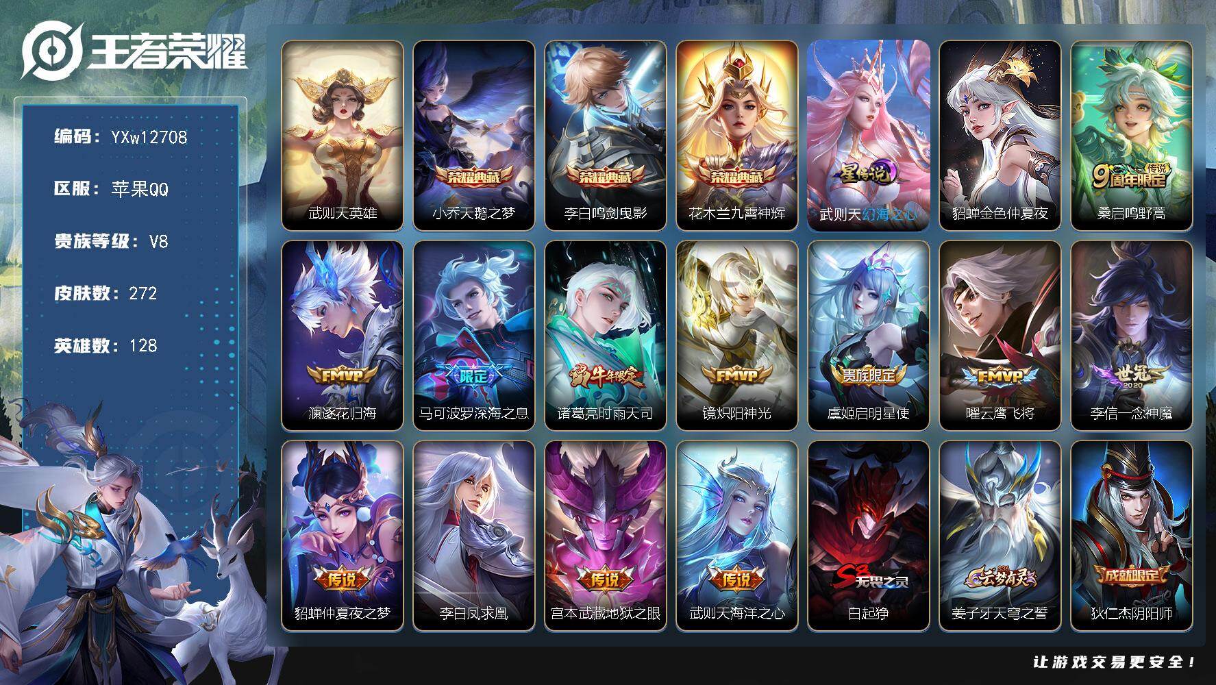 PX_2542371-【孙权全皮,朵莉亚全皮,瑶全皮,敖隐全皮,西施全皮,空空儿全皮,影全皮,少司缘全皮,】实名:,可修改,贵族等级:,V8,英雄数:,128,皮肤数:,344,荣耀水晶:,天鹅之梦,拾光映像,无双皮:,真我赫兹(瑶),小乔时之魔女,珍品传说:,大耳狗之梦,星传说:,时之愿境,未来机甲,金色仲夏夜,传说皮:,冠军飞将,猫影幻舞,末日机甲-孙尚香,仲夏夜之梦,游龙清影,遇见胡旋,山海·琳琅生,永恒水手月亮,朵莉亚心动手记,续相思,神树通天,神骥·鸣幻洲,限定皮:,遇见飞天,李小龙,白鹤梁神女,白晶晶,天狼溯光者,蜜橘之夏,时之彼端,奇迹圣诞,天狼运算者,热情桑巴,天狼绘梦者,如梦令-嫦娥,一生所爱,默契交锋-花木兰,霸王别姬-虞姬,高山流水,孙行者,匿光追影者,时之祈愿-瑶,五谷丰年,山海·碧波行,至美·化雀舞,至美·乘鲤谣,鸣野蒿,愿照·众生和
