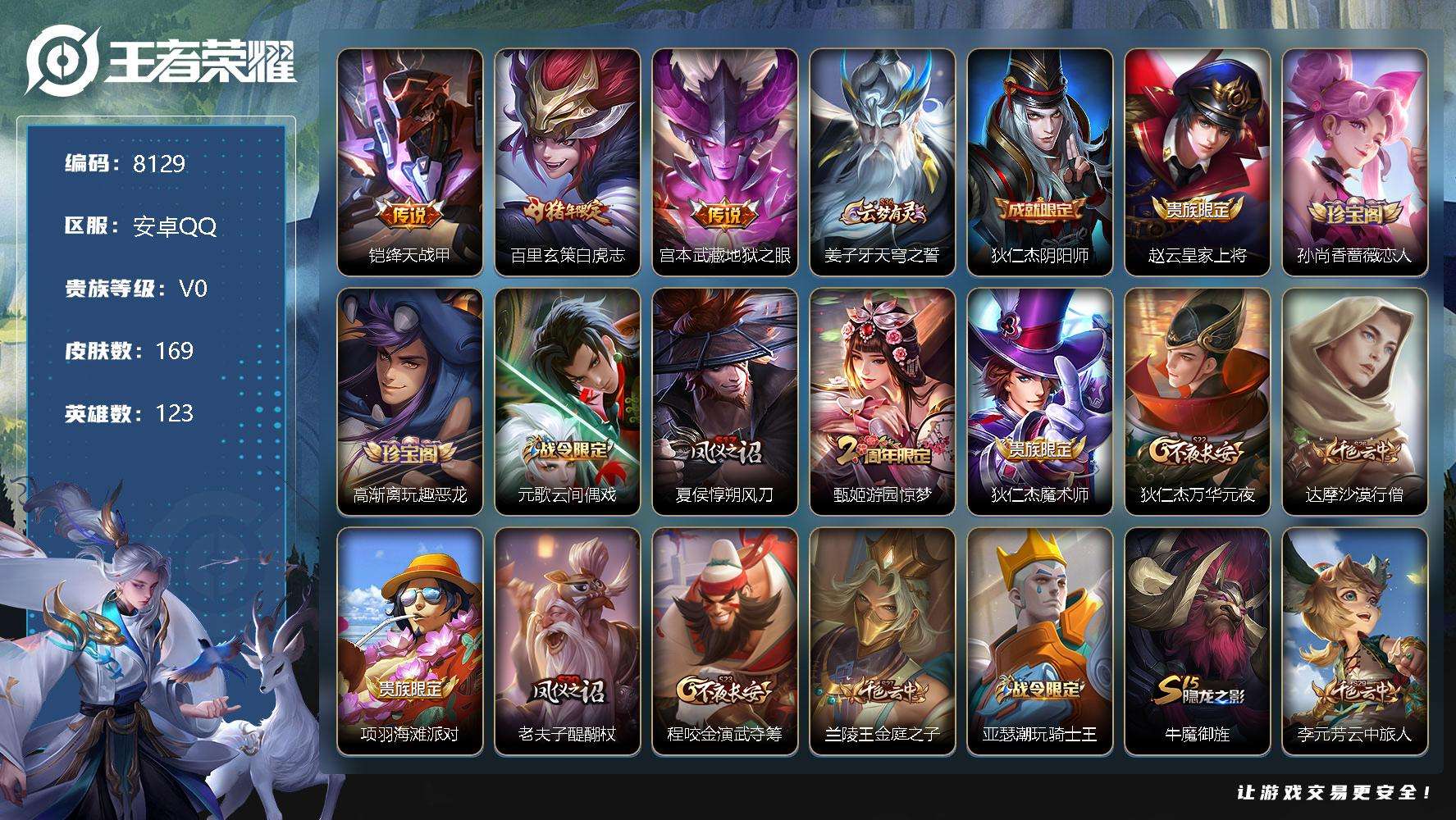 PX_2558480-实名:,不可修改,贵族等级:,V7,英雄数:,128,皮肤数:,169,荣耀水晶:,无限飓风号,珍品传说:,大耳狗之梦,朽木白哉,黑崎一护,传说皮:,黄金白羊座,一念神魔,地狱火,乞巧织情,时之恋人-刘备,淬星耀世,妄想实况,神树通天,限定皮:,李小龙,御风骁将,岱宗,天狼溯光者,高山流水,至美·化雀舞,亮点:,【精品号手慢无】贵7性价比号,33级收藏家,822星币,6鲜花,12个性按键,2夺宝,无限飓风号,大耳狗之梦,朽木白哉,黑崎一护,黄金白羊座,一念神魔,地狱火,乞巧织情,时之恋人-刘备,淬星耀世,妄想实况,神树通天