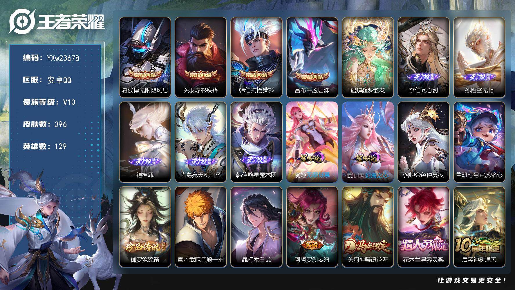PX_2558661-??V10·差3182积分到无双贵族·4典藏·1珍品无双·5无双·3珍品·4星传说·51传说·19年限·29按键·172个性戳戳·李信全皮·满狗年限定·满兔年限定·馥梦繁花·寅虎焰心·无限倾慕·幻海之心·神骥镇沧海·花木兰异界灵契·千山共赴·九山相柳·愿照九州拓·落雪白狼·乘龙铭钟鼎·遇见神鼓·马可波罗妄想实况·浮生妄·燃星之曲·虞姬无限倾心·齐天大圣·深海之息·寅虎赤拳·寅虎瑞焰·时雨天司·白虎志·永曜之星·谪仙醉月·天魔缭乱·凤求凰·乘龙聚宝船·至尊宝·黑崎一护天幕·可二次】YXw23678-安卓Q-129英雄-396皮肤-19王者印记-180铭文-贵族积分24w【贵族10】【4典藏·1珍品无双·5无双·3珍品·4星传说·51传说·1天幕·29按键·172个性戳戳】【因赛季更新游戏段付以上号为准!】 【英雄全皮】:孙权全皮,苍全皮,李信全皮,敖隐全皮,蒙恬全皮,夏洛特全皮,空空儿全皮,海诺全皮 【荣耀典藏】:夏侯惇无限飓风号,关羽赤影疾锋,韩信弑枪猎影,吕布千魇归渊 【珍品无双】:貂蝉馥梦繁花 【无双皮肤】:李信问心剑,孙悟空无相,铠神罪,诸葛亮天机白泽,韩信群星魔术团 【珍品传说】:伽罗沧流箭,宫本武藏黑崎一护,暃朽木白哉 【星元皮肤】:鲁班七号寅虎焰心,虞姬无限倾慕,武则天幻海之心,貂蝉金色仲夏夜 【天幕】:黑崎一护天幕 【传说皮肤】:阿轲罗刹妄海,关羽神骥镇沧海,花木兰异界灵契,后羿神树通天,干将莫邪千山共赴,司马懿九山相柳,公孙离云诺千山,澜愿照九州拓,云缨幻光神枪,桑启鸣野蒿,亚连落雪白狼,典韦战鼓燎原,赵云乘龙铭钟鼎,艾琳觅芳踪,露娜霜月吟,吕布遇见神鼓,马可波罗妄想实况,东皇太一灼幽烈阳,夏洛特浮生妄,花木兰燃星之曲,虞姬无限倾心,孙悟空齐天大圣,小乔山海琳琅生,曜山海苍雷引,李信山海炽霜斩,吕布怒海麟威,李白诗剑行,孙尚香音你闪耀,马可波罗深海之息,马超无双飞将,裴擒虎寅虎赤拳,鲁班七号寅虎瑞焰,赵云淬星耀世,诸葛亮时雨天司,铠绛天战甲,镜炽阳神光,虞姬启明星使,孙悟空零号赤焰,曜云鹰飞将,李信一念神魔,张良黄金白羊座,干将莫邪久胜战神,百里玄策白虎志,后羿黄金射手座,杨戬永曜之星,貂蝉仲夏夜之梦,李白凤求凰,孙尚香末日机甲,宫本武藏地狱之眼,吕布天魔缭乱,武则天海洋之心 【限定皮肤】:蔡文姬夏日便利店,虞姬夏日便利店,姜子牙天穹之誓,杨戬破阵退雄兵,李白谪仙醉月,狄仁杰阴阳师,小乔山海琳琅生,赵云皇家上将,赵云引擎之心,墨子神迹守卫,妲己时之彼端,妲己时之奇旅,嬴政优雅恋人,孙尚香蔷薇恋人,鲁班七号寅虎瑞焰,庄周高山流水,高渐离玩趣恶龙,扁鹊奇幻香踪,白起夜都怪侠,芈月幻夜卜梦,吕布天魔缭乱,吕布御风骁将,吕布遇见神鼓,元歌无心,马可波罗逐梦之星,马可波罗深海之息,马可波罗山海玄木吟,马可波罗妄想实况,狄仁杰魔术师,狄仁杰万华元夜,达摩沙漠行僧,项羽海滩派对,老夫子醍醐杖,关羽百相守梦,程咬金演武夺筹,露娜一生所爱,韩信逐梦之影,韩信飞衡,韩信傲雪梅枪,王昭君午后时光,兰陵王金庭之子,花木兰燃星之曲,亚瑟潮玩骑士王,孙悟空美猴王,孙悟空至尊宝,孙悟空大圣娶亲,孙悟空零号赤焰,孙悟空孙行者,孙悟空齐天大圣,牛魔御旌,后羿辉光之辰,李元芳云中旅人,虞姬启明星使,虞姬无限倾心,钟馗驱傩正仪,杨玉环寅虎心曲,杨戬永曜之星,杨戬潮玩骑兵,干将莫邪冰霜恋舞曲,雅典娜单词大作战,雅典娜黎明之约,鬼谷子原初探秘者,鬼谷子五谷丰年,诸葛亮时雨天司,黄忠火炮绅士,苏烈千军破阵,百里玄策白虎志,百里玄策原初追逐者,梦奇顽趣,沈梦溪大漠名商,沈梦溪匿光破解者,明世隐疑决卦,明世隐吟游魔法,裴擒虎李小龙,裴擒虎寅虎赤拳,裴擒虎擒涛扼浪,狂铁电玩高手,瑶山海碧波行,云中君纤云弄巧,云中君时之祈愿,李信山海炽霜斩,猪八戒猪悟能,上官婉儿梁祝,嫦娥暖冬兔眠,曜山海苍雷引,西施玲珑珍味,蒙犽狂想玩偶喵,鲁班大师探海日志,桑启海盐诗旅,夏洛特浮生妄,暃星界游侠,戈娅驭风魔法,艾琳流音漫舞,司空震地狱燃心,阿古朵江河有灵,张良古海寻踪,艾琳觅芳踪,蒙恬荣光圣徽,妲己灵卜魔法,鬼谷子天穹祈灯,伽罗琥珀纪元,安琪拉乘龙聚宝船,赵云乘龙铭钟鼎,亚连落雪白狼,沈梦溪龙舞盛年,李元芳蔬乡物语,刘邦剑破天穹,韩信群星魔术团,关羽决胜骁骑,镜青焰无极,项羽苍威无极,海诺心动手记,周瑜熔金海岸 【年限皮肤】:孙悟空美猴王,李白凤求凰,杨戬永曜之星,后羿辉光之辰,百里玄策白虎志,韩信飞衡,诸葛亮时雨天司,吕布御风骁将,裴擒虎寅虎赤拳,鲁班七号寅虎瑞焰,杨玉环寅虎心曲,小乔山海琳琅生,曜山海苍雷引,李信山海炽霜斩,瑶山海碧波行,马可波罗山海玄木吟,赵云乘龙铭钟鼎,安琪拉乘龙聚宝船,澜愿照九州拓 【赛季限定】:牛魔御旌,明世隐疑决卦,老夫子醍醐杖,鬼谷子原初探秘者,狄仁杰万华元夜,程咬金演武夺筹,钟馗驱傩正仪,苏烈千军破阵,达摩沙漠行僧,兰陵王金庭之子,沈梦溪大漠名商,李元芳云中旅人,桑启海盐诗旅,裴擒虎擒涛扼浪,鲁班大师探海日志,张良古海寻踪,鬼谷子天穹祈灯,刘邦剑破天穹,姜子牙天穹之誓,东皇太一噬灭天穹,太乙真人谧流熔炉,钟馗虚灵犬护,甄姬逆浪荇歌,亚瑟荣光之誓,百里玄策原初追逐者,雅典娜黎明之约,梦奇顽趣,蒙恬荣光圣徽,牛魔星界战将,项羽九幽镇关 【战令限定】:蒙犽狂想玩偶喵,雅典娜单词大作战,亚瑟潮玩骑