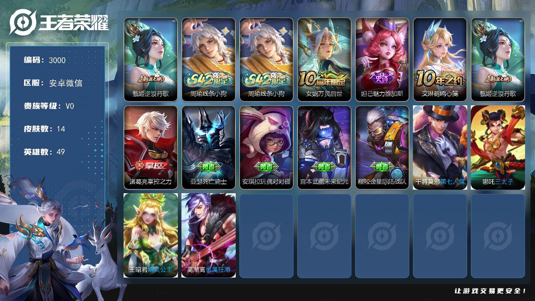 PX_2559152-可二次0违规-1579星币-甄姬逆浪荇歌,周瑜线条小狗,女娲万灵启世,妲己魅力维加斯安卓WX-V0-永恒钻石V段位-49英雄-14皮肤-2史诗 【赛季限定】:甄姬逆浪荇歌 【战令限定】:周瑜线条小狗 【史诗皮肤】:周瑜线条小狗,女娲万灵启世,妲己魅力维加斯 【其他皮肤】:艾琳鹤鸣心笺,甄姬逆浪荇歌,诸葛亮掌控之力,亚瑟死亡骑士,安琪拉玩偶对对碰,宫本武藏未来纪元,程咬金星际陆战队,干将莫邪第七人偶,哪吒三太子,王昭君精灵公主,高渐离金属狂潮 【营地ID】:1405185408