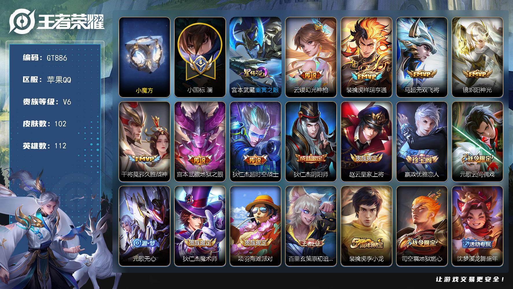 PX_2562739-可换绑【精品打野号·小魔方·巅峰打野全国前10%·打野54段·小国澜1.18w·省2镜1.4w·省标老虎1.41w·省标杨玉环1.27w·6个省标·】,4967星币,7按键,1星传说,5王者印记,五级铭文80,无二次,苹果Q-V6-102皮肤-7传说-34史诗【英雄全皮】:孙权全皮,空空儿全皮【小国标】:小国标澜 【星元皮肤】:宫本武藏幽冥之眼【传说皮肤】:云缨幻光神枪,裴擒虎祥瑞亨通,马超无双飞将,镜炽阳神光,干将莫邪久胜战神,宫本武藏地狱之眼,狄仁杰超时空战士【限定皮肤】:狄仁杰阴阳师,赵云皇家上将,嬴政优雅恋人,元歌云间偶戏,元歌无心,狄仁杰魔术师,项羽海滩派对,百里玄策原初追逐者,裴擒虎李小龙,司空震地狱燃心,沈梦溪龙舞盛年【赛季限定】:东皇太一噬灭天穹,太乙真人谧流熔炉,钟馗虚灵犬护,甄姬逆浪荇歌,亚瑟荣光之誓,百里玄策原初追逐者,项羽九幽镇关【战令限定】:元歌云间偶戏,司空震地狱燃心,孙悟空神迹守卫,刘禅鸭鸭历险记,沈梦溪鸭鸭历险记,周瑜百相守梦,孙策百相守梦,莱西奥光弋星穹,明世隐往忆晖光,周瑜线条小狗,小乔线条小狗【史诗皮肤】:周瑜线条小狗,小乔线条小狗,项羽九幽镇关,莱西奥光弋星穹,公孙离涂山容容,西施织梦人,黄忠百相守梦,周瑜百相守梦,后羿石田雨龙,狂铁龙之律动,刘禅鸭鸭历险记,司空震地狱燃心,镜真我赫兹,元歌无心,澜赏金猎手,元歌云间偶戏,裴擒虎李小龙,百里玄策原初追逐者,不知火舞魅语,狄仁杰鹰眼统帅,程咬金功夫厨神,刘禅天才门将,百里守约特工魅影,雅典娜冰冠公主,夏侯惇乘风破浪,刘邦德古拉伯爵,曹操幽灵船长,妲己魅力维加斯,嬴政优雅恋人,孙尚香水果甜心,狄仁杰魔术师,王昭君偶像歌手,貂蝉圣诞恋歌,赵云皇家上将,露娜紫霞仙子【其他皮肤】:兰陵王雾影缉谜,桑启线条小狗,虞姬溯影追猎,蚩奼极光幻客,曹操逐霄之志,艾琳鹤鸣心笺,孙权径山谋武,明世隐往忆晖光,亚瑟荣光之誓,鬼谷子克喵,莱西奥踏浪烽翎,空空儿戏梦巡演,庄周锦麟游梦,孙策百相守梦,甄姬逆浪荇歌,白起死霸装,姬小满小满鸭,露娜命运加冕,阿古朵布丁狗之约,张良灵野札记,苏烈春野闲踪,沈梦溪鸭鸭历险记,钟馗虚灵犬护,明世隐景韶洛都,姜子牙星梦巡礼,西施雪境奇遇,太乙真人谧流熔炉,苍苍林狼骑,干将莫邪雾都夜雨,东皇太一噬灭天穹,孙悟空神迹守卫,沈梦溪龙舞盛年,姬小满零食大作战,海月幻泉雾影,戈娅危途狂花,孙尚香沉稳之力,关羽龙腾万里,狄仁杰阴阳师,后羿阿尔法小队,宫本武藏万象初新,甄姬花好人间,达摩拳王,亚瑟死亡骑士,宫本武藏未来纪元,扁鹊救世之瞳,赵云白执事,韩信街头霸王,项羽海滩派对,暃碧珀绯影,金蝉前尘,澜孤猎,镜冰刃幻境,马超幸存者,元歌午夜歌剧院,裴擒虎街头旋风,杨玉环霓裳曲,百里守约绝影神枪,诸葛亮星航指挥官,马可波罗激情绿茵,花木兰剑舞者
