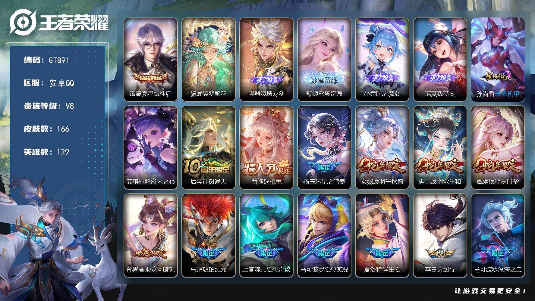 PX_2518977-??推荐·1.1W战力关羽·赤影疾锋·江户川柯南·怪盗基德·神骥越千峰·神骥镇沧海·愿照山河定·愿照九州拓·祥瑞亨通·落雪白狼·燃星之曲·猫影幻舞·霜月吟·淬星耀世·无二次包过】YXw20763-安卓Q-127英雄-195皮肤-6王者印记-160铭文-贵族积分3w【贵族7】【1典藏·2珍品·2星传说·16传说·4按键】【因赛季更新游戏段付以上号为准!】 【荣耀典藏】:关羽赤影疾锋 【珍品传说】:鲁班七号江户川柯南,马可波罗怪盗基德 【星元皮肤】:孙悟空幽冥火,宫本武藏幽冥之眼 【传说皮肤】:云缨神骥越千峰,关羽神骥镇沧海,司空震愿照山河定,澜愿照九州拓,云缨幻光神枪,裴擒虎祥瑞亨通,亚连落雪白狼,露娜霜月吟,花木兰燃星之曲,赵云淬星耀世,貂蝉猫影幻舞,干将莫邪久胜战神,达摩黄金狮子座,梦奇胖达荣荣,宫本武藏地狱之眼,孙悟空地狱火 【限定皮肤】:狄仁杰阴阳师,赵云皇家上将,嬴政白昼王子,鲁班七号狮舞东方,吕布猎兽之王,夏侯惇朔风刀,马可波罗暗影游猎,狄仁杰魔术师,狄仁杰万华元夜,项羽海滩派对,老夫子醍醐杖,关羽冰锋战神,程咬金演武夺筹,韩信飞衡,花木兰燃星之曲,孙悟空至尊宝,牛魔御旌,钟馗神迹守卫,钟馗驱傩正仪,鬼谷子原初探秘者,弈星混沌棋,明世隐疑决卦,狂铁御狮,米莱狄御霄,盾山御銮,猪八戒西部大镖客,上官婉儿梁祝,张良古海寻踪,亚连落雪白狼,刘邦剑破天穹,程咬金群星魔术团 【年限皮肤】:韩信飞衡,司空震愿照山河定,澜愿照九州拓 【赛季限定】:狂铁御狮,米莱狄御霄,牛魔御旌,盾山御銮,夏侯惇朔风刀,弈星混沌棋,明世隐疑决卦,老夫子醍醐杖,鬼谷子原初探秘者,狄仁杰万华元夜,程咬金演武夺筹,钟馗驱傩正仪,张良古海寻踪,刘邦剑破天穹,太乙真人谧流熔炉,甄姬逆浪荇歌,亚瑟荣光之誓,牛魔星界战将,项羽九幽镇关 【战令限定】:嬴政白昼王子,吕布猎兽之王,鲁班七号狮舞东方,钟馗神迹守卫,马可波罗暗影游猎,猪八戒西部大镖客,廉颇撼地雄心,百里守约百相守梦,老夫子百相守梦,孙膑茶境仙,马超访茗客,莱西奥光弋星穹,明世隐往忆晖光,周瑜线条小狗,小乔线条小狗 【史诗皮肤】:周瑜线条小狗,小乔线条小狗,项羽九幽镇关,莱西奥光弋星穹,黄忠百相守梦,狂铁龙之律动,赵怀真器灵浮梦炉,弈星万物之道,孙膑茶境仙,牛魔星界战将,百里守约百相守梦,廉颇撼地雄心,钟馗乐园奇幻夜,沈梦溪月团寄思,马可波罗暗影游猎,橘右京修罗,韩信飞衡,上官婉儿梁祝,公孙离无限星赏官,狄仁杰鹰眼统帅,鲁班七号狮舞东方,孙策猫狗日记,嬴政白昼王子,白起星夜王子,李元芳逐浪之夏,百里守约特工魅影,雅典娜冰冠公主,亚瑟心灵战警,花木兰水晶猎龙者,孙悟空至尊宝,关羽冰锋战神,韩信白龙吟,张飞乱世虎臣,李白千年之狐,曹操幽灵船长,吕布圣诞狂欢,妲己魅力维加斯,嬴政暗夜贵公子,宫本武藏鬼剑武藏,廉颇地狱岩魂,狄仁杰魔术师,赵云皇家上将,露娜紫霞仙子 【其他皮肤】:兰陵王雾影缉谜,鲁班七号班班快跑,桑启线条小狗,虞姬溯影追猎,蚩奼极光幻客,艾琳鹤鸣心笺,明世隐往忆晖光,亚瑟荣光之誓,鬼谷子克喵,甄姬逆浪荇歌,露娜命运加冕,张良灵野札记,少司缘灵卦秘语,西施雪境奇遇,影魅影绮裳,马超访茗客,典韦铁骨偃魂,太乙真人谧流熔炉,苍苍林狼骑,吕布逐霄战戟,干将莫邪雾都夜雨,老夫子百相守梦,程咬金群星魔术团,刘邦剑破天穹,后羿完美运算,亚连破局者,钟无艳聚星闪耀,张良古海寻踪,太乙真人劲辣红锅,赵怀真太极少年,蒙恬蔚蓝守将,典韦铁甲之心,鲁班大师乓乓大师,钟馗驱傩正仪,程咬金演武夺筹,刘禅秘密基地,狄仁杰万华元夜,鬼谷子原初探秘者,猪八戒西部大镖客,老夫子醍醐杖,明世隐疑决卦,鲁班七号黑桃队长,哪吒次元突破,弈星混沌棋,夏侯惇朔风刀,盾山御銮,钟馗神迹守卫,小乔丁香结,牛魔御旌,庄周奇妙博物学,吕布猎兽之王,米莱狄御霄,项羽科学大爆炸,大乔守护之力,狂铁御狮,鬼谷子幻乐之宴,李白敏锐之力,孙尚香沉稳之力,老夫子功夫老勺,狂铁命运角斗场,王昭君幻想奇妙夜,宫本武藏霸王丸,钟无艳海滩丽影,关羽龙腾万里,刘备汉昭烈帝,狄仁杰阴阳师,后羿阿尔法小队,宫本武藏万象初新,刘备万事如意,甄姬花好人间,张飞五福同心,花木兰兔女郎,达摩拳王,亚瑟死亡骑士,典韦黄金武士,安琪拉玩偶对对碰,宫本武藏未来纪元,扁鹊救世之瞳,程咬金星际陆战队,赵云忍炎影,阿轲爱心护理,露娜哥特玫瑰,韩信街头霸王,韩信教廷特使,项羽海滩派对,桑启画中游,司空震启蛰,澜孤猎,蒙恬秩序猎龙将,蒙犽归虚梦演,鲁班大师归虚梦演,马超幸存者,曜归虚梦演,云中君荷鲁斯之眼,瑶森,盘古创世神祝,猪八戒年年有余,嫦娥露花倒影,李信灼热之刃,伽罗花见巫女,司马懿魇语军师,孙策海之征途,元歌午夜歌剧院,米莱狄精准探案法,弈星踏雪寻梅,裴擒虎街头旋风,女娲尼罗河女神,梦奇美梦成真,苏烈爱与和平,百里玄策威尼斯狂欢,百里守约绝影神枪,鬼谷子阿摩司公爵,干将莫邪第七人偶,黄忠芝加哥教父,诸葛亮星航指挥官,哪吒三太子,杨戬埃及法老,苍维京掠夺者,马可波罗激情绿茵,雅典娜战争女神,夏侯惇战争骑士,关羽天启骑士,虞姬加勒比小姐,刘邦圣殿之光,兰陵王隐刃,周瑜海军大将,孙悟空西部大镖客,曹操死神来了,王昭君精灵公主,花木兰剑舞者,露娜绯红之刃,鲁班七号木偶奇遇记,鲁班七号福禄兄弟