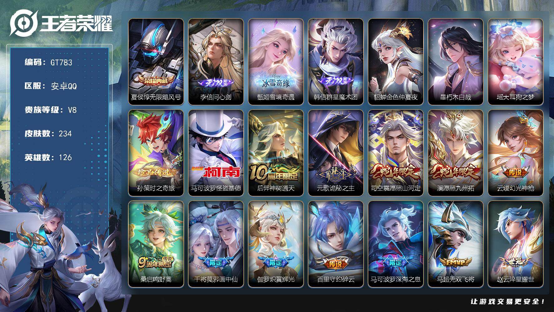 PX_2560071-??主推·贵族v10·倪克斯神谕·无限飓风号·天鹅之梦·大秦宣太后·鸣剑曳影·星域神启·九霄神辉·浮生妄·山海琳琅生·补天·寅虎赤拳·兰陵王默契交锋·祈雪灵祝·时雨天司·武圣·太华·白虎志·可二次】YXw20459-安卓Q-128英雄-363皮肤-11王者印记-300铭文-贵族积分24w【贵族10】【8典藏·4星传说·40传说·9按键·334个性戳戳】【因赛季更新游戏段付以上号为准!】 【英雄全皮】:橘右京全皮,敖隐全皮,夏洛特全皮 【荣耀典藏】:武则天英雄,武则天倪克斯神谕,夏侯惇无限飓风号,小乔天鹅之梦,芈月大秦宣太后,李白鸣剑曳影,诸葛亮星域神启,花木兰九霄神辉 【星元皮肤】:狄仁杰星际治安官,貂蝉金色仲夏夜,孙尚香未来机甲,宫本武藏幽冥之眼 【天幕】:鲲天幕,花朝如约天幕 【传说皮肤】:艾琳觅芳踪,夏洛特浮生妄,孙悟空齐天大圣,小乔山海琳琅生,橘右京枫霜尽,马超无双飞将,露娜启示之音,女娲补天,孙策末日机甲,裴擒虎寅虎赤拳,鲁班七号寅虎瑞焰,赵云淬星耀世,王昭君乞巧织情,西施游龙清影,周瑜音你心动,李元芳飞鸢探春,兰陵王默契交锋,公孙离祈雪灵祝,诸葛亮时雨天司,镜炽阳神光,虞姬启明星使,关羽武圣,曜云鹰飞将,李信一念神魔,刘备时之恋人,伽罗太华,貂蝉猫影幻舞,张良黄金白羊座,干将莫邪久胜战神,达摩黄金狮子座,百里玄策白虎志,梦奇胖达荣荣,后羿黄金射手座,诸葛亮武陵仙君,貂蝉仲夏夜之梦,孙尚香末日机甲,宫本武藏地狱之眼,孙悟空地狱火,吕布天魔缭乱,狄仁杰超时空战士 【限定皮肤】:白起狰,狄仁杰阴阳师,虞姬凯尔特女王,廉颇寅虎御盾,小乔山海琳琅生,赵云皇家上将,赵云龙胆,墨子神迹守卫,嬴政白昼王子,孙尚香蔷薇恋人,鲁班七号狮舞东方,鲁班七号寅虎瑞焰,庄周云端筑梦师,高渐离玩趣恶龙,阿轲迷踪丽影,孙膑妖精王,孙膑天狼运算者,孙膑寅虎展翼,扁鹊炼金王,白起夜都怪侠,芈月重明,芈月白晶晶,芈月幻夜卜梦,吕布天魔缭乱,吕布猎兽之王,吕布御风骁将,周瑜赤莲之焰,元歌云间偶戏,夏侯惇朔风刀,甄姬女儿国国王,甄姬游园惊梦,甄姬落雪兰心,曹操烛龙,典韦穷奇,典韦蓝屏警告,马可波罗逐梦之星,马可波罗暗影游猎,狄仁杰魔术师,狄仁杰万华元夜,达摩星际陆战队,达摩沙漠行僧,项羽海滩派对,老夫子醍醐杖,老夫子航海奇遇记,关羽冰锋战神,关羽武圣,程咬金演武夺筹,露娜启示之音,刘邦夺宝奇兵,韩信飞衡,韩信傲雪梅枪,兰陵王默契交锋,兰陵王驯魔猎人,兰陵王金庭之子,花木兰瑞麟志,花木兰默契交锋,橘右京枫霜尽,亚瑟潮玩骑士王,孙悟空大圣娶亲,孙悟空齐天大圣,牛魔御旌,牛魔奔雷神使,后羿如梦令,后羿圣弓游侠,刘备百相守梦,张飞虎魄,李元芳银河之约,李元芳云中旅人,虞姬启明星使,钟馗神迹守卫,钟馗驱傩正仪,杨玉环遇见飞天,杨玉环寅虎心曲,女娲朔望之晖,女娲补天,干将莫邪冰霜恋舞曲,雅典娜单词大作战,雅典娜黎明之约,蔡文姬繁星吟游,太乙真人饕餮,东皇太一逐梦之光,鬼谷子原初探秘者,诸葛亮武陵仙君,诸葛亮时雨天司,大乔白鹤梁神女,黄忠烈魂,黄忠火炮绅士,铠青龙志,苏烈玄武志,苏烈千军破阵,百里玄策白虎志,百里玄策原初追逐者,百里守约朱雀志,弈星混沌棋,公孙离祈雪灵祝,沈梦溪星空之诺,沈梦溪大漠名商,明世隐疑决卦,明世隐吟游魔法,裴擒虎天狼狩猎者,裴擒虎李小龙,裴擒虎寅虎赤拳,裴擒虎擒涛扼浪,狂铁御狮,米莱狄御霄,米莱狄胡桃异想国,云中君纤云弄巧,云中君时之祈愿,伽罗太华,盾山御銮,猪八戒西部大镖客,上官婉儿梁祝,上官婉儿天狼绘梦者,嫦娥如梦令,嫦娥暖冬兔眠,蒙犽狂想玩偶喵,鲁班大师探海日志,夏洛特浮生妄,阿古朵江河有灵,张良古海寻踪,艾琳觅芳踪 【年限皮肤】:花木兰瑞麟志,苏烈玄武志,百里玄策白虎志,百里守约朱雀志,铠青龙志,伽罗太华,韩信飞衡,公孙离祈雪灵祝,诸葛亮时雨天司,吕布御风骁将,牛魔奔雷神使,裴擒虎寅虎赤拳,鲁班七号寅虎瑞焰,孙膑寅虎展翼,廉颇寅虎御盾,杨玉环寅虎心曲,小乔山海琳琅生 【赛季限定】:孙膑妖精王,扁鹊炼金王,虞姬凯尔特女王,白起狰,太乙真人饕餮,曹操烛龙,芈月重明,典韦穷奇,狂铁御狮,米莱狄御霄,牛魔御旌,盾山御銮,夏侯惇朔风刀,弈星混沌棋,明世隐疑决卦,老夫子醍醐杖,鬼谷子原初探秘者,狄仁杰万华元夜,程咬金演武夺筹,钟馗驱傩正仪,苏烈千军破阵,达摩沙漠行僧,兰陵王金庭之子,沈梦溪大漠名商,李元芳云中旅人,裴擒虎擒涛扼浪,鲁班大师探海日志,张良古海寻踪,百里玄策原初追逐者,雅典娜黎明之约 【战令限定】:嬴政白昼王子,吕布猎兽之王,典韦蓝屏警告,女娲朔望之晖,鲁班七号狮舞东方,钟馗神迹守卫,兰陵王驯魔猎人,周瑜赤莲之焰,李元芳银河之约,沈梦溪星空之诺,阿轲迷踪丽影,刘邦夺宝奇兵,马可波罗暗影游猎,猪八戒西部大镖客,蒙犽狂想玩偶喵,雅典娜单词大作战,元歌云间偶戏,亚瑟潮玩骑士王,米莱狄胡桃异想国,达摩星际陆战队,老夫子航海奇遇记,墨子神迹守卫,后羿圣弓游侠,黄忠火炮绅士,芈月幻夜卜梦,明世隐吟游魔法,白起夜都怪侠,甄姬落雪兰心,嫦娥暖冬兔眠,周瑜线条小狗 【史诗皮肤】:周瑜线条小狗,狂铁龙之律动,阿古朵江河有灵,刘备百相守梦,杨玉环银翎春语,弈星滕王阁序,高渐离天秀音浪,明世隐吟游魔法,夏洛特永昼,云中君时之祈愿,哪吒雪上飞焰,孙膑寅虎展翼,廉颇寅虎御盾,杨玉环寅虎心曲,韩信