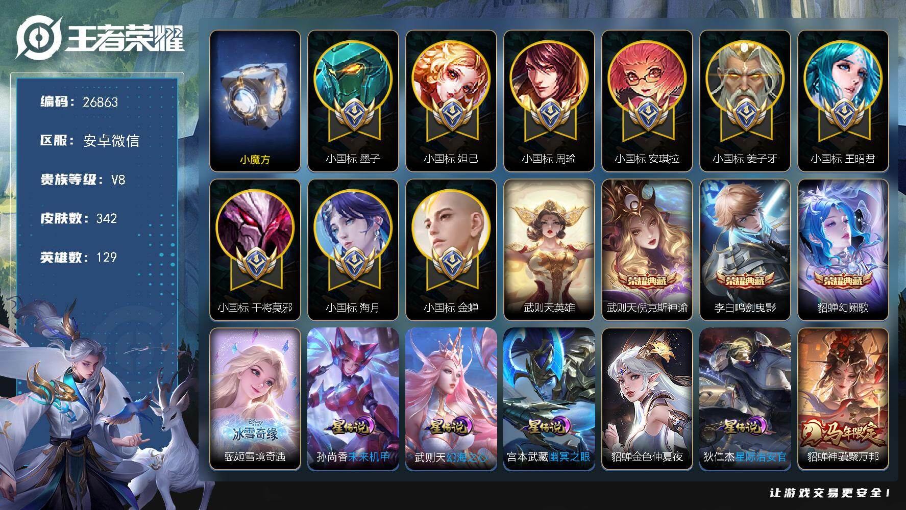 PX_2561342-可换绑【中路87段·9个小国标·22个金标·墨子小国标1.32万·海月小国标1.21万·安琪拉小国标1.34万·姜子牙小国标1.41万·干将莫邪小国标1.28万·妲己小国标1.35万·周瑜小国标·王昭君小国标1.23万·金蝉小国标1.28万】幸运值211,13按键,5星传说,27王者印记,满级铭文,可二次KK30011,安卓WX-V8-342皮肤-3典藏皮肤-1典藏英雄-1无双-21传说-100史诗【英雄全皮】:苍全皮,沈梦溪全皮,敖隐全皮,空空儿全皮【荣耀典藏】:武则天英雄,武则天倪克斯神谕,李白鸣剑曳影,貂蝉幻阙歌【无双皮肤】:甄姬雪境奇遇【小国标】:小国标墨子,小国标海月,小国标安琪拉,小国标姜子牙,小国标干将莫邪,小国标妲己,小国标周瑜,小国标王昭君,小国标金蝉【星元皮肤】:貂蝉金色仲夏夜,宫本武藏幽冥之眼,武则天幻海之心,孙尚香未来机甲,狄仁杰星际治安官【传说皮肤】:貂蝉神骥聚万邦,马超神骥逐星野,后羿神树通天,杨玉环星之鸣奏,女娲愿照千秋盛,妲己愿照众生和,澜愿照九州拓,虞姬愿照岁时盈,云缨幻光神枪,嬴政玄雷天君,桑启鸣野蒿,孙尚香音你闪耀,孙策末日机甲,周瑜音你心动,虞姬启明星使,干将莫邪久胜战神,达摩黄金狮子座,梦奇胖达荣荣,宫本武藏地狱之眼,武则天海洋之心,狄仁杰超时空战士【限定皮肤】:蒙犽顽岩魄,大乔绒语心约,姜子牙天穹之誓,狄仁杰阴阳师,赵云皇家上将,嬴政优雅恋人,庄周高山流水,高渐离玩趣恶龙,钟无艳王者之锤,元歌无心,夏侯惇朔风刀,甄姬游园惊梦,马可波罗暗影游猎,狄仁杰魔术师,狄仁杰万华元夜,达摩沙漠行僧,项羽海滩派对,老夫子醍醐杖,关羽冰锋战神,安琪拉魔法小厨娘,程咬金演武夺筹,王昭君凤凰于飞,兰陵王金庭之子,后羿圣弓游侠,李元芳云中旅人,虞姬启明星使,钟馗神迹守卫,钟馗驱傩正仪,杨玉环遇见飞天,杨玉环寅虎心曲,干将莫邪冰霜恋舞曲,干将莫邪胡桃夹子,干将莫邪真爱魔法,雅典娜单词大作战,雅典娜黎明之约,鬼谷子原初探秘者,鬼谷子五谷丰年,苏烈千军破阵,百里玄策原初追逐者,弈星混沌棋,梦奇顽趣,沈梦溪星空之诺,沈梦溪大漠名商,沈梦溪匿光破解者,明世隐疑决卦,裴擒虎李小龙,裴擒虎擒涛扼浪,云中君纤云弄巧,盾山御銮,猪八戒西部大镖客,上官婉儿梁祝,嫦娥拒霜思,嫦娥暖冬兔眠,西施至美乘鲤谣,蒙犽狂想玩偶喵,鲁班大师探海日志,桑启海盐诗旅,暃星界游侠,阿古朵江河有灵,张良古海寻踪,蒙恬荣光圣徽,鬼谷子天穹祈灯,伽罗琥珀纪元,沈梦溪龙舞盛年,刘邦剑破天穹,上官婉儿群星魔术团,程咬金群星魔术团,镜青焰无极,项羽苍威无极,周瑜熔金海岸【年限皮肤】:王昭君凤凰于飞,杨玉环寅虎心曲,女娲愿照千秋盛,妲己愿照众生和,澜愿照九州拓,虞姬愿照岁时盈【赛季限定】:盾山御銮,夏侯惇朔风刀,弈星混沌棋,明世隐疑决卦,老夫子醍醐杖,鬼谷子原初探秘者,狄仁杰万华元夜,程咬金演武夺筹,钟馗驱傩正仪,苏烈千军破阵,达摩沙漠行僧,兰陵王金庭之子,沈梦溪大漠名商,李元芳云中旅人,桑启海盐诗旅,裴擒虎擒涛扼浪,鲁班大师探海日志,张良古海寻踪,鬼谷子天穹祈灯,刘邦剑破天穹,姜子牙天穹之誓,东皇太一噬灭天穹,太乙真人谧流熔炉,钟馗虚灵犬护,亚瑟荣光之誓,百里玄策原初追逐者,雅典娜黎明之约,梦奇顽趣,蒙恬荣光圣徽,牛魔星界战将,项羽九幽镇关【战令限定】:钟馗神迹守卫,沈梦溪星空之诺,马可波罗暗影游猎,猪八戒西部大镖客,蒙犽狂想玩偶喵,雅典娜单词大作战,干将莫邪真爱魔法,后羿圣弓游侠,暃星界游侠,嫦娥暖冬兔眠,镜青焰无极,项羽苍威无极,亚连破空之剑,孙悟空神迹守卫,孙膑茶境仙,马超访茗客,刘禅鸭鸭历险记,沈梦溪鸭鸭历险记,周瑜线条小狗,小乔线条小狗【史诗皮肤】:上官婉儿春霖将至,太乙真人瓦猫非猫,周瑜线条小狗,小乔线条小狗,项羽九幽镇关,女娲万灵启世,百里玄策罗小黑战记,百里守约雪豹霜爪,狂铁龙之律动,刘禅鸭鸭历险记,阿轲化蝶舞,苍狼魂孤将,弈星万物之道,孙膑茶境仙,牛魔星界战将,弈星炽弈燎原,亚连破空之剑,蒙犽顽岩魄,镜青焰无极,上官婉儿群星魔术团,伽罗琥珀纪元,蒙恬荣光圣徽,周瑜雪夜绮愿,西施至美乘鲤谣,阿古朵江河有灵,米莱狄完美假期,刘禅电玩爆裂旋风,沈梦溪匿光破解者,暃星界游侠,梦奇顽趣,元歌无心,鬼谷子五谷丰年,弈星滕王阁序,艾琳奇遇舞章,杨玉环寅虎心曲,雅典娜黎明之约,嫦娥拒霜思,庄周高山流水,安琪拉时之奇旅,沈梦溪月团寄思,干将莫邪真爱魔法,西施诗语江南,云中君纤云弄巧,裴擒虎李小龙,百里玄策原初追逐者,蒙犽狂想玩偶喵,马可波罗暗影游猎,马超神威,橘右京修罗,不知火舞魅语,上官婉儿梁祝,公孙离无限星赏官,狄仁杰鹰眼统帅,伽罗箭羽风息,干将莫邪冰霜恋舞曲,大乔猫狗日记,孙策猫狗日记,杨玉环遇见飞天,阿轲节奏热浪,白起星夜王子,程咬金功夫厨神,李元芳逐浪之夏,蔡文姬舞动绿茵,铠曙光守护者,百里守约特工魅影,安琪拉心灵骇客,雅典娜冰冠公主,亚瑟心灵战警,甄姬游园惊梦,诸葛亮黄金分割率,兰陵王暗隐猎兽者,小乔缤纷独角兽,夏侯惇乘风破浪,刘邦德古拉伯爵,花木兰水晶猎龙者,王昭君凤凰于飞,关羽冰锋战神,张飞乱世虎臣,安琪拉魔法小厨娘,吕布末日机甲,李白千年之狐,曹操幽灵船长,刘禅绅士熊喵,吕布圣诞狂欢,墨子金属风暴,墨子龙骑士,妲己女仆咖啡,妲己魅力维加斯,嬴政摇滚巨星,嬴政优雅恋人,孙尚香水果甜心,宫