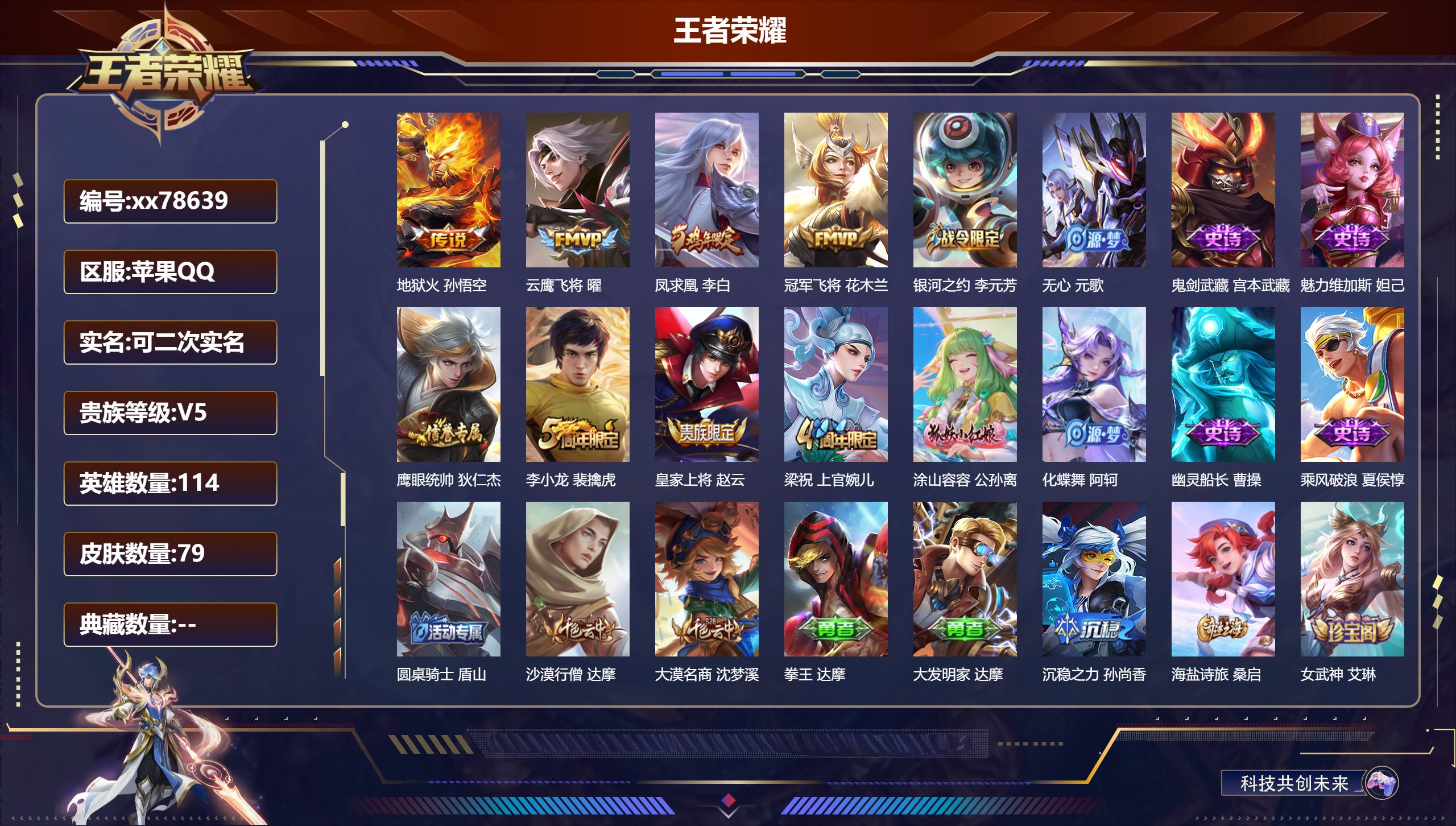 PX_2561339-,可二次,V5,贵族积分6612,苹果QQ/79皮肤/114英雄/0典藏/0珍品无双/0无双/0珍品传说/4传说/12史诗/7稀有英雄 【4,传说皮肤】,地狱火,孙悟空,云鹰飞将,曜,凤求凰,李白,冠军飞将,花木兰, 【12,史诗皮肤】,银河之约,李元芳,无心,元歌,鬼剑武藏,宫本武藏,魅力维加斯,妲己,鹰眼统帅,狄仁杰,李小龙,裴擒虎,皇家上将,赵云,梁祝,上官婉儿,涂山容容,公孙离,化蝶舞,阿轲,幽灵船长,曹操,乘风破浪,夏侯惇, 【50,勇者皮肤】,圆桌骑士,盾山,沙漠行僧,达摩,大漠名商,沈梦溪,拳王,达摩,大发明家,达摩,沉稳之力,孙尚香,海盐诗旅,桑启,朔风刀,夏侯惇,醍醐杖,老夫子,汉昭烈帝,刘备,白色死神,白起,阴阳师,狄仁杰,径山谋武,孙权,古海寻踪,张良,海滩派对,项羽,万华元夜,狄仁杰,演武夺筹,程咬金,原初探秘者,鬼谷子,星空之诺,沈梦溪,天穹祈灯,鬼谷子,疑决卦,明世隐,阿尔法小队,后羿,死亡骑士,亚瑟,浪漫序章,刘备,敏锐之力,李白,破局者,亚连,忍·炎影,赵云,唤灵魔甲,刘禅,万事如意,刘备,擒涛扼浪,裴擒虎,探海日志,鲁班大师,女武神,艾琳,兔女郎,花木兰,金庭之子,兰陵王,未来纪元,宫本武藏,罗小黑战记,哪吒,荣光之誓,亚瑟,云中旅人,李元芳,妄想特派,李元芳,西部大镖客,孙悟空,混沌棋,弈星,幻想奇妙夜,王昭君,驱傩正仪,钟馗,特工战影,狂铁,白执事,赵云,罗小黑战记,张良,熔金海岸,周瑜,谧流熔炉,太乙真人,鹤鸣心笺,艾琳,玫蓝誓约,戈娅, 【14,其他皮肤】,花见巫女,伽罗,灼热之刃,李信,绯红之刃,露娜,冰刃幻境,镜,午夜歌剧院,元歌,异域舞娘,貂蝉,街头旋风,裴擒虎,范海辛,李白,激情绿茵,马可波罗,归虚梦演,曜,幸存者,马超,赤焰之缨,云缨,天启骑士,关羽,西部大镖客,孙悟空, 【7,稀有英雄】,不知火舞,橘右京,夏洛特,娜可露露,韩信,艾琳,赵云, 营地ID:,