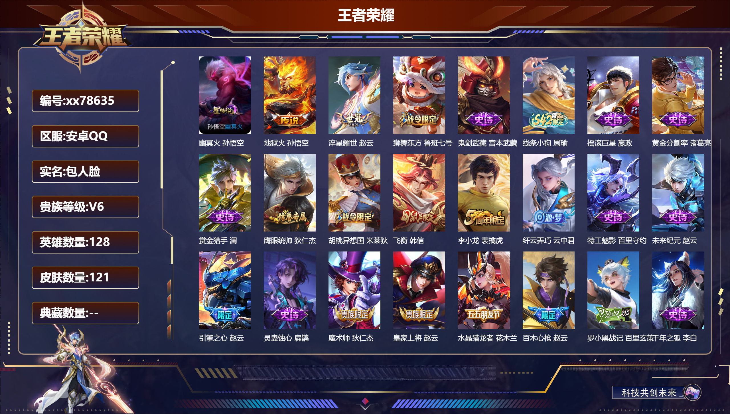 PX_2561323-,包人脸,V6,贵族积分13167,安卓QQ/121皮肤/128英雄/0典藏/0珍品无双/0无双/0珍品传说/2传说/28史诗/8稀有英雄 【1,星传说皮肤】,幽冥火,孙悟空, 【2,传说皮肤】,地狱火,孙悟空,淬星耀世,赵云, 【28,史诗皮肤】,狮舞东方,鲁班七号,鬼剑武藏,宫本武藏,线条小狗,周瑜,摇滚巨星,嬴政,黄金分割率,诸葛亮,赏金猎手,澜,鹰眼统帅,狄仁杰,胡桃异想国,米莱狄,飞衡,韩信,李小龙,裴擒虎,纤云弄巧,云中君,特工魅影,百里守约,未来纪元,赵云,引擎之心,赵云,灵蛊蚀心,扁鹊,魔术师,狄仁杰,皇家上将,赵云,水晶猎龙者,花木兰,百木心枪,赵云,罗小黑战记,百里玄策,千年之狐,李白,节奏热浪,阿轲,暗夜猫娘,阿轲,曙光守护者,铠,龙胆,赵云,水果甜心,孙尚香,狂想玩偶喵,蒙犽,暗隐猎兽者,兰陵王, 【69,勇者皮肤】,胡桃夹子,干将莫邪,圆桌骑士,盾山,烛龙,曹操,爱心护理,阿轲,星际陆战队,达摩,沙漠行僧,达摩,大漠名商,沈梦溪,缤纷绘卷,张良,纽约教父,刘备,拳王,达摩,大发明家,达摩,丁香结,小乔,功夫炙烤,廉颇,沉稳之力,孙尚香,海盐诗旅,桑启,朔风刀,夏侯惇,醍醐杖,老夫子,汉昭烈帝,刘备,白色死神,白起,黑桃队长,鲁班七号,御旌,牛魔,阴阳师,狄仁杰,科学大爆炸,项羽,功夫老勺,老夫子,鲨炮海盗猫,沈梦溪,海滩派对,项羽,万华元夜,狄仁杰,演武夺筹,程咬金,野性能量,吕布,无双福将,程咬金,原初探秘者,鬼谷子,潮玩探月行,猪八戒,天穹祈灯,鬼谷子,疑决卦,明世隐,化身博士,扁鹊,五福同心,张飞,次元傲视,杨戬,霸王丸,宫本武藏,海滩丽影,钟无艳,忍·炎影,赵云,重明,芈月,乓乓大师,鲁班大师,逐霄之志,曹操,天使之翼,孙膑,兔女郎,花木兰,龙腾万里,关羽,金庭之子,兰陵王,未来纪元,宫本武藏,千军破阵,苏烈,荣光之誓,亚瑟,花好人间,甄姬,御銮,盾山,单词大作战,雅典娜,穷奇,典韦,教廷特使,韩信,云中旅人,李元芳,西部大镖客,孙悟空,少女阿狸,妲己,混沌棋,弈星,御霄,米莱狄,幻想奇妙夜,王昭君,驱傩正仪,钟馗,神迹守卫,钟馗,御狮,狂铁,白执事,赵云,饕餮,太乙真人,星梦巡礼,姜子牙,鹤鸣心笺,艾琳,线条小狗,周瑜, 【24,其他皮肤】,潮流仙人,老夫子,三太子,哪吒,龙域领主,铠,第七人偶,干将莫邪,灼热之刃,李信,海之征途,孙策,木偶奇遇记,鲁班七号,帝国元帅,项羽,海军大将,周瑜,隐刃,兰陵王,东海龙王,东皇太一,阿摩司公爵,鬼谷子,一千零一夜,张良,归虚梦演,曜,威尼斯狂欢,百里玄策,战争女神,雅典娜,神奇女侠,雅典娜,创世神祝,盘古,蔷薇王座,蔡文姬,孤猎,澜,赤焰之缨,云缨,美梦成真,梦奇,天启骑士,关羽,西部大镖客,孙悟空, 【8,稀有英雄】,嬴政,不知火舞,橘右京,夏洛特,娜可露露,韩信,艾琳,赵云, 营地ID:,