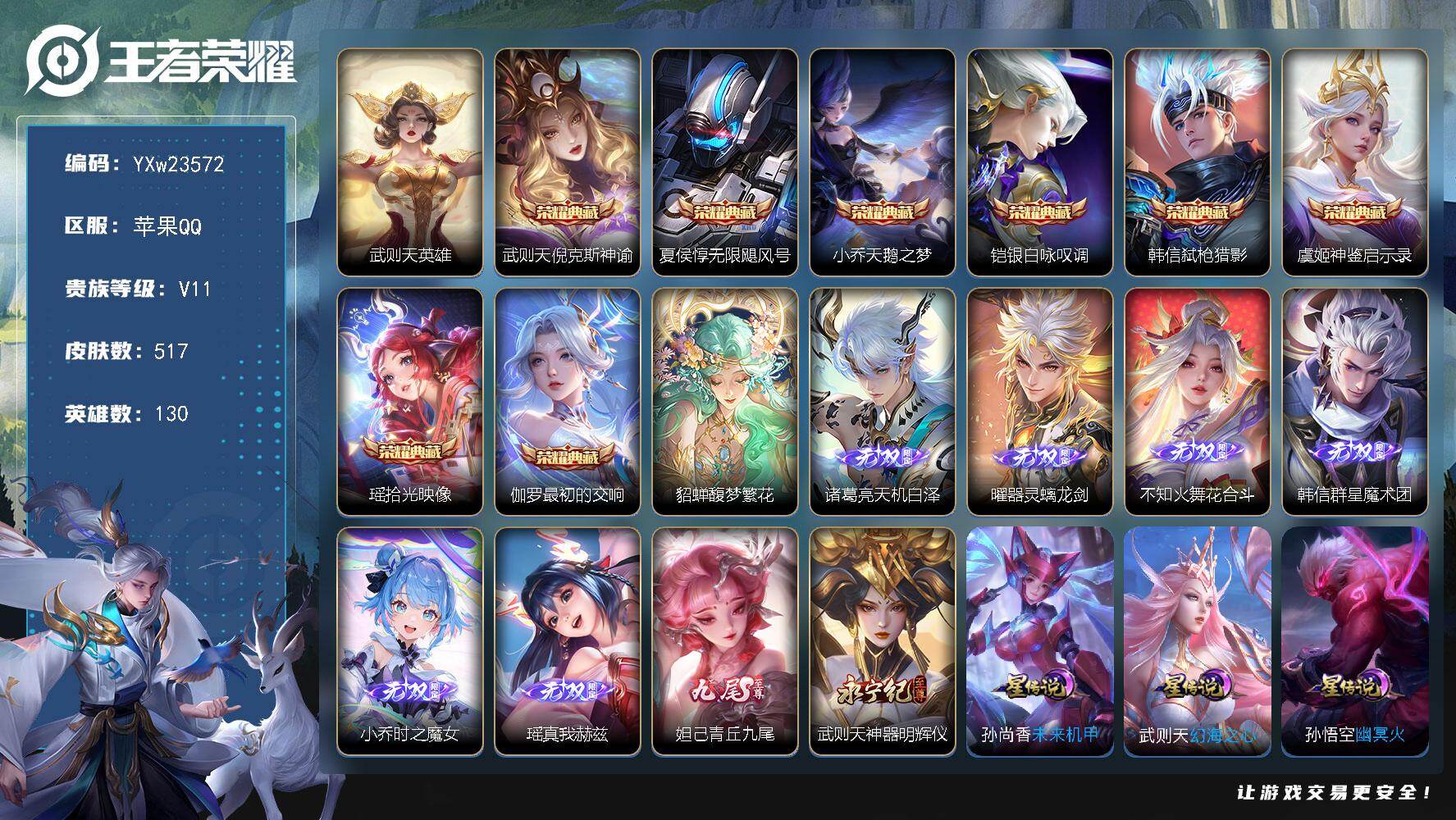 PX_2538526-可换绑【高性价比·孙悟空铠韩信3无双·铠典藏·伽罗珍品·马年全套·多传说限定号】13按键,1星传说,5王者印记,五级铭文90,可二次CD30023,安卓WX-V7-最强王者段位-88英雄-118皮肤-1典藏皮肤-3无双-1珍品传说-22传说-37史诗【英雄全皮】:孙权全皮【荣耀典藏】:铠银白咏叹调【无双皮肤】:孙悟空无相,铠神罪,韩信群星魔术团【珍品传说】:伽罗沧流箭【星元皮肤】:孙悟空幽冥火【传说皮肤】:韩信踏浪归,云缨神骥越千峰,关羽神骥镇沧海,朵莉亚神骥鸣幻洲,狄仁杰神骥赴朔漠,貂蝉神骥聚万邦,马超神骥逐星野,杨戬纵目迁山,后羿神树通天,公孙离云诺千山,司空震愿照山河定,夏侯惇霜北刀,亚连落雪白狼,典韦战鼓燎原,铠琥珀纪元,澜逐花归海,李白诗剑行,蔡文姬花朝如约,小乔音你心动,镜炽阳神光,曜云鹰飞将,孙悟空地狱火【限定皮肤】:夏侯惇霜北刀,狄仁杰阴阳师,赵云皇家上将,元歌无心,狄仁杰魔术师,项羽海滩派对,孙悟空至尊宝,雅典娜黎明之约,铠琥珀纪元,姬小满妄想食味,亚连落雪白狼,韩信群星魔术团【年限皮肤】:司空震愿照山河定【赛季限定】:太乙真人谧流熔炉,钟馗虚灵犬护,甄姬逆浪荇歌,亚瑟荣光之誓,雅典娜黎明之约,项羽九幽镇关【战令限定】:周瑜百相守梦,孙策百相守梦,莱西奥光弋星穹,明世隐往忆晖光,周瑜线条小狗,小乔线条小狗【史诗皮肤】:上官婉儿春霖将至,周瑜线条小狗,小乔线条小狗,项羽九幽镇关,少司缘巫礼祀神,女娲万灵启世,莱西奥光弋星穹,公孙离涂山容容,西施织梦人,黄忠百相守梦,周瑜百相守梦,后羿石田雨龙,狂铁龙之律动,阿轲化蝶舞,姬小满妄想食味,元歌无心,雅典娜黎明之约,杨戬天秀启明,橘右京修罗,狄仁杰鹰眼统帅,伽罗箭羽风息,李元芳逐浪之夏,蔡文姬舞动绿茵,铠曙光守护者,百里守约特工魅影,雅典娜冰冠公主,刘邦德古拉伯爵,孙悟空至尊宝,张飞乱世虎臣,吕布末日机甲,曹操幽灵船长,吕布圣诞狂欢,妲己女仆咖啡,孙尚香水果甜心,宫本武藏鬼剑武藏,狄仁杰魔术师,甄姬冰雪圆舞曲,赵云皇家上将【其他皮肤】:兰陵王雾影缉谜,妲己线条小狗,桑启线条小狗,虞姬溯影追猎,蚩奼极光幻客,曹操逐霄之志,艾琳鹤鸣心笺,孙权径山谋武,明世隐往忆晖光,亚瑟荣光之誓,鬼谷子克喵,莱西奥踏浪烽翎,庄周锦麟游梦,孙策百相守梦,云中君云械蓝图,甄姬逆浪荇歌,露娜命运加冕,阿古朵布丁狗之约,张良灵野札记,小乔秘证寻踪,苏烈春野闲踪,钟馗虚灵犬护,刘备浪漫序章,戈娅玫蓝誓约,太乙真人谧流熔炉,姬小满零食大作战,海月幻泉雾影,刘禅唤灵魔甲,典韦铁甲之心,吕布野性能量,王昭君幻想奇妙夜,墨子进击墨子号,狄仁杰阴阳师,达摩拳王,典韦黄金武士,孙膑天使之翼,芈月红桃皇后,韩信街头霸王,项羽海滩派对,云缨赤焰之缨,澜孤猎,曜归虚梦演,上官婉儿修竹墨客,李信灼热之刃,弈星踏雪寻梅,铠龙域领主,东皇太一东海龙王,哪吒三太子,关羽天启骑士,兰陵王隐刃,后羿精灵王,张良一千零一夜,花木兰剑舞者