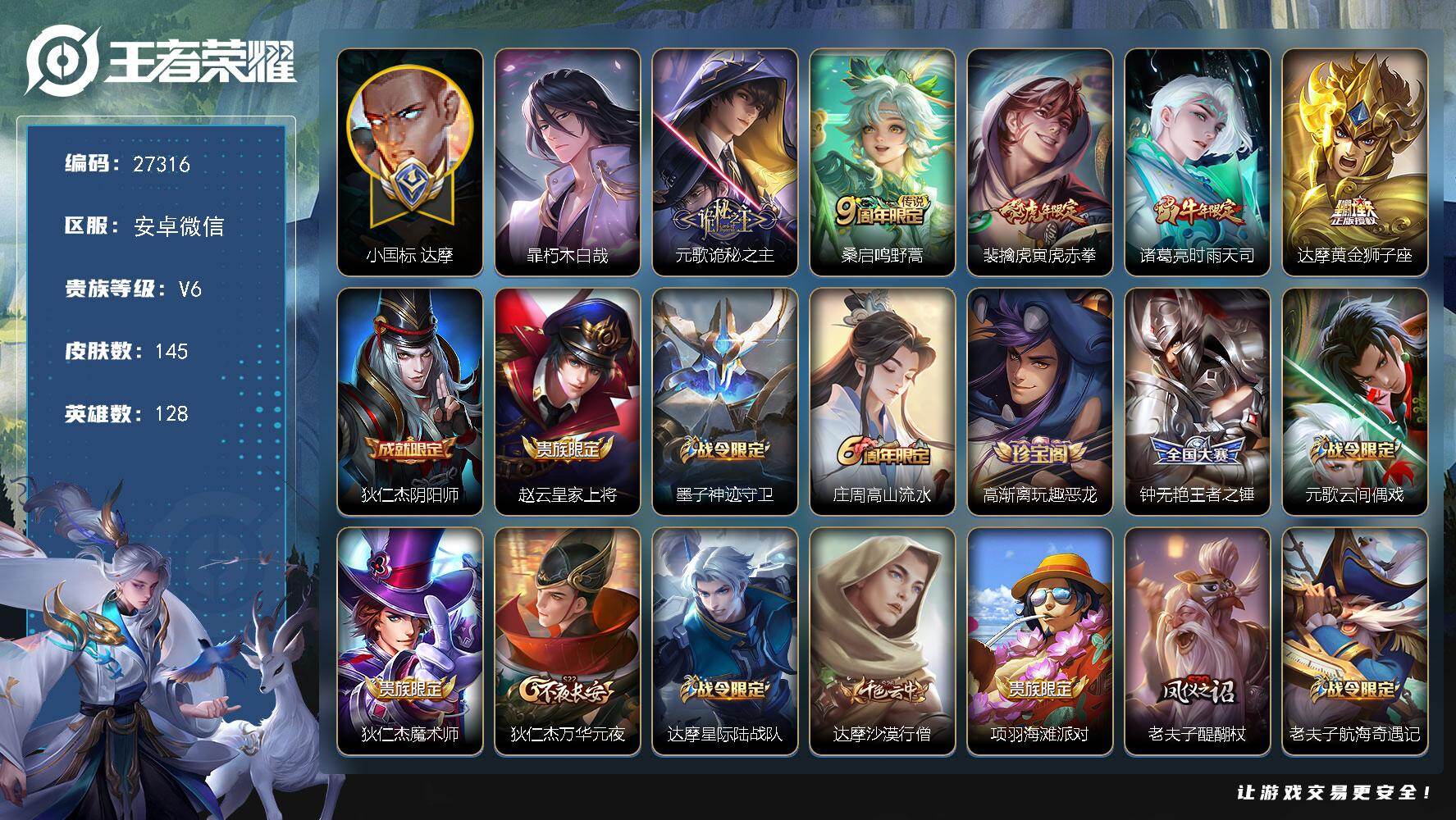 PX_2528478-可换绑【白虎志·大圣娶妻·无二次】30五级铭文,无二次安卓Q-V5-29皮肤-2传说-6史诗【传说皮肤】:关羽武圣,百里玄策白虎志【限定皮肤】:赵云皇家上将,狄仁杰万华元夜,项羽海滩派对,关羽武圣,程咬金演武夺筹,亚瑟潮玩骑士王,孙悟空大圣娶亲,钟馗驱傩正仪,雅典娜单词大作战,鬼谷子原初探秘者,百里玄策白虎志,弈星混沌棋,云中君纤云弄巧,盾山御銮【年限皮肤】:百里玄策白虎志【赛季限定】:盾山御銮,弈星混沌棋,鬼谷子原初探秘者,狄仁杰万华元夜,程咬金演武夺筹,钟馗驱傩正仪【战令限定】:雅典娜单词大作战,亚瑟潮玩骑士王【史诗皮肤】:云中君纤云弄巧,孙悟空大圣娶亲,孙策猫狗日记,曹操幽灵船长,妲己魅力维加斯,赵云皇家上将【其他皮肤】:鲁班大师乓乓大师,钟馗驱傩正仪,程咬金演武夺筹,亚瑟潮玩骑士王,狄仁杰万华元夜,雅典娜单词大作战,鬼谷子原初探秘者,鲁班七号黑桃队长,弈星混沌棋,盾山御銮,亚瑟死亡骑士,妲己少女阿狸,姜子牙时尚教父,项羽海滩派对,鲁班大师归虚梦演,孙策海之征途,百里守约绝影神枪,哪吒三太子,夏侯惇战争骑士,小乔万圣前夜,鲁班七号福禄兄弟