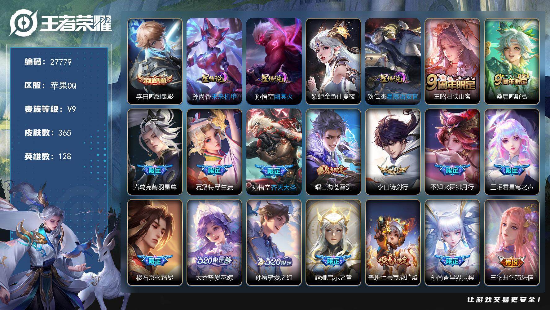 PX_2539831-可换绑【精品推荐v9号·典藏李白·兔年曜·不知火舞绯月行·王昭君星穹之声·大乔挚爱花嫁·虎年鲁班·李逍遥·时雨天司·太华飞衡朱雀志至尊宝·1传说天幕·贵族积分11w·无二次】,271幸运值,4按键,1天幕,4星传说,23王者印记,满级铭文,无二次苹果Q-V9-365皮肤-1典藏皮肤-37传说-106史诗【英雄全皮】:橘右京全皮,猪八戒全皮,敖隐全皮,夏洛特全皮【荣耀典藏】:李白鸣剑曳影【星元皮肤】:狄仁杰星际治安官,孙尚香未来机甲,孙悟空幽冥火,貂蝉金色仲夏夜【天幕】:秋月华灯天幕【传说皮肤】:王昭君映山客,桑启鸣野蒿,诸葛亮鹤羽星尊,夏洛特浮生妄,孙悟空齐天大圣,曜山海苍雷引,李白诗剑行,不知火舞绯月行,王昭君星穹之声,橘右京枫霜尽,大乔挚爱花嫁,孙策挚爱之约,露娜启示之音,鲁班七号寅虎瑞焰,孙尚香异界灵契,王昭君乞巧织情,西施游龙清影,曜李逍遥,,诸葛亮时雨天司,铠绛天战甲,镜炽阳神光,虞姬启明星使,关羽武圣,曜云鹰飞将,李信一念神魔,伽罗太华,貂蝉猫影幻舞,干将莫邪久胜战神,花木兰冠军飞将,后羿黄金射手座,貂蝉仲夏夜之梦,李白凤求凰,孙尚香末日机甲,宫本武藏地狱之眼,孙悟空地狱火,吕布天魔缭乱,狄仁杰超时空战士【限定皮肤】:姜子牙天穹之誓,李白谪仙醉月,狄仁杰阴阳师,赵云皇家上将,墨子神迹守卫,妲己时之奇旅,孙尚香蔷薇恋人,孙尚香异界灵契,鲁班七号狮舞东方,鲁班七号乒乒小将,鲁班七号寅虎瑞焰,庄周高山流水,高渐离死亡摇滚,扁鹊奇幻香踪,芈月重明,吕布天魔缭乱,周瑜赤莲之焰,元歌无心,夏侯惇朔风刀,甄姬幽恒,甄姬女儿国国王,甄姬游园惊梦,曹操烛龙,典韦穷奇,马可波罗暗影游猎,狄仁杰魔术师,狄仁杰万华元夜,达摩星际陆战队,达摩沙漠行僧,项羽海滩派对,老夫子圣诞老人,老夫子醍醐杖,老夫子航海奇遇记,关羽冰锋战神,关羽武圣,程咬金演武夺筹,露娜一生所爱,露娜启示之音,韩信飞衡,韩信傲雪梅枪,王昭君凤凰于飞,王昭君午后时光,王昭君星穹之声,兰陵王驯魔猎人,兰陵王金庭之子,花木兰青春决赛季,不知火舞绯月行,橘右京枫霜尽,孙悟空至尊宝,孙悟空孙行者,孙悟空齐天大圣,牛魔御旌,后羿圣弓游侠,李元芳银河之约,李元芳云中旅人,虞姬启明星使,钟馗神迹守卫,钟馗驱傩正仪,杨玉环遇见飞天,杨戬潮玩骑兵,干将莫邪真爱魔法,雅典娜黎明之约,蔡文姬繁星吟游,太乙真人饕餮,鬼谷子原初探秘者,鬼谷子五谷丰年,诸葛亮时雨天司,诸葛亮鹤羽星尊,大乔挚爱花嫁,苏烈千军破阵,百里玄策原初追逐者,百里守约朱雀志,弈星混沌棋,梦奇顽趣,沈梦溪星空之诺,沈梦溪大漠名商,明世隐疑决卦,裴擒虎李小龙,裴擒虎擒涛扼浪,狂铁御狮,狂铁电玩高手,米莱狄御霄,米莱狄胡桃异想国,云中君纤云弄巧,伽罗太华,盾山御銮,孙策挚爱之约,猪八戒西部大镖客,猪八戒猪悟能,上官婉儿梁祝,上官婉儿天狼绘梦者,嫦娥拒霜思,嫦娥暖冬兔眠,曜李逍遥,,曜山海苍雷引,鲁班大师探海日志,镜匿光追影者,桑启海盐诗旅,夏洛特浮生妄,暃星界游侠,艾琳女武神,阿古朵江河有灵,张良古海寻踪,蒙恬荣光圣徽,鬼谷子天穹祈灯,姬小满妄想食味,沈梦溪龙舞盛年,刘邦剑破天穹,程咬金群星魔术团【年限皮肤】:王昭君凤凰于飞,李白凤求凰,百里守约朱雀志,甄姬幽恒,伽罗太华,韩信飞衡,诸葛亮时雨天司,鲁班七号寅虎瑞焰,曜山海苍雷引【赛季限定】:太乙真人饕餮,曹操烛龙,芈月重明,典韦穷奇,狂铁御狮,米莱狄御霄,牛魔御旌,盾山御銮,夏侯惇朔风刀,弈星混沌棋,明世隐疑决卦,老夫子醍醐杖,鬼谷子原初探秘者,狄仁杰万华元夜,程咬金演武夺筹,钟馗驱傩正仪,苏烈千军破阵,达摩沙漠行僧,兰陵王金庭之子,沈梦溪大漠名商,李元芳云中旅人,桑启海盐诗旅,裴擒虎擒涛扼浪,鲁班大师探海日志,张良古海寻踪,鬼谷子天穹祈灯,刘邦剑破天穹,姜子牙天穹之誓,东皇太一噬灭天穹,太乙真人谧流熔炉,钟馗虚灵犬护,甄姬逆浪荇歌,百里玄策原初追逐者,雅典娜黎明之约,梦奇顽趣,蒙恬荣光圣徽,牛魔星界战将【战令限定】:鲁班七号狮舞东方,钟馗神迹守卫,兰陵王驯魔猎人,周瑜赤莲之焰,李元芳银河之约,沈梦溪星空之诺,马可波罗暗影游猎,猪八戒西部大镖客,米莱狄胡桃异想国,达摩星际陆战队,老夫子航海奇遇记,墨子神迹守卫,干将莫邪真爱魔法,后羿圣弓游侠,狂铁电玩高手,王昭君午后时光,暃星界游侠,嫦娥暖冬兔眠,扁鹊奇幻香踪,杨戬潮玩骑兵,周瑜线条小狗【史诗皮肤】:钟馗锁墨魂,周瑜线条小狗,黄忠百相守梦,后羿石田雨龙,扁鹊灵蛊蚀心,牛魔星界战将,李白谪仙醉月,姬小满妄想食味,蒙恬荣光圣徽,阿古朵江河有灵,刘禅电玩爆裂旋风,扁鹊奇幻香踪,暃星界游侠,梦奇顽趣,元歌无心,鬼谷子五谷丰年,妲己时之奇旅,狂铁电玩高手,夏洛特永昼,韩信傲雪梅枪,甄姬女儿国国王,雅典娜黎明之约,镜匿光追影者,嫦娥拒霜思,庄周高山流水,猪八戒猪悟能,孙悟空孙行者,安琪拉时之奇旅,沈梦溪月团寄思,干将莫邪真爱魔法,鲁班七号乒乒小将,老夫子航海奇遇记,米莱狄胡桃异想国,云中君纤云弄巧,裴擒虎李小龙,百里玄策原初追逐者,马可波罗暗影游猎,上官婉儿天狼绘梦者,瑶遇见神鹿,橘右京修罗,不知火舞魅语,小乔青蛇,甄姬幽恒,韩信飞衡,娜可露露晚萤,李元芳银河之约,蔡文姬繁星吟游,上官婉儿梁祝,兰陵王驯魔猎人,公孙离无限星赏官,狄仁杰鹰眼统帅,鲁班七号狮舞东