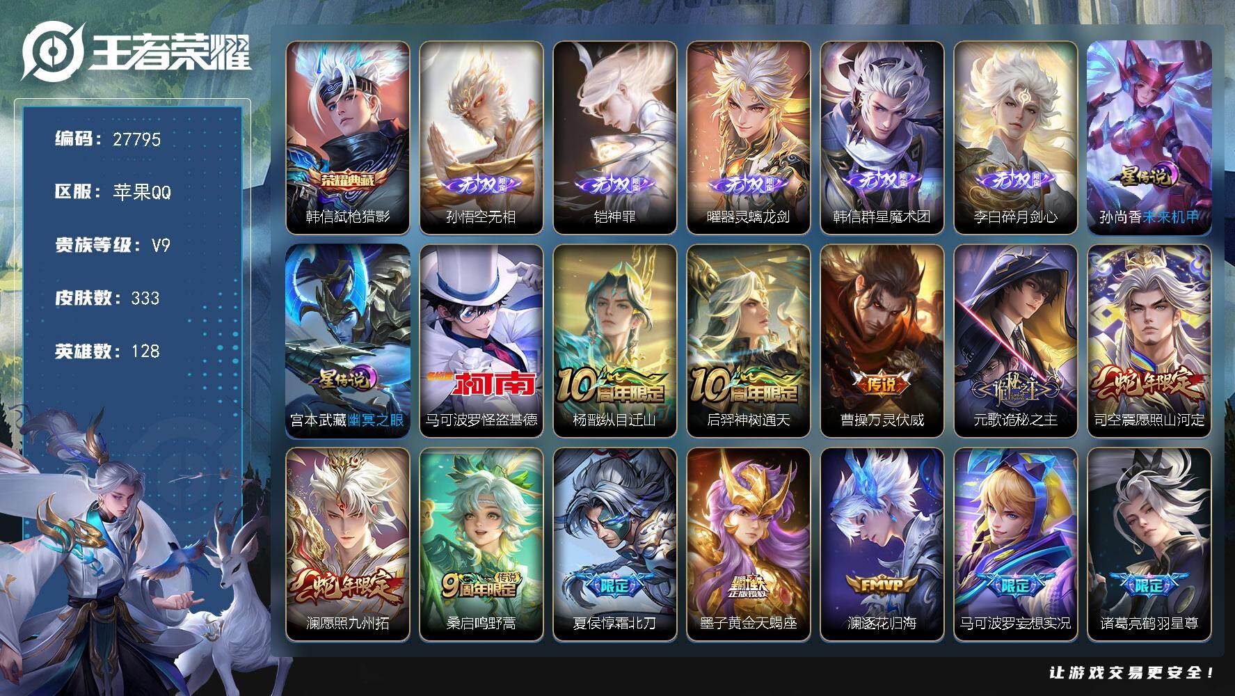 PX_2537868-可换绑【V9精品推荐·韩信苍金标·5无双·韩信典藏·怪盗基德·诡秘之主·炽霜斩·齐天大圣·浮生妄·时雨天司·傲雪梅枪·孙行者·逐梦之影·至尊宝·11万贵族积分·无二次】5961星币,幸运值241,32按键,2星传说,13王者印记,五级铭文290,无二次,苹果Q-V9-333皮肤-1典藏皮肤-5无双-1珍品传说-34传说-87史诗【英雄全皮】:孙权全皮,苍全皮,蒙恬全皮,司空震全皮,莱西奥全皮,空空儿全皮【荣耀典藏】:韩信弑枪猎影【无双皮肤】:孙悟空无相,铠神罪,曜器灵螭龙剑,韩信群星魔术团,李白碎月剑心【珍品传说】:马可波罗怪盗基德【星元皮肤】:宫本武藏幽冥之眼,孙尚香未来机甲【传说皮肤】:杨戬纵目迁山,后羿神树通天,曹操万灵伏威,元歌诡秘之主,司空震愿照山河定,澜愿照九州拓,桑启鸣野蒿,夏侯惇霜北刀,墨子黄金天蝎座,澜逐花归海,马可波罗妄想实况,诸葛亮鹤羽星尊,夏洛特浮生妄,孙悟空齐天大圣,李信山海炽霜斩,吕布怒海麟威,李白诗剑行,百里守约碎云,马超无双飞将,赵云淬星耀世,王昭君乞巧织情,小乔音你心动,李元芳飞鸢探春,诸葛亮时雨天司,铠绛天战甲,镜炽阳神光,虞姬启明星使,曜云鹰飞将,李信一念神魔,达摩黄金狮子座,梦奇胖达荣荣,孙尚香末日机甲,宫本武藏地狱之眼,孙悟空地狱火【限定皮肤】:夏侯惇霜北刀,姜子牙天穹之誓,李白谪仙醉月,狄仁杰阴阳师,赵云皇家上将,赵云百木心枪,墨子神迹守卫,孙尚香蔷薇恋人,元歌无心,马可波罗暗影游猎,马可波罗山海玄木吟,马可波罗妄想实况,狄仁杰魔术师,狄仁杰万华元夜,达摩星际陆战队,达摩沙漠行僧,项羽海滩派对,老夫子航海奇遇记,韩信逐梦之影,韩信飞衡,韩信傲雪梅枪,兰陵王金庭之子,花木兰默契交锋,孙悟空至尊宝,孙悟空孙行者,孙悟空齐天大圣,刘备百相守梦,李元芳匿光侦查者,李元芳云中旅人,虞姬启明星使,钟馗驱傩正仪,干将莫邪胡桃夹子,鬼谷子五谷丰年,诸葛亮时雨天司,诸葛亮鹤羽星尊,苏烈千军破阵,百里玄策原初追逐者,梦奇顽趣,沈梦溪大漠名商,裴擒虎李小龙,裴擒虎擒涛扼浪,李信山海炽霜斩,猪八戒猪悟能,嫦娥暖冬兔眠,鲁班大师探海日志,桑启海盐诗旅,夏洛特浮生妄,暃星界游侠,艾琳流音漫舞,司空震地狱燃心,阿古朵江河有灵,张良古海寻踪,蒙犽百解令,蒙恬荣光圣徽,鬼谷子天穹祈灯,李白碎月剑心,沈梦溪龙舞盛年,鲁班七号蔬乡物语,李元芳蔬乡物语,刘邦剑破天穹,程咬金群星魔术团,韩信群星魔术团,刘备异域游侠,周瑜熔金海岸【年限皮肤】:韩信飞衡,诸葛亮时雨天司,李信山海炽霜斩,马可波罗山海玄木吟,司空震愿照山河定,澜愿照九州拓【赛季限定】:狄仁杰万华元夜,钟馗驱傩正仪,苏烈千军破阵,达摩沙漠行僧,兰陵王金庭之子,沈梦溪大漠名商,李元芳云中旅人,桑启海盐诗旅,裴擒虎擒涛扼浪,鲁班大师探海日志,张良古海寻踪,鬼谷子天穹祈灯,刘邦剑破天穹,姜子牙天穹之誓,东皇太一噬灭天穹,太乙真人谧流熔炉,甄姬逆浪荇歌,亚瑟荣光之誓,百里玄策原初追逐者,梦奇顽趣,蒙恬荣光圣徽,牛魔星界战将【战令限定】:马可波罗暗影游猎,达摩星际陆战队,老夫子航海奇遇记,墨子神迹守卫,暃星界游侠,嫦娥暖冬兔眠,司空震地狱燃心,艾琳流音漫舞,鲁班七号蔬乡物语,李元芳蔬乡物语,周瑜百相守梦,孙策百相守梦,莱西奥光弋星穹,明世隐往忆晖光,周瑜线条小狗,小乔线条小狗【史诗皮肤】:周瑜线条小狗,小乔线条小狗,少司缘巫礼祀神,女娲万灵启世,莱西奥光弋星穹,公孙离涂山容容,西施织梦人,黄忠百相守梦,周瑜百相守梦,狂铁龙之律动,阿轲化蝶舞,苍狼魂孤将,赵怀真器灵浮梦炉,牛魔星界战将,李白谪仙醉月,马可波罗星界特工,鲁班七号蔬乡物语,蒙恬荣光圣徽,蒙犽百解令,阿古朵江河有灵,司空震地狱燃心,李元芳匿光侦查者,莱西奥末日机甲,刘禅电玩爆裂旋风,刘备百相守梦,马可波罗山海玄木吟,暃星界游侠,梦奇顽趣,元歌无心,鬼谷子五谷丰年,艾琳奇遇舞章,澜赏金猎手,赵云百木心枪,韩信傲雪梅枪,猪八戒猪悟能,孙悟空孙行者,沈梦溪月团寄思,老夫子航海奇遇记,百里玄策热力回旋,花木兰默契交锋,裴擒虎李小龙,百里玄策原初追逐者,马可波罗暗影游猎,孙尚香时之恋人,韩信飞衡,娜可露露晚萤,公孙离无限星赏官,狄仁杰鹰眼统帅,伽罗箭羽风息,阿轲节奏热浪,白起星夜王子,李元芳逐浪之夏,刘禅天才门将,蔡文姬舞动绿茵,百里守约特工魅影,安琪拉心灵骇客,雅典娜冰冠公主,亚瑟心灵战警,诸葛亮黄金分割率,兰陵王暗隐猎兽者,小乔缤纷独角兽,夏侯惇乘风破浪,韩信逐梦之影,刘邦德古拉伯爵,花木兰水晶猎龙者,孙悟空至尊宝,韩信白龙吟,张飞乱世虎臣,吕布末日机甲,李白千年之狐,曹操幽灵船长,刘禅绅士熊喵,墨子金属风暴,妲己女仆咖啡,妲己魅力维加斯,嬴政暗夜贵公子,孙尚香水果甜心,孙尚香蔷薇恋人,宫本武藏鬼剑武藏,廉颇地狱岩魂,狄仁杰魔术师,王昭君偶像歌手,甄姬冰雪圆舞曲,貂蝉圣诞恋歌,赵云未来纪元,赵云皇家上将,露娜紫霞仙子,鲁班七号电玩小子【其他皮肤】:妲己线条小狗,桑启线条小狗,蒙恬苍云破阵,安琪拉糖果风暴,虞姬溯影追猎,蚩奼极光幻客,曹操逐霄之志,艾琳鹤鸣心笺,孙权径山谋武,张良罗小黑战记,明世隐往忆晖光,亚瑟荣光之誓,哪吒罗小黑战记,桑启青衿临川,鬼谷子克喵,莱西奥踏浪烽翎,空空儿戏梦巡演,孙策百相守梦,云中君云械蓝图,甄姬逆浪荇歌,