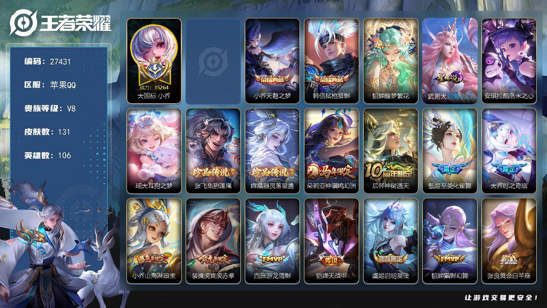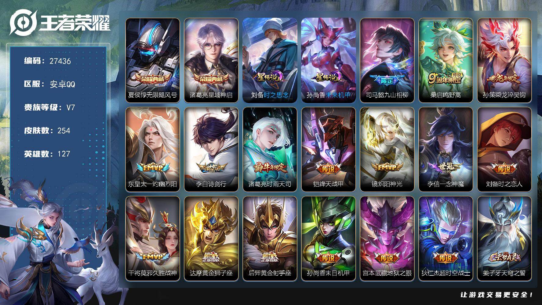 PX_2530598-??推荐V10·110传说·4典藏·8无双·5珍品·全皮大乔·全皮瑶·全皮王昭君·全皮不知火舞·紫瑶·太华红枫·金虎啸春天幕·棉花糖聚会天幕·雪境奇遇天幕·月之邀约天幕·可二次】YXw21501-安卓Q-128英雄-593皮肤-28王者印记-300铭文-贵族积分38w【贵族10】【4典藏·8无双·5珍品·6星传说·110传说·5天幕·24按键·764个性戳戳·234幸运值】【因赛季更新游戏段付以上号为准!】 【英雄全皮】:宫本武藏全皮,司马懿全皮,姜子牙全皮,刘邦全皮,孙权全皮,王昭君全皮,艾琳全皮,不知火舞全皮,娜可露露全皮,鬼谷子全皮,大乔全皮,狂铁全皮,瑶全皮,猪八戒全皮,敖隐全皮,曜全皮,鲁班大师全皮,澜全皮,镜全皮,阿古朵全皮,夏洛特全皮,司空震全皮,金蝉全皮,戈娅全皮,空空儿全皮,海诺全皮,少司缘全皮 【荣耀典藏】:李白鸣剑曳影,花木兰九霄神辉,貂蝉幻阙歌,瑶拾光映像 【无双皮肤】:孙悟空无相,曜器灵螭龙剑,甄姬雪境奇遇,公孙离离恨烟,不知火舞花合斗,小乔时之魔女,瑶真我赫兹,妲己青丘九尾 【珍品传说】:宫本武藏黑崎一护,安琪拉酷洛米之心,瑶大耳狗之梦,鲁班七号江户川柯南,马可波罗怪盗基德 【星元皮肤】:伽罗太华红枫,孙尚香未来机甲,瑶时之愿境,李白玉鸾吟,貂蝉金色仲夏夜,宫本武藏幽冥之眼 【天幕】:共赏芳华天幕,金虎啸春天幕,棉花糖聚会天幕,雪境奇遇天幕,月之邀约天幕 【传说皮肤】:王昭君长夜焕生,后羿神树通天,司马懿九山相柳,西施续相思,司空震愿照山河定,女娲愿照千秋盛,妲己愿照众生和,澜愿照九州拓,蔡文姬愿照福禄聚,虞姬愿照岁时盈,云缨幻光神枪,王昭君映山客,桑启鸣野蒿,夏侯惇霜北刀,朵莉亚心动手记,墨子黄金天蝎座,亚连落雪白狼,吕布曦玄引,貂蝉曦玄引,典韦战鼓燎原,孙尚香乘龙问璇玑,孙策乘龙淬吴钩,赵云乘龙铭钟鼎,马超琥珀纪元,铠琥珀纪元,澜逐花归海,艾琳觅芳踪,露娜霜月吟,孙膑小动物乐团,狄仁杰夜礼服假面,王昭君永恒水手月亮,甄姬至美化雀舞,大乔时之奇旅,鲁班七号时之奇旅,兰陵王影龙天霄,吕布遇见神鼓,宫本武藏惊梅引,云缨鹤归松栖,上官婉儿妄想奇谈,马可波罗妄想实况,东皇太一灼幽烈阳,诸葛亮鹤羽星尊,澜电玩雷克斯,亚瑟追逃游戏,安琪拉追逃游戏,张飞百相守梦,公孙离记忆之芯,夏洛特浮生妄,干将莫邪画中仙,花木兰燃星之曲,虞姬无限倾心,项羽无限倾心,伽罗炽翼辉光,孙悟空齐天大圣,小乔山海琳琅生,曜山海苍雷引,李信山海炽霜斩,吕布怒海麟威,李白诗剑行,狄仁杰神器狴犴令,不知火舞绯月行,王昭君星穹之声,百里守约碎云,娜可露露前尘镜,孙尚香音你闪耀,马可波罗深海之息,马超无双飞将,大乔挚爱花嫁,孙策挚爱之约,露娜启示之音,蔡文姬花朝如约,孙策末日机甲,瑶时之祈愿,裴擒虎寅虎赤拳,鲁班七号寅虎瑞焰,孙尚香异界灵契,貂蝉遇见胡旋,赵云淬星耀世,王昭君乞巧织情,西施游龙清影,曜李逍遥,,周瑜音你心动,小乔音你心动,李元芳飞鸢探春,公孙离祈雪灵祝,诸葛亮时雨天司,铠绛天战甲,镜炽阳神光,虞姬启明星使,孙悟空零号赤焰,关羽武圣,曜云鹰飞将,李信一念神魔,刘备时之恋人,伽罗太华,貂蝉猫影幻舞,张良黄金白羊座,干将莫邪久胜战神,虞姬云霓雀翎,达摩黄金狮子座,百里玄策白虎志,花木兰冠军飞将,梦奇胖达荣荣,后羿黄金射手座,貂蝉仲夏夜之梦,李白凤求凰,孙尚香末日机甲,宫本武藏地狱之眼,孙悟空地狱火,狄仁杰超时空战士 【限定皮肤】:公孙离离恨烟,夏侯惇霜北刀,蒙犽顽岩魄,大乔绒语心约,虞姬夏日便利店,姜子牙天穹之誓,杨戬破阵退雄兵,李白谪仙醉月,狄仁杰阴阳师,廉颇寅虎御盾,小乔山海琳琅生,赵云皇家上将,赵云引擎之心,赵云龙胆,墨子神迹守卫,妲己热情桑巴,妲己时之奇旅,嬴政白昼王子,孙尚香蔷薇恋人,孙尚香异界灵契,鲁班七号寅虎瑞焰,鲁班七号时之奇旅,庄周高山流水,高渐离死亡摇滚,孙膑寅虎展翼,扁鹊奇幻香踪,白起夜都怪侠,芈月白晶晶,吕布猎兽之王,吕布御风骁将,吕布遇见神鼓,周瑜赤莲之焰,元歌云间偶戏,元歌无心,夏侯惇朔风刀,甄姬至美化雀舞,典韦蓝屏警告,典韦岱宗,马可波罗逐梦之星,马可波罗暗影游猎,马可波罗深海之息,马可波罗山海玄木吟,马可波罗妄想实况,狄仁杰魔术师,狄仁杰万华元夜,狄仁杰神器狴犴令,达摩星际陆战队,达摩沙漠行僧,项羽海滩派对,项羽霸王别姬,项羽无限倾心,老夫子醍醐杖,老夫子航海奇遇记,关羽冰锋战神,关羽武圣,关羽百相守梦,貂蝉逐梦之音,貂蝉遇见胡旋,安琪拉追逃游戏,程咬金演武夺筹,露娜启示之音,刘邦夺宝奇兵,韩信傲雪梅枪,王昭君凤凰于飞,王昭君午后时光,王昭君星穹之声,兰陵王影龙天霄,兰陵王驯魔猎人,兰陵王金庭之子,花木兰青春决赛季,花木兰默契交锋,花木兰燃星之曲,不知火舞绯月行,娜可露露前尘镜,亚瑟潮玩骑士王,亚瑟追逃游戏,孙悟空美猴王,孙悟空至尊宝,孙悟空大圣娶亲,孙悟空零号赤焰,孙悟空孙行者,孙悟空齐天大圣,牛魔御旌,牛魔奔雷神使,后羿圣弓游侠,刘备百相守梦,张飞百相守梦,李元芳银河之约,李元芳匿光侦查者,李元芳云中旅人,虞姬霸王别姬,虞姬启明星使,虞姬无限倾心,钟馗驱傩正仪,杨玉环遇见飞天,杨玉环寅虎心曲,杨戬潮玩骑兵,女娲朔望之晖,干将莫邪真爱魔法,干将莫邪画中仙,雅典娜单词大作战,雅典娜黎明之约,蔡文姬繁星吟游,太乙真人华丽摇滚,鬼谷子原初探秘者,鬼谷子五谷丰