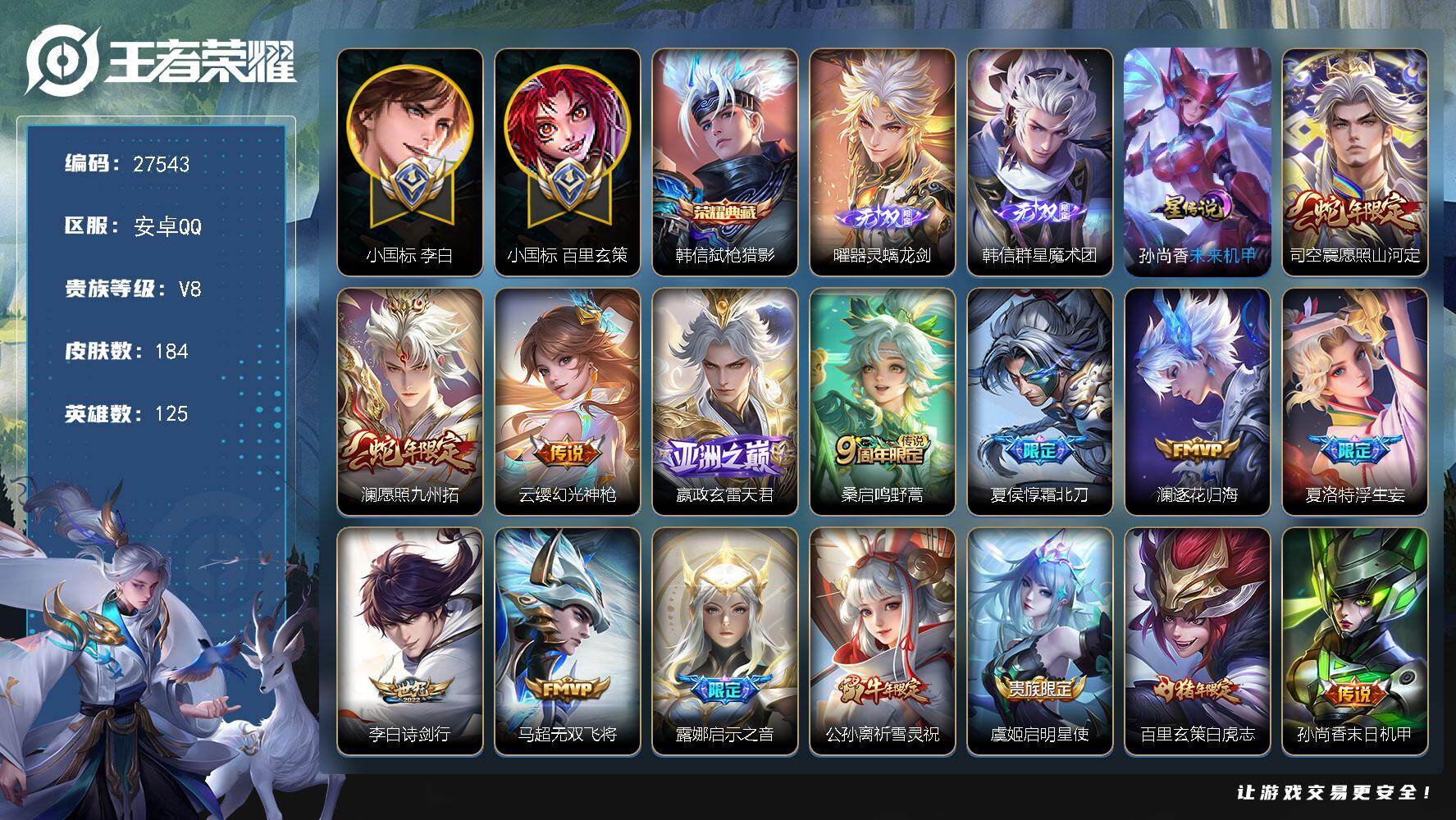 PX_2533488-可换绑【V9高质量精品号·金标万战猪八戒·万战韩信·5无双·李白全皮·马年全套·2典藏·嫦娥珍品·星君娄金·马超琥珀纪元·白虎志·凤求凰·傲雪梅枪·孙行者·神威·贵族积分11万·无二次包过】15按键,2天幕,4星传说,26王者印记,满级铭文,无二次包过CD19078,安卓Q-V9-348皮肤-2典藏皮肤-5无双-1珍品传说-27传说-104史诗【英雄全皮】:李白全皮,孙权全皮,敖隐全皮【荣耀典藏】:李白鸣剑曳影,花木兰九霄神辉【无双皮肤】:李信问心剑,甄姬雪境奇遇,公孙离离恨烟,韩信群星魔术团,李白碎月剑心【珍品传说】:嫦娥器灵落星盏【星元皮肤】:孙尚香未来机甲,孙悟空幽冥火,貂蝉金色仲夏夜,狄仁杰星际治安官【天幕】:天骥开鸿天幕,金虎啸春天幕【传说皮肤】:韩信踏浪归,云缨神骥越千峰,关羽神骥镇沧海,朵莉亚神骥鸣幻洲,狄仁杰神骥赴朔漠,貂蝉神骥聚万邦,马超神骥逐星野,李元芳星君娄金,马超琥珀纪元,孙膑小动物乐团,李白诗剑行,马超无双飞将,赵云淬星耀世,李元芳飞鸢探春,镜炽阳神光,虞姬启明星使,曜云鹰飞将,李信一念神魔,达摩黄金狮子座,百里玄策白虎志,梦奇胖达荣荣,貂蝉仲夏夜之梦,李白凤求凰,孙尚香末日机甲,宫本武藏地狱之眼,孙悟空地狱火,狄仁杰超时空战士【限定皮肤】:公孙离离恨烟,暃埋骨钱,姜子牙天穹之誓,李白谪仙醉月,狄仁杰阴阳师,赵云皇家上将,妲己时之彼端,嬴政优雅恋人,孙尚香蔷薇恋人,庄周高山流水,高渐离死亡摇滚,高渐离玩趣恶龙,钟无艳超时空战士,扁鹊奇幻香踪,白起夜都怪侠,芈月幻夜卜梦,元歌云间偶戏,元歌无心,夏侯惇朔风刀,甄姬落雪兰心,典韦岱宗,马可波罗山海玄木吟,狄仁杰魔术师,狄仁杰万华元夜,达摩沙漠行僧,项羽海滩派对,老夫子醍醐杖,关羽百相守梦,程咬金演武夺筹,露娜一生所爱,韩信傲雪梅枪,王昭君午后时光,兰陵王金庭之子,孙悟空至尊宝,孙悟空孙行者,牛魔御旌,后羿辉光之辰,后羿圣弓游侠,李元芳云中旅人,虞姬启明星使,钟馗驱傩正仪,杨戬潮玩骑兵,干将莫邪真爱魔法,雅典娜单词大作战,雅典娜黎明之约,鬼谷子原初探秘者,鬼谷子五谷丰年,黄忠火炮绅士,铠青龙志,苏烈玄武志,苏烈千军破阵,百里玄策白虎志,百里玄策原初追逐者,弈星混沌棋,梦奇顽趣,沈梦溪大漠名商,明世隐疑决卦,明世隐吟游魔法,裴擒虎天狼狩猎者,裴擒虎李小龙,裴擒虎擒涛扼浪,狂铁电玩高手,盾山御銮,盾山梦圆繁星,猪八戒猪悟能,上官婉儿梁祝,嫦娥拒霜思,嫦娥暖冬兔眠,蒙犽狂想玩偶喵,鲁班大师探海日志,盘古冰霜神祇,镜匿光追影者,桑启海盐诗旅,暃星界游侠,阿古朵江河有灵,张良古海寻踪,蒙恬荣光圣徽,鬼谷子天穹祈灯,李白碎月剑心,马超琥珀纪元,姬小满妄想食味,刘邦剑破天穹,韩信群星魔术团,镜青焰无极,刘备异域游侠,周瑜熔金海岸【年限皮肤】:李白凤求凰,后羿辉光之辰,苏烈玄武志,百里玄策白虎志,铠青龙志,典韦岱宗,马可波罗山海玄木吟【赛季限定】:牛魔御旌,盾山御銮,夏侯惇朔风刀,弈星混沌棋,明世隐疑决卦,老夫子醍醐杖,鬼谷子原初探秘者,狄仁杰万华元夜,程咬金演武夺筹,钟馗驱傩正仪,苏烈千军破阵,达摩沙漠行僧,兰陵王金庭之子,沈梦溪大漠名商,李元芳云中旅人,桑启海盐诗旅,裴擒虎擒涛扼浪,鲁班大师探海日志,张良古海寻踪,鬼谷子天穹祈灯,刘邦剑破天穹,姜子牙天穹之誓,东皇太一噬灭天穹,甄姬逆浪荇歌,百里玄策原初追逐者,雅典娜黎明之约,梦奇顽趣,蒙恬荣光圣徽,牛魔星界战将,项羽九幽镇关【战令限定】:蒙犽狂想玩偶喵,雅典娜单词大作战,元歌云间偶戏,干将莫邪真爱魔法,后羿圣弓游侠,黄忠火炮绅士,芈月幻夜卜梦,明世隐吟游魔法,白起夜都怪侠,狂铁电玩高手,王昭君午后时光,钟无艳超时空战士,甄姬落雪兰心,暃星界游侠,嫦娥暖冬兔眠,扁鹊奇幻香踪,杨戬潮玩骑兵,镜青焰无极,孙悟空神迹守卫,周瑜百相守梦,孙策百相守梦,周瑜线条小狗,小乔线条小狗【史诗皮肤】:明世隐百晓客,周瑜线条小狗,小乔线条小狗,项羽九幽镇关,百里玄策罗小黑战记,黄忠百相守梦,周瑜百相守梦,狂铁龙之律动,牛魔星界战将,李白谪仙醉月,暃埋骨钱,镜青焰无极,姬小满妄想食味,蒙恬荣光圣徽,阿古朵江河有灵,刘禅电玩爆裂旋风,关羽百相守梦,扁鹊奇幻香踪,盘古冰霜神祇,马可波罗山海玄木吟,暃星界游侠,梦奇顽趣,元歌无心,盾山梦圆繁星,鬼谷子五谷丰年,钟无艳超时空战士,狂铁电玩高手,明世隐吟游魔法,韩信傲雪梅枪,雅典娜黎明之约,黄忠火炮绅士,镜匿光追影者,嫦娥拒霜思,司马懿暗渊魔法,庄周高山流水,猪八戒猪悟能,孙悟空孙行者,干将莫邪真爱魔法,西施诗语江南,元歌云间偶戏,裴擒虎李小龙,百里玄策原初追逐者,蒙犽狂想玩偶喵,马超神威,橘右京修罗,不知火舞魅语,妲己时之彼端,典韦岱宗,上官婉儿梁祝,公孙离无限星赏官,狄仁杰鹰眼统帅,裴擒虎天狼狩猎者,伽罗箭羽风息,苏烈玄武志,露娜一生所爱,铠青龙志,大乔猫狗日记,孙策猫狗日记,阿轲节奏热浪,白起星夜王子,程咬金功夫厨神,李元芳逐浪之夏,刘禅天才门将,蔡文姬舞动绿茵,铠曙光守护者,百里守约特工魅影,后羿辉光之辰,安琪拉心灵骇客,雅典娜冰冠公主,亚瑟心灵战警,诸葛亮黄金分割率,兰陵王暗隐猎兽者,小乔缤纷独角兽,夏侯惇乘风破浪,刘邦德古拉伯爵,花木兰水晶猎龙者,孙悟空至尊宝,韩信白龙吟,张飞乱世虎臣,吕布末日机甲,李白千年