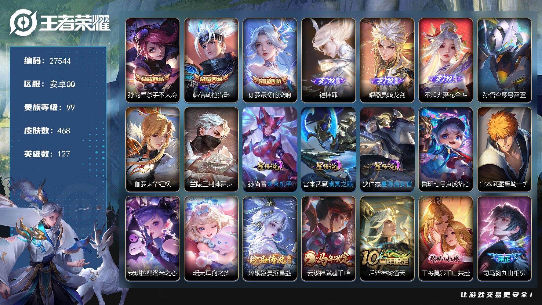PX_2531882-可换绑【V9顶级精品号推荐·孙尚香雅典娜全皮·牛年全套·火舞铠曜三无双·四珍品大耳狗之梦·三典藏·蛇年澜虞姬·落雪白狼·曦玄引·无限倾心·虎年鲁班·遇见胡璇·太华·白虎志·】,18按键,7星传说,16王者印记,五级铭文160,无二次,安卓Q-V9-468皮肤-3典藏皮肤-3无双-4珍品传说-38传说-147史诗【英雄全皮】:孙尚香全皮,刘邦全皮,孙权全皮,苍全皮,雅典娜全皮,猪八戒全皮,空空儿全皮【荣耀典藏】:孙尚香杀手不太冷,韩信弑枪猎影,伽罗最初的交响【无双皮肤】:铠神罪,曜器灵螭龙剑,不知火舞花合斗【珍品传说】:宫本武藏黑崎一护,安琪拉酷洛米之心,瑶大耳狗之梦,嫦娥器灵落星盏【星元皮肤】:宫本武藏幽冥之眼,孙尚香未来机甲,孙悟空零号雷霆,狄仁杰星际治安官,鲁班七号寅虎焰心,兰陵王荆棘舞步,伽罗太华红枫【传说皮肤】:云缨神骥越千峰,后羿神树通天,干将莫邪千山共赴,司马懿九山相柳,澜愿照九州拓,虞姬愿照岁时盈,云缨幻光神枪,王昭君映山客,桑启鸣野蒿,亚连落雪白狼,吕布曦玄引,貂蝉曦玄引,孙尚香乘龙问璇玑,赵云乘龙铭钟鼎,虞姬无限倾心,伽罗炽翼辉光,李信山海炽霜斩,百里守约碎云,孙尚香音你闪耀,鲁班七号寅虎瑞焰,孙尚香异界灵契,貂蝉遇见胡旋,西施游龙清影,兰陵王默契交锋,公孙离祈雪灵祝,诸葛亮时雨天司,镜炽阳神光,虞姬启明星使,孙悟空零号赤焰,曜云鹰飞将,李信一念神魔,伽罗太华,貂蝉猫影幻舞,张良黄金白羊座,百里玄策白虎志,孙尚香末日机甲,宫本武藏地狱之眼,狄仁杰超时空战士【限定皮肤】:暃埋骨钱,蒙犽顽岩魄,蔡文姬夏日便利店,大乔绒语心约,虞姬夏日便利店,姜子牙天穹之誓,杨戬破阵退雄兵,李白谪仙醉月,狄仁杰阴阳师,廉颇寅虎御盾,赵云皇家上将,墨子神迹守卫,妲己时之彼端,嬴政优雅恋人,嬴政白昼王子,孙尚香蔷薇恋人,孙尚香异界灵契,鲁班七号狮舞东方,鲁班七号寅虎瑞焰,庄周高山流水,阿轲迷踪丽影,孙膑天狼运算者,芈月白晶晶,芈月幻夜卜梦,吕布御风骁将,元歌云间偶戏,元歌无心,甄姬女儿国国王,甄姬游园惊梦,甄姬落雪兰心,典韦蓝屏警告,马可波罗暗影游猎,马可波罗山海玄木吟,狄仁杰魔术师,狄仁杰万华元夜,达摩星际陆战队,达摩沙漠行僧,项羽海滩派对,项羽霸王别姬,老夫子醍醐杖,老夫子航海奇遇记,貂蝉逐梦之音,貂蝉遇见胡旋,安琪拉魔法小厨娘,程咬金演武夺筹,刘邦夺宝奇兵,韩信飞衡,韩信傲雪梅枪,兰陵王默契交锋,兰陵王驯魔猎人,兰陵王金庭之子,花木兰青春决赛季,花木兰默契交锋,亚瑟潮玩骑士王,孙悟空大圣娶亲,孙悟空零号赤焰,孙悟空孙行者,牛魔奔雷神使,后羿如梦令,后羿圣弓游侠,张飞虎魄,李元芳银河之约,李元芳云中旅人,虞姬霸王别姬,虞姬启明星使,虞姬无限倾心,钟馗神迹守卫,钟馗驱傩正仪,杨玉环遇见飞天,杨玉环寅虎心曲,杨戬潮玩骑兵,干将莫邪冰霜恋舞曲,干将莫邪真爱魔法,雅典娜单词大作战,雅典娜黎明之约,蔡文姬繁星吟游,鬼谷子原初探秘者,鬼谷子五谷丰年,诸葛亮时雨天司,大乔白鹤梁神女,黄忠火炮绅士,铠青龙志,苏烈千军破阵,百里玄策白虎志,百里玄策原初追逐者,弈星混沌棋,梦奇顽趣,公孙离祈雪灵祝,沈梦溪大漠名商,明世隐疑决卦,裴擒虎李小龙,裴擒虎擒涛扼浪,米莱狄胡桃异想国,云中君纤云弄巧,李信山海炽霜斩,伽罗太华,伽罗天狼溯光者,伽罗炽翼辉光,猪八戒西部大镖客,猪八戒猪悟能,嫦娥拒霜思,嫦娥暖冬兔眠,西施玲珑珍味,蒙犽狂想玩偶喵,鲁班大师探海日志,镜匿光追影者,桑启海盐诗旅,暃星界游侠,艾琳女武神,艾琳流音漫舞,司空震地狱燃心,阿古朵江河有灵,张良古海寻踪,蒙犽百解令,蒙恬荣光圣徽,高渐离燃音魔法,妲己灵卜魔法,鬼谷子天穹祈灯,伽罗琥珀纪元,姬小满妄想食味,大乔乘龙忆丹青,孙尚香乘龙问璇玑,赵云乘龙铭钟鼎,吕布曦玄引,貂蝉曦玄引,亚连落雪白狼,沈梦溪龙舞盛年,鲁班七号蔬乡物语,李元芳蔬乡物语,刘邦剑破天穹,程咬金群星魔术团,镜青焰无极,项羽苍威无极,刘备异域游侠,芈月浮光幕影,周瑜熔金海岸,不知火舞花合斗 【年限皮肤】:百里玄策白虎志,铠青龙志,伽罗太华,韩信飞衡,公孙离祈雪灵祝,诸葛亮时雨天司,吕布御风骁将,牛魔奔雷神使,鲁班七号寅虎瑞焰,廉颇寅虎御盾,杨玉环寅虎心曲,李信山海炽霜斩,马可波罗山海玄木吟,孙尚香乘龙问璇玑,赵云乘龙铭钟鼎,大乔乘龙忆丹青,澜愿照九州拓,虞姬愿照岁时盈【赛季限定】:弈星混沌棋,明世隐疑决卦,老夫子醍醐杖,鬼谷子原初探秘者,狄仁杰万华元夜,程咬金演武夺筹,钟馗驱傩正仪,苏烈千军破阵,达摩沙漠行僧,兰陵王金庭之子,沈梦溪大漠名商,李元芳云中旅人,桑启海盐诗旅,裴擒虎擒涛扼浪,鲁班大师探海日志,张良古海寻踪,鬼谷子天穹祈灯,刘邦剑破天穹,姜子牙天穹之誓,东皇太一噬灭天穹,太乙真人谧流熔炉,钟馗虚灵犬护,甄姬逆浪荇歌,亚瑟荣光之誓,百里玄策原初追逐者,雅典娜黎明之约,梦奇顽趣,蒙恬荣光圣徽,牛魔星界战将,项羽九幽镇关【战令限定】:嬴政白昼王子,典韦蓝屏警告,鲁班七号狮舞东方,钟馗神迹守卫,兰陵王驯魔猎人,李元芳银河之约,阿轲迷踪丽影,刘邦夺宝奇兵,马可波罗暗影游猎,猪八戒西部大镖客,蒙犽狂想玩偶喵,雅典娜单词大作战,元歌云间偶戏,亚瑟潮玩骑士王,米莱狄胡桃异想国,达摩星际陆战队,老夫子航海奇遇记,墨子神迹守卫,干将莫邪真爱
