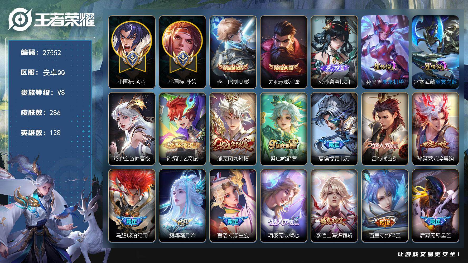 PX_2531854-可换绑【精品战力号·对抗路53段·孙策小国标1.37万+全皮·小国标项羽1.1万·1.2省三姬小满·1w战力马超·公孙离无双·两典藏·蛇年澜·霜北刀·曦玄引·浮生妄·无限倾心·如梦令·青龙志】,3641星币,17按键,3星传说,1天幕,15王者印记,五级铭文220,无二次,安卓Q-V8-286皮肤-2典藏皮肤-1无双-1珍品传说-28传说-82史诗【英雄全皮】:孙权全皮,孙策全皮,敖隐全皮,夏洛特全皮,赵怀真全皮,空空儿全皮,海诺全皮【荣耀典藏】:李白鸣剑曳影,关羽赤影疾锋【无双皮肤】:公孙离离恨烟【珍品传说】:孙策时之奇旅【小国标】:小国标项羽,小国标孙策【星元皮肤】:貂蝉金色仲夏夜,宫本武藏幽冥之眼,孙尚香未来机甲【天幕】:铃舟系梦天幕【传说皮肤】:澜愿照九州拓,桑启鸣野蒿,夏侯惇霜北刀,吕布曦玄引,孙策乘龙淬吴钩,马超琥珀纪元,露娜霜月吟,夏洛特浮生妄,项羽无限倾心,李信山海炽霜斩,百里守约碎云,后羿无尽星芒,马超无双飞将,孙策挚爱之约,孙策末日机甲,西施游龙清影,李元芳飞鸢探春,镜炽阳神光,虞姬启明星使,曜云鹰飞将,李信一念神魔,刘备时之恋人,干将莫邪久胜战神,达摩黄金狮子座,貂蝉仲夏夜之梦,孙尚香末日机甲,宫本武藏地狱之眼,孙悟空地狱火【限定皮肤】:公孙离离恨烟,夏侯惇霜北刀,蒙犽顽岩魄,蔡文姬夏日便利店,大乔绒语心约,虞姬夏日便利店,姜子牙天穹之誓,狄仁杰阴阳师,赵云皇家上将,元歌无心,马可波罗暗影游猎,马可波罗山海玄木吟,狄仁杰魔术师,狄仁杰万华元夜,达摩沙漠行僧,项羽海滩派对,项羽无限倾心,老夫子醍醐杖,程咬金演武夺筹,王昭君午后时光,兰陵王金庭之子,后羿如梦令,后羿无尽星芒,李元芳云中旅人,虞姬启明星使,钟馗驱傩正仪,雅典娜黎明之约,鬼谷子原初探秘者,鬼谷子五谷丰年,铠青龙志,苏烈千军破阵,百里玄策原初追逐者,梦奇顽趣,沈梦溪星空之诺,沈梦溪大漠名商,裴擒虎李小龙,裴擒虎擒涛扼浪,狂铁电玩高手,云中君纤云弄巧,李信山海炽霜斩,孙策挚爱之约,上官婉儿神器万象笔,嫦娥拒霜思,西施玲珑珍味,鲁班大师探海日志,桑启海盐诗旅,夏洛特浮生妄,艾琳女武神,赵怀真鹤归松栖,司空震地狱燃心,阿古朵江河有灵,张良古海寻踪,蒙犽百解令,蒙恬荣光圣徽,高渐离燃音魔法,妲己灵卜魔法,鬼谷子天穹祈灯,马超琥珀纪元,姬小满妄想食味,孙策乘龙淬吴钩,吕布曦玄引,沈梦溪龙舞盛年,刘邦剑破天穹,程咬金群星魔术团,海诺心动手记,周瑜熔金海岸【年限皮肤】:铠青龙志,李信山海炽霜斩,马可波罗山海玄木吟,孙策乘龙淬吴钩,澜愿照九州拓【赛季限定】:老夫子醍醐杖,鬼谷子原初探秘者,狄仁杰万华元夜,程咬金演武夺筹,钟馗驱傩正仪,苏烈千军破阵,达摩沙漠行僧,兰陵王金庭之子,沈梦溪大漠名商,李元芳云中旅人,桑启海盐诗旅,裴擒虎擒涛扼浪,鲁班大师探海日志,张良古海寻踪,鬼谷子天穹祈灯,刘邦剑破天穹,姜子牙天穹之誓,东皇太一噬灭天穹,太乙真人谧流熔炉,钟馗虚灵犬护,甄姬逆浪荇歌,亚瑟荣光之誓,百里玄策原初追逐者,雅典娜黎明之约,梦奇顽趣,蒙恬荣光圣徽,牛魔星界战将,项羽九幽镇关【战令限定】:沈梦溪星空之诺,马可波罗暗影游猎,狂铁电玩高手,王昭君午后时光,西施玲珑珍味,司空震地狱燃心,高渐离燃音魔法,妲己灵卜魔法,蔡文姬夏日便利店,虞姬夏日便利店,亚连破空之剑,孙悟空神迹守卫,孙膑茶境仙,马超访茗客,周瑜百相守梦,孙策百相守梦,莱西奥光弋星穹,明世隐往忆晖光,周瑜线条小狗【史诗皮肤】:明世隐百晓客,周瑜线条小狗,项羽九幽镇关,女娲万灵启世,莱西奥光弋星穹,公孙离涂山容容,黄忠百相守梦,周瑜百相守梦,狂铁龙之律动,赵怀真器灵浮梦炉,弈星万物之道,孙膑茶境仙,牛魔星界战将,弈星炽弈燎原,亚连破空之剑,大司命东方月初,蒙犽顽岩魄,蔡文姬夏日便利店,海诺心动手记,姬小满妄想食味,蒙恬荣光圣徽,高渐离燃音魔法,妲己灵卜魔法,蒙犽百解令,阿古朵江河有灵,司空震地狱燃心,赵怀真鹤归松栖,刘禅电玩爆裂旋风,马可波罗山海玄木吟,梦奇顽趣,元歌无心,上官婉儿神器万象笔,鬼谷子五谷丰年,狂铁电玩高手,高渐离天秀音浪,夏洛特永昼,雅典娜黎明之约,嫦娥拒霜思,司马懿暗渊魔法,钟馗乐园奇幻夜,云中君纤云弄巧,裴擒虎李小龙,百里玄策原初追逐者,马可波罗暗影游猎,瑶遇见神鹿,不知火舞魅语,后羿如梦令,娜可露露晚萤,狄仁杰鹰眼统帅,铠青龙志,孙策猫狗日记,阿轲节奏热浪,白起星夜王子,李元芳逐浪之夏,刘禅天才门将,蔡文姬舞动绿茵,安琪拉心灵骇客,雅典娜冰冠公主,诸葛亮黄金分割率,兰陵王暗隐猎兽者,夏侯惇乘风破浪,刘邦德古拉伯爵,花木兰水晶猎龙者,韩信白龙吟,张飞乱世虎臣,吕布末日机甲,李白千年之狐,曹操幽灵船长,刘禅绅士熊喵,墨子金属风暴,墨子龙骑士,妲己女仆咖啡,妲己魅力维加斯,嬴政摇滚巨星,嬴政暗夜贵公子,孙尚香水果甜心,宫本武藏鬼剑武藏,廉颇地狱岩魂,狄仁杰魔术师,王昭君偶像歌手,甄姬冰雪圆舞曲,赵云未来纪元,赵云皇家上将,露娜紫霞仙子 【其他皮肤】:兰陵王雾影缉谜,虞姬溯影追猎,蚩奼极光幻客,曹操逐霄之志,艾琳鹤鸣心笺,孙权径山谋武,明世隐往忆晖光,亚瑟荣光之誓,鬼谷子克喵,莱西奥踏浪烽翎,空空儿戏梦巡演,庄周锦麟游梦,孙策百相守梦,甄姬逆浪荇歌,白起死霸装,露娜命运加冕,阿古朵布丁狗之约,张良灵野札记,钟馗虚灵犬护,明