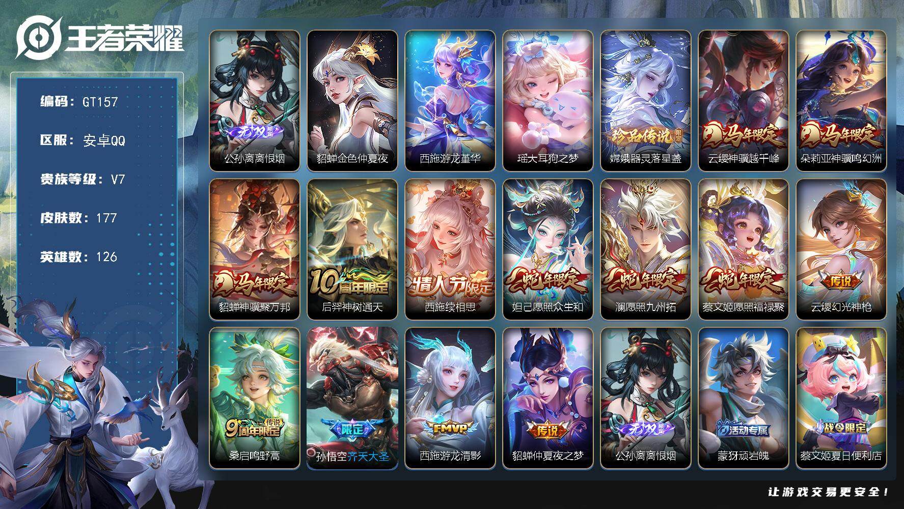 PX_2553538-可换绑【精品女号·西施全皮·无双公孙离·珍品瑶嫦娥·马限貂蝉朵莉亚云樱·蛇限妲己蔡文姬·】,幸运值300,18按键,2星传说,5王者印记,五级铭文120,无二次,安卓Q-V7-177皮肤-1无双-2珍品传说-13传说-52史诗【英雄全皮】:孙权全皮,敖隐全皮,西施全皮,空空儿全皮,影全皮【无双皮肤】:公孙离离恨烟【珍品传说】:瑶大耳狗之梦,嫦娥器灵落星盏【星元皮肤】:貂蝉金色仲夏夜,西施游龙堇华【传说皮肤】:云缨神骥越千峰,朵莉亚神骥鸣幻洲,貂蝉神骥聚万邦,后羿神树通天,西施续相思,妲己愿照众生和,澜愿照九州拓,蔡文姬愿照福禄聚,云缨幻光神枪,桑启鸣野蒿,孙悟空齐天大圣,西施游龙清影,貂蝉仲夏夜之梦【限定皮肤】:公孙离离恨烟,蒙犽顽岩魄,蔡文姬夏日便利店,虞姬夏日便利店,姜子牙天穹之誓,狄仁杰阴阳师,赵云皇家上将,阿轲迷踪丽影,元歌云间偶戏,元歌无心,狄仁杰魔术师,项羽海滩派对,孙悟空齐天大圣,李元芳云中旅人,裴擒虎擒涛扼浪,西施玲珑珍味,西施至美乘鲤谣,桑启海盐诗旅,鬼谷子天穹祈灯,姬小满妄想食味,刘邦剑破天穹,程咬金群星魔术团,周瑜熔金海岸【年限皮肤】:妲己愿照众生和,澜愿照九州拓,蔡文姬愿照福禄聚【赛季限定】:李元芳云中旅人,桑启海盐诗旅,裴擒虎擒涛扼浪,鬼谷子天穹祈灯,刘邦剑破天穹,姜子牙天穹之誓,东皇太一噬灭天穹,太乙真人谧流熔炉,钟馗虚灵犬护,亚瑟荣光之誓,项羽九幽镇关【战令限定】:阿轲迷踪丽影,元歌云间偶戏,西施玲珑珍味,蔡文姬夏日便利店,虞姬夏日便利店,百里守约百相守梦,老夫子百相守梦,刘禅鸭鸭历险记,沈梦溪鸭鸭历险记,周瑜百相守梦,孙策百相守梦,莱西奥光弋星穹,明世隐往忆晖光,周瑜线条小狗,小乔线条小狗【史诗皮肤】:明世隐百晓客,周瑜线条小狗,小乔线条小狗,项羽九幽镇关,女娲万灵启世,莱西奥光弋星穹,公孙离涂山容容,西施织梦人,朵莉亚幻珠鲛人,黄忠百相守梦,钟无艳戍鼓铭心,周瑜百相守梦,狂铁龙之律动,刘禅鸭鸭历险记,阿轲化蝶舞,苍狼魂孤将,百里守约百相守梦,蒙犽顽岩魄,蔡文姬夏日便利店,姬小满妄想食味,西施至美乘鲤谣,元歌无心,貂蝉唤灵魅影,西施诗语江南,元歌云间偶戏,瑶遇见神鹿,阿轲迷踪丽影,小乔青蛇,大乔白蛇,娜可露露晚萤,公孙离无限星赏官,狄仁杰鹰眼统帅,大乔猫狗日记,白起星夜王子,程咬金功夫厨神,李元芳逐浪之夏,蔡文姬舞动绿茵,安琪拉心灵骇客,雅典娜冰冠公主,小乔缤纷独角兽,刘邦德古拉伯爵,花木兰水晶猎龙者,吕布末日机甲,曹操幽灵船长,妲己女仆咖啡,孙尚香水果甜心,廉颇地狱岩魂,狄仁杰魔术师,王昭君偶像歌手,甄姬冰雪圆舞曲,貂蝉圣诞恋歌,赵云皇家上将,露娜紫霞仙子【其他皮肤】:影百相守梦,妲己线条小狗,桑启线条小狗,蒙恬苍云破阵,安琪拉糖果风暴,虞姬溯影追猎,蚩奼极光幻客,艾琳鹤鸣心笺,孙权径山谋武,张良罗小黑战记,明世隐往忆晖光,亚瑟荣光之誓,哪吒罗小黑战记,鬼谷子克喵,莱西奥踏浪烽翎,高渐离落日弦歌,空空儿戏梦巡演,庄周锦麟游梦,孙策百相守梦,白起死霸装,雅典娜潮玩士官长,露娜命运加冕,阿古朵布丁狗之约,沈梦溪鸭鸭历险记,钟馗虚灵犬护,戈娅玫蓝誓约,明世隐景韶洛都,少司缘灵卦秘语,东皇太一金福满堂,西施雪境奇遇,影魅影绮裳,太乙真人谧流熔炉,吕布逐霄战戟,老夫子百相守梦,东皇太一噬灭天穹,虞姬夏日便利店,周瑜熔金海岸,姜子牙天穹之誓,大司命暗都幽影,程咬金群星魔术团,刘邦剑破天穹,鬼谷子天穹祈灯,姬小满零食大作战,西施玲珑珍味,太乙真人劲辣红锅,裴擒虎擒涛扼浪,桑启海盐诗旅,戈娅危途狂花,李元芳云中旅人,蒙犽胡桃狂想曲,马可波罗潮玩牛仔,鲁班大师乓乓大师,张良缤纷绘卷,刘禅秘密基地,鲁班七号黑桃队长,沈梦溪鲨炮海盗猫,孙膑归虚梦演,明世隐虹云星官,大乔守护之力,鬼谷子幻乐之宴,李白敏锐之力,孙尚香沉稳之力,王昭君幻想奇妙夜,关羽龙腾万里,狄仁杰阴阳师,后羿阿尔法小队,花木兰兔女郎,亚瑟死亡骑士,姜子牙时尚教父,孙膑天使之翼,安琪拉玩偶对对碰,芈月红桃皇后,赵云白执事,达摩大发明家,露娜哥特玫瑰,韩信街头霸王,韩信教廷特使,项羽海滩派对,暃碧珀绯影,金蝉前尘,云缨赤焰之缨,澜孤猎,蒙犽归虚梦演,鲁班大师归虚梦演,西施归虚梦演,曜归虚梦演,瑶森,嫦娥露花倒影,上官婉儿修竹墨客,伽罗花见巫女,弈星踏雪寻梅,裴擒虎街头旋风,公孙离花间舞,明世隐占星师,百里守约绝影神枪,大乔伊势巫女,苍维京掠夺者,马可波罗激情绿茵,蔡文姬蔷薇王座,李元芳特种部队,李白范海辛,王昭君精灵公主,花木兰剑舞者,貂蝉异域舞娘,钟无艳生化警戒,鲁班七号木偶奇遇记,鲁班七号福禄兄弟