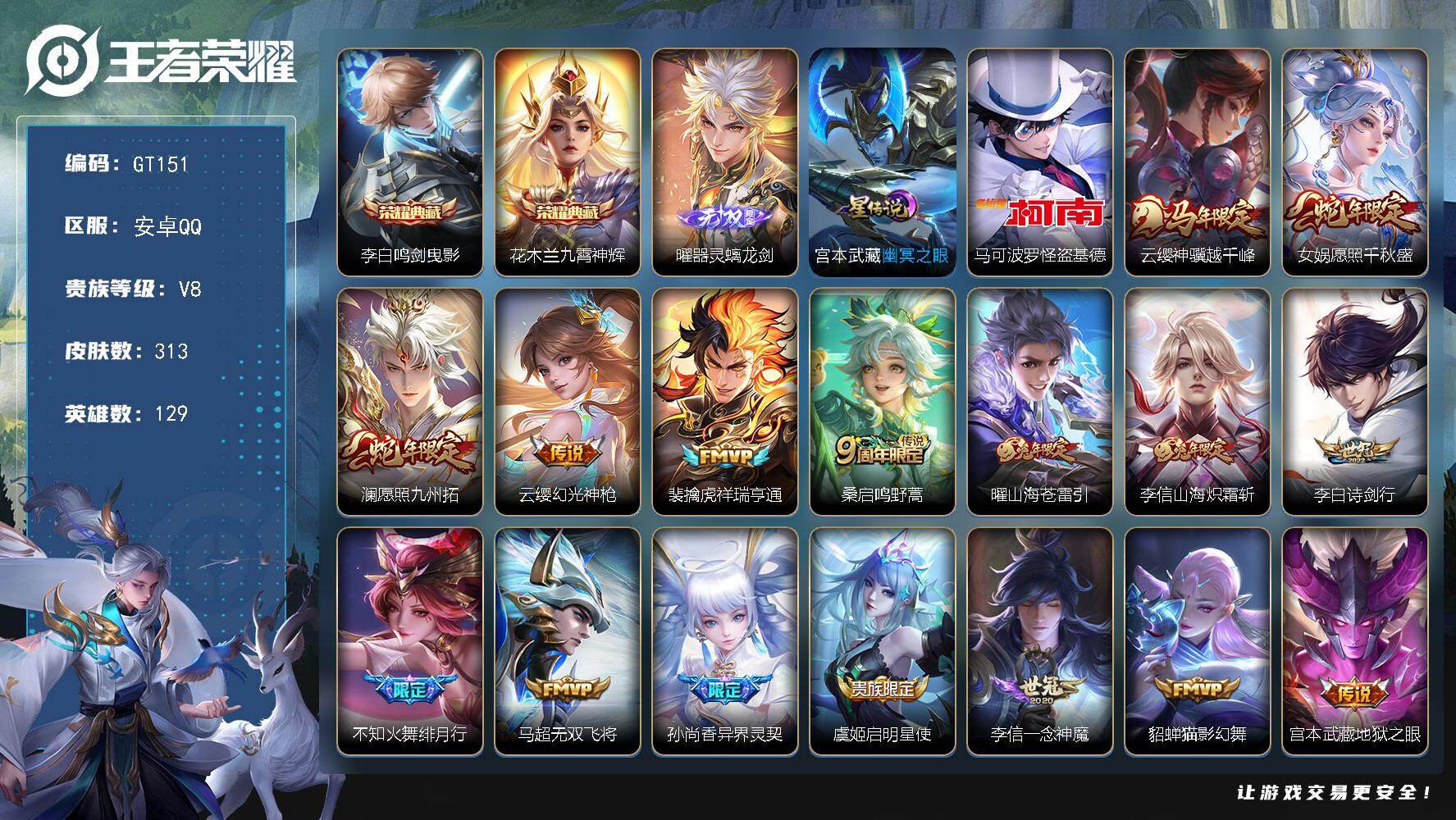 PX_2561479-实名:,可修改,贵族等级:,V7,英雄数:,128,皮肤数:,308,荣耀水晶:,鸣剑·曳影,弑枪猎影,珍品传说:,黑崎一护,传说皮:,冠军飞将,久胜战神,炽阳神光,一念神魔,仲夏夜之梦,神树通天,限定皮:,遇见飞天,李小龙,梁祝,朱雀志,至尊宝,大圣娶亲,高山流水,孙行者,五谷丰年,鸣野蒿,逐霄战戟,愿照·众生和