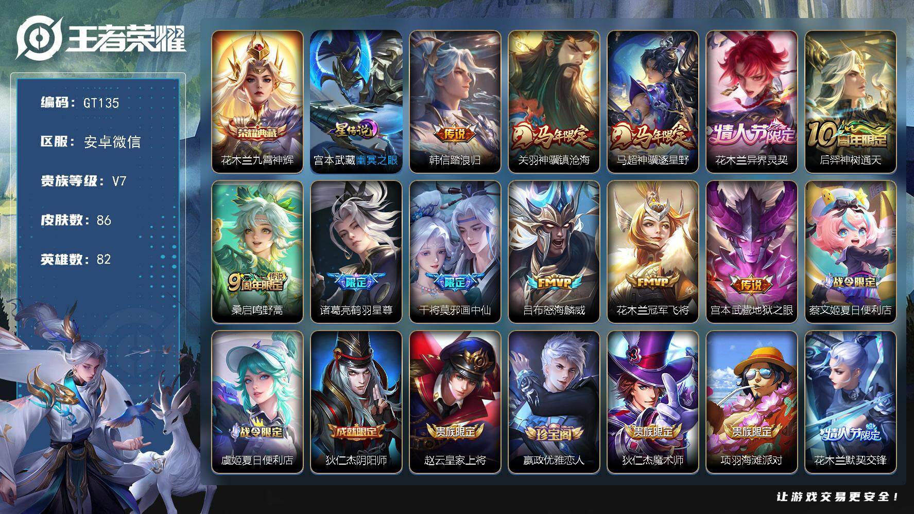 PX_2559895-可换绑【高性价比账号·花木兰典藏·马年关羽马超·鹤羽星尊·画中仙·默契交锋】,4按键,1星传说,3王者印记,100五级铭文,可二次安卓WX-V7-86皮肤-1典藏皮肤-11传说-20史诗【英雄全皮】:敖隐全皮【荣耀典藏】:花木兰九霄神辉【星元皮肤】:宫本武藏幽冥之眼【传说皮肤】:韩信踏浪归,关羽神骥镇沧海,马超神骥逐星野,花木兰异界灵契,后羿神树通天,桑启鸣野蒿,诸葛亮鹤羽星尊,干将莫邪画中仙,吕布怒海麟威,花木兰冠军飞将,宫本武藏地狱之眼【限定皮肤】:蔡文姬夏日便利店,虞姬夏日便利店,狄仁杰阴阳师,赵云皇家上将,嬴政优雅恋人,狄仁杰魔术师,项羽海滩派对,花木兰默契交锋,干将莫邪画中仙,诸葛亮鹤羽星尊,裴擒虎李小龙,艾琳流音漫舞,关羽决胜骁骑【赛季限定】:东皇太一噬灭天穹,甄姬逆浪荇歌,亚瑟荣光之誓【战令限定】:艾琳流音漫舞,蔡文姬夏日便利店,虞姬夏日便利店,莱西奥光弋星穹,明世隐往忆晖光,周瑜线条小狗,小乔线条小狗【史诗皮肤】:周瑜线条小狗,小乔线条小狗,莱西奥光弋星穹,狂铁龙之律动,蔡文姬夏日便利店,关羽决胜骁骑,花木兰默契交锋,裴擒虎李小龙,狄仁杰鹰眼统帅,百里守约特工魅影,雅典娜冰冠公主,兰陵王暗隐猎兽者,花木兰水晶猎龙者,李白千年之狐,曹操幽灵船长,嬴政优雅恋人,宫本武藏鬼剑武藏,狄仁杰魔术师,甄姬冰雪圆舞曲,貂蝉圣诞恋歌,赵云皇家上将【其他皮肤】:影百相守梦,鲁班七号班班快跑,虞姬溯影追猎,蚩奼极光幻客,曹操逐霄之志,艾琳鹤鸣心笺,明世隐往忆晖光,亚瑟荣光之誓,鬼谷子克喵,莱西奥踏浪烽翎,甄姬逆浪荇歌,露娜命运加冕,东皇太一噬灭天穹,虞姬夏日便利店,大司命暗都幽影,艾琳流音漫舞,鲁班大师乓乓大师,小乔丁香结,王昭君幻想奇妙夜,关羽龙腾万里,狄仁杰阴阳师,宫本武藏万象初新,花木兰兔女郎,达摩拳王,孙膑天使之翼,扁鹊救世之瞳,白起白色死神,韩信街头霸王,项羽海滩派对,暃碧珀绯影,云缨赤焰之缨,司空震启蛰,澜孤猎,镜冰刃幻境,马超幸存者,盘古创世神祝,上官婉儿修竹墨客,李信灼热之刃,裴擒虎街头旋风,公孙离花间舞,百里守约绝影神枪,铠龙域领主,干将莫邪第七人偶,马可波罗激情绿茵,夏侯惇战争骑士,钟馗地府判官,李白范海辛,兰陵王隐刃,孙悟空西部大镖客,张良天堂福音,花木兰剑舞者,貂蝉异域舞娘