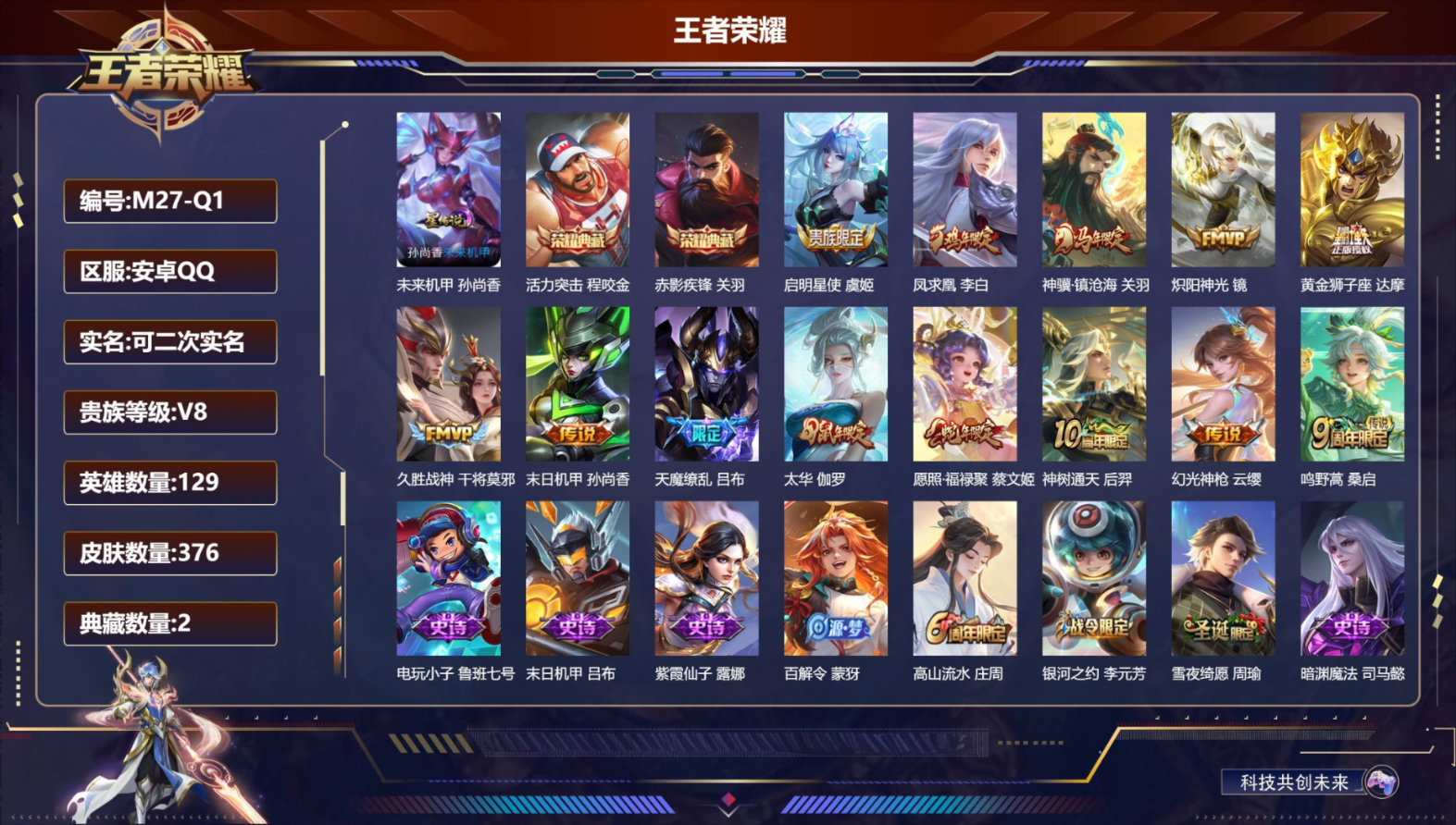 PX_2564886-实名:,可修改,贵族等级:,V9,英雄数:,129,皮肤数:,443,荣耀水晶:,天鹅之梦,倪克斯神谕,鸣剑·曳影,神鉴启示录,无双皮:,问心剑,珍品传说:,怪盗基德,沧流箭,传说皮:,黄金狮子座,黄金射手座,绛天战甲,久胜战神,炽阳神光,一念神魔,云霓雀翎,末日机甲-孙尚香,音你心动-小乔,零号·赤焰,地狱之眼,飞鸢探春,胖达荣荣,李逍遥,乞巧织情,时之恋人-刘备,淬星耀世,超时空战士-狄仁杰,花朝如约,碎云,神器·狴犴令,山海·苍雷引,澜逐花归海,琥珀纪元马超,乘龙·问璇玑,落雪白狼,黄金天蝎座,神树通天,长夜焕生,神骥·赴朔漠,神骥·鸣幻洲,限定皮:,遇见飞天,李小龙,梁祝,引擎之心,烈魂,魔法小厨娘,辉光之辰,白晶晶,时之彼端,青春决赛季,冰霜恋舞曲,寅虎·御盾,白虎志,青龙志,朱雀志,至尊宝,大圣娶亲,高山流水,猪悟能,傲雪梅枪,寅虎·赤拳,五谷丰年,梦圆繁星,山海·玄木吟,山海·碧波行,至美·乘鲤谣,逐霄战戟,愿照·岁时盈