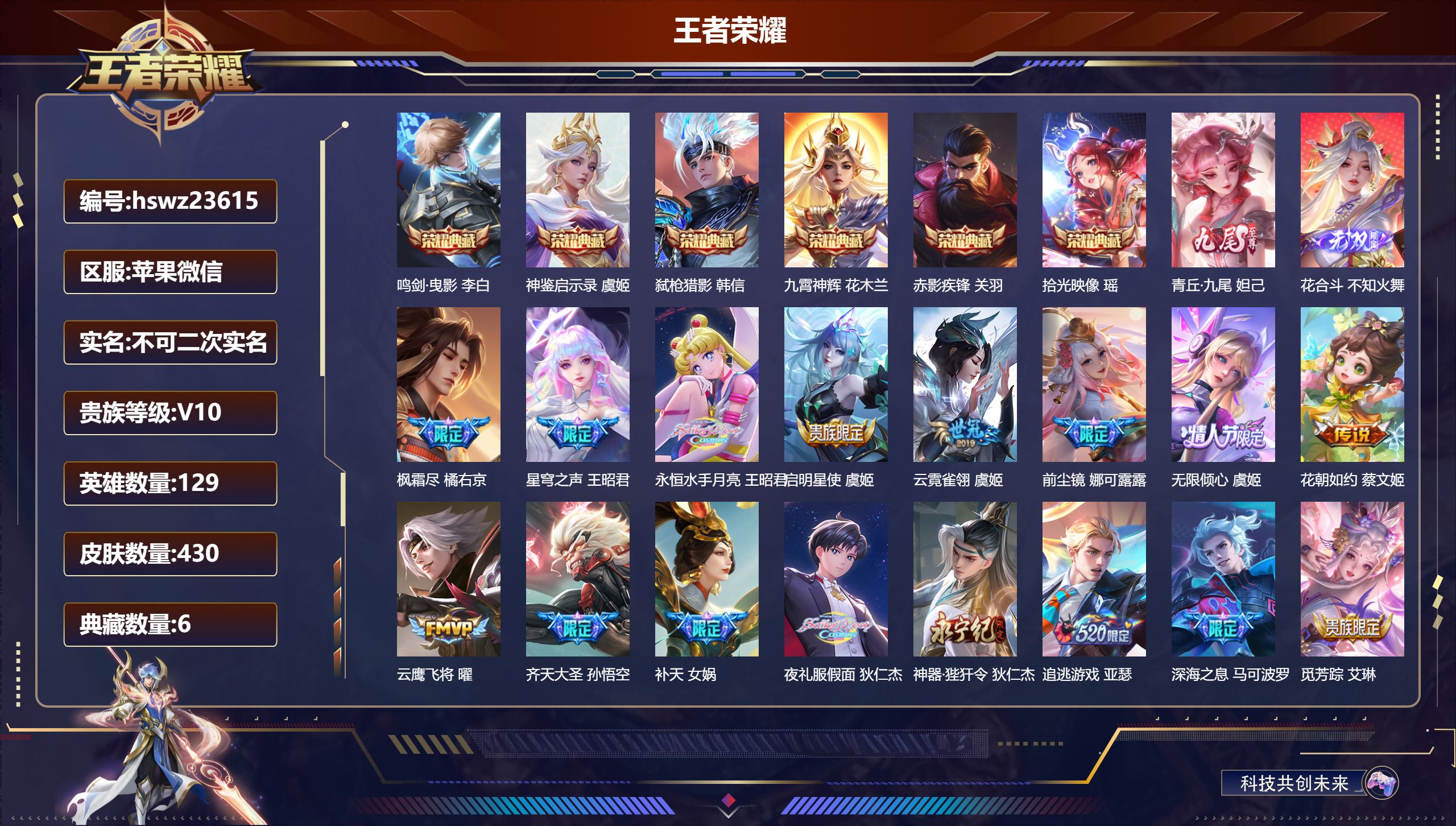 PX_2553466-可换绑【精品v10号·金标万战露娜·花木兰全皮·蛇年全套·5典藏含武则天·4珍品·梅西·3星传说·】313戳戳,29按键,3星传说,8王者印记,180五级铭文,无二次,苹果Q-V10-458皮肤-4典藏皮肤-1典藏英雄-4珍品传说-39传说-142史诗【英雄全皮】:刘邦全皮,孙权全皮,花木兰全皮,鬼谷子全皮,苏烈全皮,敖隐全皮,夏洛特全皮,司空震全皮,空空儿全皮,影全皮【荣耀典藏】:武则天英雄,孙悟空全息碎影,夏侯惇无限飓风号,花木兰九霄神辉,吕布千魇归渊【珍品传说】:瑶大耳狗之梦,张飞兔狲蓬尾,孙策时之奇旅,马可波罗怪盗基德【星元皮肤】:武则天幻海之心,孙悟空幽冥火,貂蝉金色仲夏夜【传说皮肤】:花木兰异界灵契,后羿神树通天,西施续相思,杨玉环星之鸣奏,司空震愿照山河定,女娲愿照千秋盛,妲己愿照众生和,澜愿照九州拓,蔡文姬愿照福禄聚,虞姬愿照岁时盈,云缨幻光神枪,桑启鸣野蒿,艾琳觅芳踪,露娜霜月吟,夏洛特浮生妄,花木兰燃星之曲,孙尚香异界灵契,赵云淬星耀世,镜炽阳神光,虞姬启明星使,曜云鹰飞将,李信一念神魔,刘备时之恋人,貂蝉猫影幻舞,张良黄金白羊座,干将莫邪久胜战神,虞姬云霓雀翎,达摩黄金狮子座,百里玄策白虎志,花木兰冠军飞将,梦奇胖达荣荣,后羿黄金射手座,貂蝉仲夏夜之梦,李白凤求凰,孙尚香末日机甲,宫本武藏地狱之眼,孙悟空地狱火,武则天海洋之心,狄仁杰超时空战士【限定皮肤】:姜子牙天穹之誓,狄仁杰阴阳师,赵云皇家上将,赵云引擎之心,墨子神迹守卫,妲己热情桑巴,嬴政优雅恋人,嬴政白昼王子,孙尚香蔷薇恋人,孙尚香异界灵契,鲁班七号狮舞东方,庄周高山流水,高渐离玩趣恶龙,阿轲迷踪丽影,芈月重明,芈月白晶晶,吕布猎兽之王,吕布御风骁将,周瑜赤莲之焰,元歌云间偶戏,元歌无心,夏侯惇朔风刀,甄姬女儿国国王,甄姬游园惊梦,曹操烛龙,曹操天狼征服者,典韦穷奇,典韦蓝屏警告,马可波罗暗影游猎,狄仁杰魔术师,狄仁杰万华元夜,达摩沙漠行僧,项羽海滩派对,项羽霸王别姬,老夫子醍醐杖,老夫子航海奇遇记,关羽冰锋战神,程咬金演武夺筹,露娜一生所爱,刘邦夺宝奇兵,韩信飞衡,韩信傲雪梅枪,王昭君凤凰于飞,兰陵王驯魔猎人,兰陵王金庭之子,花木兰青春决赛季,花木兰瑞麟志,花木兰默契交锋,花木兰燃星之曲,亚瑟潮玩骑士王,孙悟空至尊宝,孙悟空大圣娶亲,孙悟空孙行者,牛魔御旌,李元芳银河之约,李元芳云中旅人,虞姬启明星使,钟馗神迹守卫,钟馗驱傩正仪,杨玉环遇见飞天,女娲朔望之晖,哪吒逐梦之翼,干将莫邪冰霜恋舞曲,雅典娜单词大作战,蔡文姬奇迹圣诞,蔡文姬繁星吟游,太乙真人饕餮,东皇太一逐梦之光,鬼谷子原初探秘者,鬼谷子五谷丰年,铠青龙志,苏烈玄武志,苏烈千军破阵,百里玄策白虎志,百里守约朱雀志,弈星混沌棋,梦奇顽趣,公孙离蜜橘之夏,沈梦溪星空之诺,明世隐疑决卦,裴擒虎天狼狩猎者,裴擒虎李小龙,裴擒虎擒涛扼浪,狂铁御狮,米莱狄御霄,云中君纤云弄巧,伽罗天狼溯光者,盾山御銮,猪八戒西部大镖客,上官婉儿梁祝,嫦娥拒霜思,西施玲珑珍味,蒙犽狂想玩偶喵,鲁班大师探海日志,镜匿光追影者,夏洛特浮生妄,艾琳流音漫舞,司空震地狱燃心,阿古朵江河有灵,张良古海寻踪,裴擒虎梅西,蒙犽百解令,艾琳觅芳踪,鬼谷子天穹祈灯,沈梦溪龙舞盛年,刘邦剑破天穹,程咬金群星魔术团,镜青焰无极,项羽苍威无极,刘备异域游侠,周瑜熔金海岸 【年限皮肤】:王昭君凤凰于飞,李白凤求凰,花木兰瑞麟志,苏烈玄武志,百里玄策白虎志,百里守约朱雀志,铠青龙志,韩信飞衡,吕布御风骁将,司空震愿照山河定,女娲愿照千秋盛,妲己愿照众生和,澜愿照九州拓,蔡文姬愿照福禄聚,虞姬愿照岁时盈 【赛季限定】:太乙真人饕餮,曹操烛龙,芈月重明,典韦穷奇,狂铁御狮,米莱狄御霄,牛魔御旌,盾山御銮,夏侯惇朔风刀,弈星混沌棋,明世隐疑决卦,老夫子醍醐杖,鬼谷子原初探秘者,狄仁杰万华元夜,程咬金演武夺筹,钟馗驱傩正仪,苏烈千军破阵,达摩沙漠行僧,兰陵王金庭之子,李元芳云中旅人,裴擒虎擒涛扼浪,鲁班大师探海日志,张良古海寻踪,鬼谷子天穹祈灯,刘邦剑破天穹,姜子牙天穹之誓,东皇太一噬灭天穹,太乙真人谧流熔炉,钟馗虚灵犬护,甄姬逆浪荇歌,亚瑟荣光之誓,梦奇顽趣,牛魔星界战将,项羽九幽镇关【战令限定】:嬴政白昼王子,吕布猎兽之王,典韦蓝屏警告,女娲朔望之晖,鲁班七号狮舞东方,钟馗神迹守卫,兰陵王驯魔猎人,周瑜赤莲之焰,李元芳银河之约,沈梦溪星空之诺,阿轲迷踪丽影,刘邦夺宝奇兵,马可波罗暗影游猎,猪八戒西部大镖客,蒙犽狂想玩偶喵,雅典娜单词大作战,元歌云间偶戏,亚瑟潮玩骑士王,老夫子航海奇遇记,墨子神迹守卫,西施玲珑珍味,司空震地狱燃心,艾琳流音漫舞,镜青焰无极,项羽苍威无极,亚连破空之剑,孙悟空神迹守卫,刘禅鸭鸭历险记,沈梦溪鸭鸭历险记,周瑜线条小狗【史诗皮肤】:上官婉儿春霖将至,太乙真人瓦猫非猫,明世隐百晓客,周瑜线条小狗,项羽九幽镇关,少司缘巫礼祀神,百里玄策罗小黑战记,公孙离涂山容容,黄忠百相守梦,后羿石田雨龙,牛魔小牛鸭,扁鹊灵蛊蚀心,狂铁龙之律动,刘禅鸭鸭历险记,阿轲化蝶舞,芈月瑰影绮梦,狄仁杰绮世丹青,亚连糖绘人间,赵怀真器灵浮梦炉,白起苍鳞隐世,牛魔星界战将,弈星炽弈燎原,亚连破空之剑,大司命东方月初,黄忠怒海争锋,镜青焰无极,蒙犽百解令,阿古朵江河有灵,司空震
