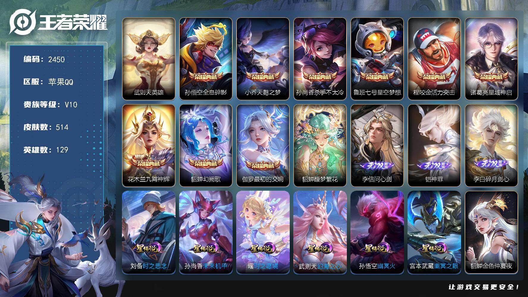 PX_2551201-Q-V10-最强王者段位【未兑换的容易水晶一颗】-129英雄-514皮肤-9典藏皮肤-1典藏英雄-1珍品无双-3无双-2珍品传说-76传说-159史诗,对抗路21,打野30中路30游走27发育路25 【英雄全皮】:刘禅全皮,刘邦全皮,孙权全皮,鬼谷子全皮,盾山全皮,猪八戒全皮,敖隐全皮,夏洛特全皮,司空震全皮,赵怀真全皮,莱西奥全皮,戈娅全皮,空空儿全皮,影全皮,海诺全皮,少司缘全皮 【荣耀典藏】:武则天英雄,孙悟空全息碎影,小乔天鹅之梦,孙尚香杀手不太冷,鲁班七号星空梦想,程咬金活力突击,诸葛亮星域神启,花木兰九霄神辉,貂蝉幻阙歌,伽罗最初的交响 【珍品无双】:貂蝉馥梦繁花 【无双皮肤】:李信问心剑,铠神罪,李白碎月剑心 【珍品传说】:安琪拉酷洛米之心,瑶大耳狗之梦 【传说皮肤】:云缨神骥越千峰,关羽神骥镇沧海,朵莉亚神骥鸣幻洲,狄仁杰神骥赴朔漠,貂蝉神骥聚万邦,马超神骥逐星野,杨戬纵目迁山,后羿神树通天,杨玉环星之鸣奏,司空震愿照山河定,女娲愿照千秋盛,妲己愿照众生和,澜愿照九州拓,蔡文姬愿照福禄聚,虞姬愿照岁时盈,云缨幻光神枪,裴擒虎祥瑞亨通,桑启鸣野蒿,夏侯惇霜北刀,铠冥王哈迪斯,朵莉亚心动手记,典韦战鼓燎原,澜逐花归海,艾琳觅芳踪,甄姬至美化雀舞,兰陵王影龙天霄,云缨鹤归松栖,马可波罗妄想实况,东皇太一灼幽烈阳,夏洛特浮生妄,干将莫邪画中仙,伽罗炽翼辉光,孙悟空齐天大圣,吕布怒海麟威,不知火舞绯月行,百里守约碎云,马超无双飞将,露娜启示之音,蔡文姬花朝如约,孙策末日机甲,瑶时之祈愿,裴擒虎寅虎赤拳,鲁班七号寅虎瑞焰,孙尚香异界灵契,貂蝉遇见胡旋,赵云淬星耀世,王昭君乞巧织情,周瑜音你心动,小乔音你心动,李元芳飞鸢探春,公孙离祈雪灵祝,诸葛亮时雨天司,铠绛天战甲,镜炽阳神光,虞姬启明星使,孙悟空零号赤焰,关羽武圣,曜云鹰飞将,李信一念神魔,刘备时之恋人,伽罗太华,貂蝉猫影幻舞,张良黄金白羊座,干将莫邪久胜战神,虞姬云霓雀翎,达摩黄金狮子座,百里玄策白虎志,花木兰冠军飞将,梦奇胖达荣荣,后羿黄金射手座,貂蝉仲夏夜之梦,孙尚香末日机甲,宫本武藏地狱之眼,孙悟空地狱火,武则天海洋之心,狄仁杰超时空战士 【限定皮肤】:夏侯惇霜北刀,铠冥王哈迪斯,暃埋骨钱,蔡文姬夏日便利店,大乔绒语心约,虞姬夏日便利店,姜子牙天穹之誓,狄仁杰阴阳师,廉颇寅虎御盾,赵云皇家上将,