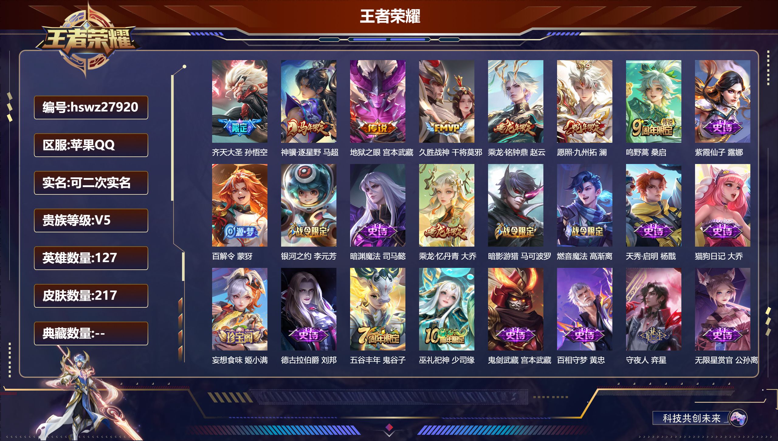 PX_2551198-Q/非凡王者/217皮肤/127英雄/0典藏/0珍品无双/0无双/0珍品传说/7传说/69史诗/7稀有英雄 【7,传说皮肤】齐天大圣,孙悟空,神骥·逐星野,马超,地狱之眼,宫本武藏,久胜战神,干将莫邪,乘龙·铭钟鼎,赵云,愿照·九州拓,澜,鸣野蒿,桑启, 【69,史诗皮肤】紫霞仙子,露娜,百解令,蒙犽,银河之约,李元芳,暗渊魔法,司马懿,乘龙·忆丹青,大乔,暗影游猎,马可波罗,燃音魔法,高渐离,天秀·启明,杨戬,猫狗日记,大乔,妄想食味,姬小满,德古拉伯爵,刘邦,五谷丰年,鬼谷子,巫礼祀神,少司缘,鬼剑武藏,宫本武藏,百相守梦,黄忠,守夜人,弈星,无限星赏官,公孙离,线条小狗,周瑜,百晓客,明世隐,摇滚巨星,嬴政,修罗,橘右京,魅力维加斯,妲己,黄金分割率,诸葛亮,偶像歌手,王昭君,女仆咖啡,妲己,赏金猎手,澜,九幽镇关,项羽,星界游侠,暃,遇见神鹿,瑶,舞动绿茵,蔡文姬,暗夜贵公子,嬴政,鹰眼统帅,狄仁杰,白晶晶,芈月,飞衡,韩信,李小龙,裴擒虎,金属风暴,墨子,特工魅影,百里守约,猫狗日记,孙策,原初追逐者,百里玄策,未来纪元,赵云,石田雨龙,后羿,鸭鸭历险记,刘禅,龙之律动,狂铁,皇家上将,赵云,冰冠公主,雅典娜,功夫厨神,程咬金,电玩·爆裂旋风,刘禅,天才门将,刘禅,圣诞恋歌,貂蝉,水晶猎龙者,花木兰,破空之剑,亚连,心动手记,海诺,圣诞狂欢,吕布,青焰无极,镜,星界战将,牛魔,茶境仙,孙膑,冰雪圆舞曲,甄姬,千年之狐,李白,节奏热浪,阿轲,曙光守护者,铠,万灵启世,女娲,乱世虎臣,张飞,缤纷独角兽,小乔,百相守梦,百里守约,水果甜心,孙尚香,江河有灵,阿古朵,幽灵船长,曹操,乘风破浪,夏侯惇,暗隐猎兽者,兰陵王, 【115,勇者皮肤】时空谍影,海诺,胡桃夹子,干将莫邪,爱心护理,阿轲,大漠名商,沈梦溪,纽约教父,刘备,拳王,达摩,龙舞盛年,沈梦溪,乐园追猎者,白起,丁香结,小乔,功夫炙烤,廉颇,铁甲之心,典韦,沉稳之力,孙尚香,海盐诗旅,桑启,汉昭烈帝,刘备,热血海滩,哪吒,白色死神,白起,黄金武士,典韦,阴阳师,狄仁杰,次元突破,哪吒,古海寻踪,张良,牛运亨通,牛魔,戏梦巡演,空空儿,功夫老勺,老夫子,鲨炮海盗猫,沈梦溪,海滩派对,项羽,完美运算,后羿,克喵,鬼谷子,踏浪烽翎,莱西奥,西部游侠,莱西奥,哥特玫瑰,露娜,守护之力,大乔,无双福将,程咬金,百相守梦,影,潮玩探月行,猪八戒,天穹祈灯,鬼谷子,五福同心,张飞,幻乐之宴,鬼谷子,虹云星官,明世隐,雾影缉谜,兰陵王,救世之瞳,扁鹊,赤刃凌霄,敖隐,死亡骑士,亚瑟,浪漫序章,刘备,敏锐之力,李白,玩偶对对碰,安琪拉,海滩丽影,钟无艳,忍·炎影,赵云,雪境奇遇,西施,坚韧之力,苏烈,万事如意,刘备,擒涛扼浪,裴擒虎,乓乓大师,鲁班大师,溯影追猎,虞姬,探海日志,鲁班大师,天使之翼,孙膑,兔女郎,花木兰,龙腾万里,关羽,罗小黑战记,哪吒,零食大作战,姬小满,荣光之誓,亚瑟,花好人间,甄姬,万象初新,宫本武藏,聚星闪耀,钟无艳,春野之旅,钟无艳,秘密基地,刘禅,教廷特使,韩信,街头霸王,韩信,云中旅人,李元芳,妄想特派,李元芳,西部大镖客,孙悟空,紫罗兰之誓,妲己,少女阿狸,妲己,灵卜魔法,妲己,蔚蓝守将,蒙恬,春野闲踪,苏烈,布丁狗之约,阿古朵,暖冬·兔眠,嫦娥,命运加冕,露娜,小满鸭,姬小满,灵野札记,张良,鸭鸭历险记,沈梦溪,命运角斗场,狂铁,死霸装,白起,特工战影,狂铁,虚灵犬护,钟馗,漠中幻影,嫦娥,劲辣红锅,太乙真人,神迹守卫,孙悟空,剑破天穹,刘邦,青衿临川,桑启,异域游侠,刘备,苍威无极,项羽,铁骨偃魂,典韦,熔金海岸,周瑜,苍林狼骑,苍,天穹之誓,姜子牙,魅影绮裳,影,访茗客,马超,星梦巡礼,姜子牙,破阵·退雄兵,杨戬,谧流熔炉,太乙真人,金福满堂,东皇太一,群星魔术团,程咬金,暗都幽影,大司命,鹤鸣心笺,艾琳,锦麟游梦,庄周,逆浪荇歌,甄姬,线条小狗,周瑜,百相守梦,老夫子,噬灭天穹,东皇太一,灵卦秘语,少司缘,敬我三分,盘古,怪诞之夜,米莱狄,玫蓝誓约,戈娅,景韶洛都,明世隐, 【28,其他皮肤】前尘,金蝉,战争骑士,夏侯惇,芝加哥教父,黄忠,潮流仙人,老夫子,龙域领主,铠,灼热之刃,李信,帝国元帅,项羽,精灵王,后羿,海军大将,周瑜,魇语军师,司马懿,英喵野望,刘禅,启蛰,司空震,花间舞,公孙离,街头旋风,裴擒虎,维京掠夺者,苍,激情绿茵,马可波罗,埃及法老,杨戬,归虚梦演,西施,归虚梦演,曜,威尼斯狂欢,百里玄策,幸存者,马超,创世神祝,盘古,绝影神枪,百里守约,森,瑶,孤猎,澜,精准探案法,米莱狄,赤焰之缨,云缨,西部大镖客,孙悟空, 【7,稀有英雄】不知火舞,橘右京,夏洛特,娜可露露,韩信,艾琳,赵云, 营地ID:,