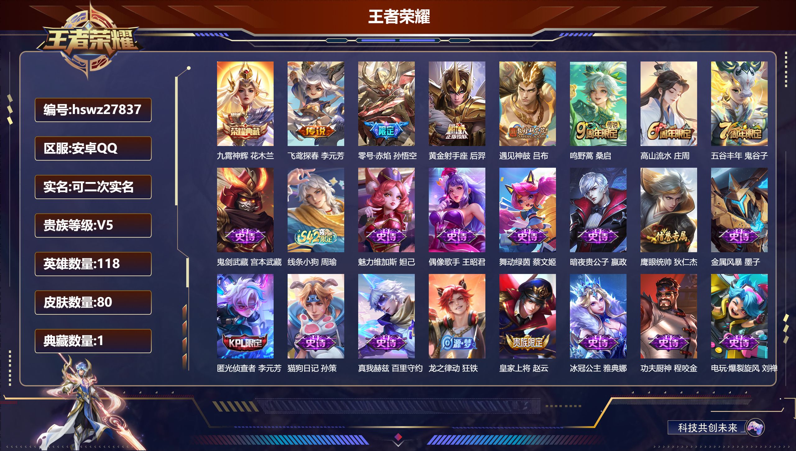 PX_2548796-Q/至尊星耀/80皮肤/118英雄/1典藏/0珍品无双/0无双/0珍品传说/5传说/26史诗/8稀有英雄 【1,典藏皮肤】九霄神辉,花木兰, 【5,传说皮肤】飞鸢探春,李元芳,零号·赤焰,孙悟空,黄金射手座,后羿,遇见神鼓,吕布,鸣野蒿,桑启, 【26,史诗皮肤】高山流水,庄周,五谷丰年,鬼谷子,鬼剑武藏,宫本武藏,线条小狗,周瑜,魅力维加斯,妲己,偶像歌手,王昭君,舞动绿茵,蔡文姬,暗夜贵公子,嬴政,鹰眼统帅,狄仁杰,金属风暴,墨子,匿光侦查者,李元芳,猫狗日记,孙策,真我赫兹,百里守约,龙之律动,狂铁,皇家上将,赵云,冰冠公主,雅典娜,功夫厨神,程咬金,电玩·爆裂旋风,刘禅,水晶猎龙者,花木兰,涂山容容,公孙离,破空之剑,亚连,蔷薇恋人,孙尚香,冰雪圆舞曲,甄姬,青蛇,小乔,游园惊梦,甄姬,江河有灵,阿古朵, 【38,勇者皮肤】沙漠行僧,达摩,大漠名商,沈梦溪,海盐诗旅,桑启,汉昭烈帝,刘备,黄金武士,典韦,王牌新星,海月,阴阳师,狄仁杰,古海寻踪,张良,功夫老勺,老夫子,西部大镖客,牛魔,海滩派对,项羽,野性能量,吕布,鸿运当头,亚瑟,天穹祈灯,鬼谷子,决胜大满贯,曹操,星际陆战队,程咬金,死亡骑士,亚瑟,破局者,亚连,雪境奇遇,西施,逐霄战戟,吕布,探海日志,鲁班大师,天使之翼,孙膑,雾都夜雨,干将莫邪,兔女郎,花木兰,金庭之子,兰陵王,幻夜行动,兰陵王,荣光之誓,亚瑟,聚星闪耀,钟无艳,街头霸王,韩信,云中旅人,李元芳,劲辣红锅,太乙真人,神迹守卫,孙悟空,罗小黑战记,张良,天穹之誓,姜子牙,谧流熔炉,太乙真人,鹤鸣心笺,艾琳,线条小狗,周瑜,噬灭天穹,东皇太一, 【11,其他皮肤】伊势巫女,大乔,龙域领主,铠,灼热之刃,李信,海之征途,孙策,星航指挥官,诸葛亮,花间舞,公孙离,维京掠夺者,苍,埃及法老,杨戬,特种部队,李元芳,绝影神枪,百里守约,森,瑶, 【8,稀有英雄】嬴政,不知火舞,橘右京,夏洛特,娜可露露,韩信,艾琳,赵云, 营地ID:,