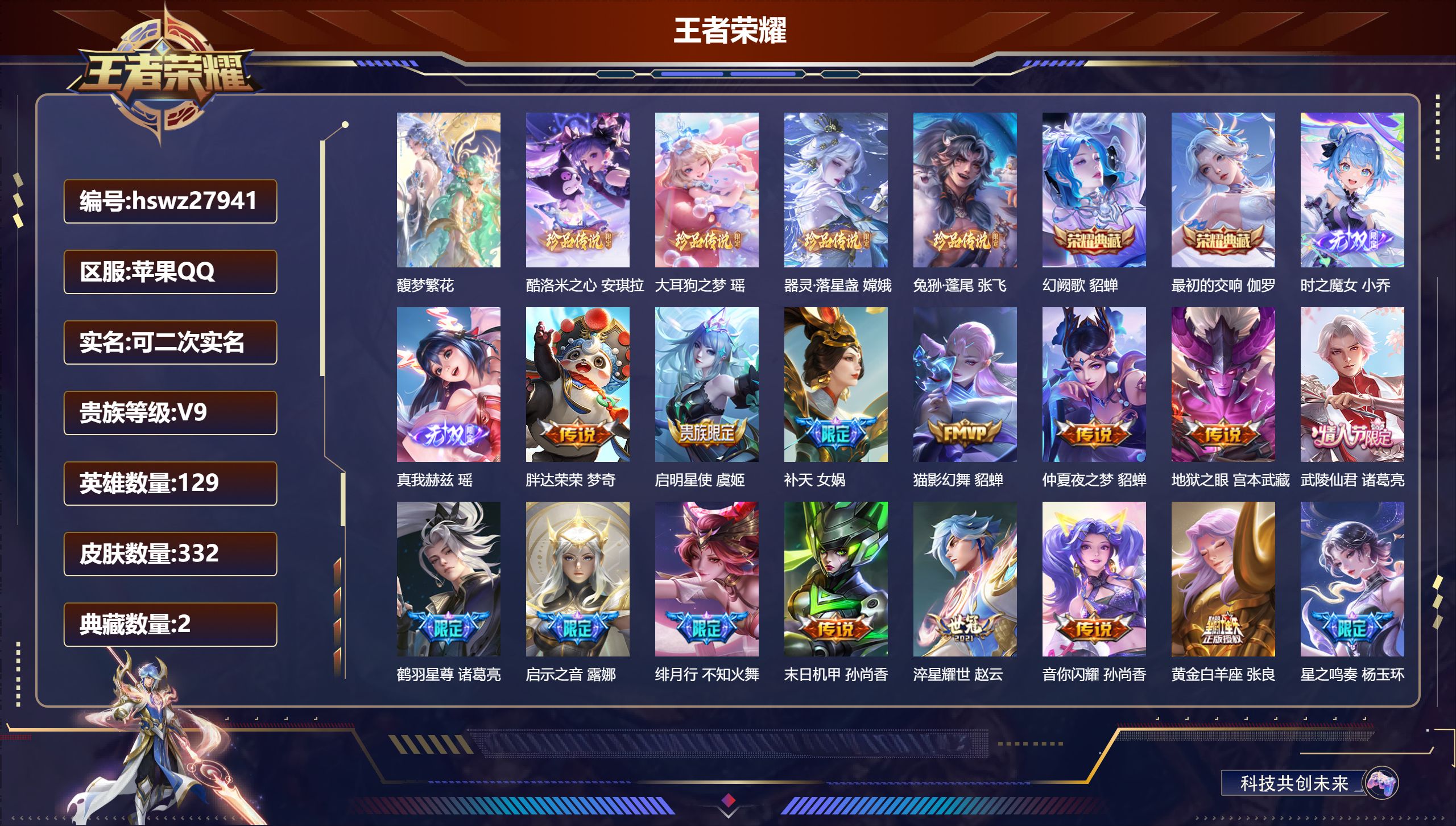 PX_2551513-Q/最强王者/332皮肤/129英雄/2典藏/1珍品无双/2无双/4珍品传说/27传说/88史诗/9稀有英雄 【1,珍品无双】馥梦繁花, 【4,珍品传说】酷洛米之心,安琪拉,大耳狗之梦,瑶,器灵·落星盏,嫦娥,兔狲·蓬尾,张飞, 【2,典藏皮肤】幻阙歌,貂蝉,最初的交响,伽罗, 【2,无双皮肤】时之魔女,小乔,真我赫兹,瑶, 【27,传说皮肤】胖达荣荣,梦奇,启明星使,虞姬,补天,女娲,猫影幻舞,貂蝉,仲夏夜之梦,貂蝉,地狱之眼,宫本武藏,武陵仙君,诸葛亮,鹤羽星尊,诸葛亮,启示之音,露娜,绯月行,不知火舞,末日机甲,孙尚香,淬星耀世,赵云,音你闪耀,孙尚香,黄金白羊座,张良,星之鸣奏,杨玉环,愿照·九州拓,澜,愿照·众生和,妲己,愿照·福禄聚,蔡文姬,神树通天,后羿,幻光神枪,云缨,愿照·山河定,司空震,愿照·岁时盈,虞姬,千劫归真,后羿,愿照·千秋盛,女娲,鸣野蒿,桑启,云诺千山,公孙离,续相思,西施, 【88,史诗皮肤】时之奇旅,安琪拉,末日机甲,吕布,蔬乡物语,鲁班七号,紫霞仙子,露娜,匿光追影者,镜,暗影游猎,马可波罗,天秀·启明,杨戬,猫狗日记,大乔,德古拉伯爵,刘邦,心灵战警,亚瑟,巫礼祀神,少司缘,鬼剑武藏,宫本武藏,迷踪丽影,阿轲,星夜王子,白起,寅虎·心曲,杨玉环,无限星赏官,公孙离,线条小狗,周瑜,玉兔公主,公孙离,遇见飞天,杨玉环,顽趣,梦奇,修罗,橘右京,如梦令,嫦娥,偶像歌手,王昭君,霸王别姬,虞姬,女仆咖啡,妲己,逐梦之音,貂蝉,白蛇,大乔,赏金猎手,澜,星界游侠,暃,晚萤,娜可露露,遇见神鹿,瑶,舞动绿茵,蔡文姬,繁星吟游,蔡文姬,鹰眼统帅,狄仁杰,胡桃异想国,米莱狄,白晶晶,芈月,纤云弄巧,云中君,金属风暴,墨子,冰霜神祇,盘古,特工魅影,百里守约,猫狗日记,孙策,逐浪之夏,李元芳,时之彼端,妲己,黎明之约,雅典娜,鸭鸭历险记,刘禅,魔术师,狄仁杰,布丁狗之誓,亚瑟,龙之律动,狂铁,唤灵魅影,貂蝉,皇家上将,赵云,冰冠公主,雅典娜,梁祝,上官婉儿,圣诞恋歌,貂蝉,云间偶戏,元歌,水晶猎龙者,花木兰,山海·碧波行,瑶,神器·万象笔,上官婉儿,圣诞狂欢,吕布,青焰无极,镜,魅语,不知火舞,群星魔术团,上官婉儿,器灵·浮梦炉,赵怀真,天狼绘梦者,上官婉儿,夏日便利店,蔡文姬,天狼运算者,孙膑,天狼溯光者,伽罗,地狱岩魂,廉颇,茶境仙,孙膑,虎魄,张飞,蔷薇恋人,孙尚香,火炮绅士,黄忠,青蛇,小乔,航海奇遇记,老夫子,女儿国国王,甄姬,寅虎·展翼,孙膑,心灵骇客,安琪拉,匿光破解者,沈梦溪,吟游魔法,明世隐,绅士熊喵,刘禅,缤纷独角兽,小乔,炽弈燎原,弈星,时之恋人,孙尚香,水果甜心,孙尚香,狂想玩偶喵,蒙犽,化蝶舞,阿轲,幽灵船长,曹操,乘风破浪,夏侯惇,暗隐猎兽者,兰陵王, 【133,勇者皮肤】圆桌骑士,盾山,太极少年,赵怀真,星际陆战队,达摩,沙漠行僧,达摩,大漠名商,沈梦溪,缤纷绘卷,张良,拳王,达摩,大发明家,达摩,龙舞盛年,沈梦溪,丁香结,小乔,功夫炙烤,廉颇,铁甲之心,典韦,沉稳之力,孙尚香,幻夜卜梦,芈月,海盐诗旅,桑启,幻泉雾影,海月,醍醐杖,老夫子,归虚梦演,孙膑,白色死神,白起,黑桃队长,鲁班七号,黄金武士,典韦,夺宝奇兵,刘邦,阴阳师,狄仁杰,次元突破,哪吒,功夫老勺,老夫子,西部大镖客,牛魔,鲨炮海盗猫,沈梦溪,鲤鱼之梦,庄周,虎啸剑宗,刘邦,海滩派对,项羽,万华元夜,狄仁杰,演武夺筹,程咬金,红桃皇后,芈月,哥特玫瑰,露娜,守护之力,大乔,无双福将,程咬金,瓷语鉴心,露娜,原初探秘者,鬼谷子,潮玩探月行,猪八戒,天穹祈灯,鬼谷子,西部大镖客,猪八戒,疑决卦,明世隐,化身博士,扁鹊,潮玩骑士王,亚瑟,阿尔法小队,后羿,五福同心,张飞,夜都怪侠,白起,金色潮汐,朵莉亚,幻乐之宴,鬼谷子,东方不败,武则天,虹云星官,明世隐,救世之瞳,扁鹊,浪漫序章,刘备,危途狂花,戈娅,胡桃狂想曲,蒙犽,破局者,亚连,玩偶对对碰,安琪拉,掌控之力,诸葛亮,海滩丽影,钟无艳,忍·炎影,赵云,唤灵魔甲,刘禅,万事如意,刘备,逐霄战戟,吕布,擒涛扼浪,裴擒虎,乓乓大师,鲁班大师,溯影追猎,虞姬,极光幻客,蚩奼,探海日志,鲁班大师,女武神,艾琳,天使之翼,孙膑,玩趣恶龙,高渐离,兔女郎,花木兰,龙腾万里,关羽,金庭之子,兰陵王,罗小黑战记,哪吒,千军破阵,苏烈,荣光之誓,亚瑟,花好人间,甄姬,万象初新,宫本武藏,单词大作战,雅典娜,时尚教父,姜子牙,秘密基地,刘禅,教廷特使,韩信,街头霸王,韩信,云中旅人,李元芳,妄想特派,李元芳,西部大镖客,孙悟空,紫罗兰之誓,妲己,神迹守卫,墨子,少女阿狸,妲己,混沌棋,弈星,秘证寻踪,小乔,蔚蓝守将,蒙恬,春野闲踪,苏烈,契约魔法,米莱狄,布丁狗之约,阿古朵,暖冬·兔眠,嫦娥,绒语心约,大乔,命运加冕,露娜,小满鸭,姬小满,幻想奇妙夜,王昭君,灵野札记,张良,驱傩正仪,钟馗,潮玩士官长,雅典娜,鸭鸭历险记,沈梦溪,命运角斗场,狂铁,特工战影,狂铁,虚灵犬护,钟馗,剑破天穹,刘邦,青衿临川,桑启,苍威无极,项羽,熔金海岸,周瑜,苍林狼骑,苍,天穹之誓,姜子牙,魅影绮裳,影,长夏之忆,貂蝉,访茗客,马超,星梦巡礼,姜子牙,谧流熔炉,太乙真人,金福满堂,东皇太一,夏日便利店,虞姬,鹤鸣心笺,艾琳,锦麟游梦,庄周,逆浪荇歌,甄姬,线条小狗,周瑜,噬灭天穹,东皇太一,灵卦秘语,少司缘,动物派对,亚瑟,敬我三分,盘古,怪诞之夜,米莱狄,爆裂喵拳,达摩,玫蓝誓约,戈娅,景韶洛都,明世隐, 【82,其他皮肤】伊势巫女,大乔,前尘,金蝉,战争骑士,夏侯惇,圣殿之光,刘邦,芝加哥教父,黄忠,三太子,哪吒,棒球奇才,沈梦溪,龙域领主,铠,生化警戒,钟无