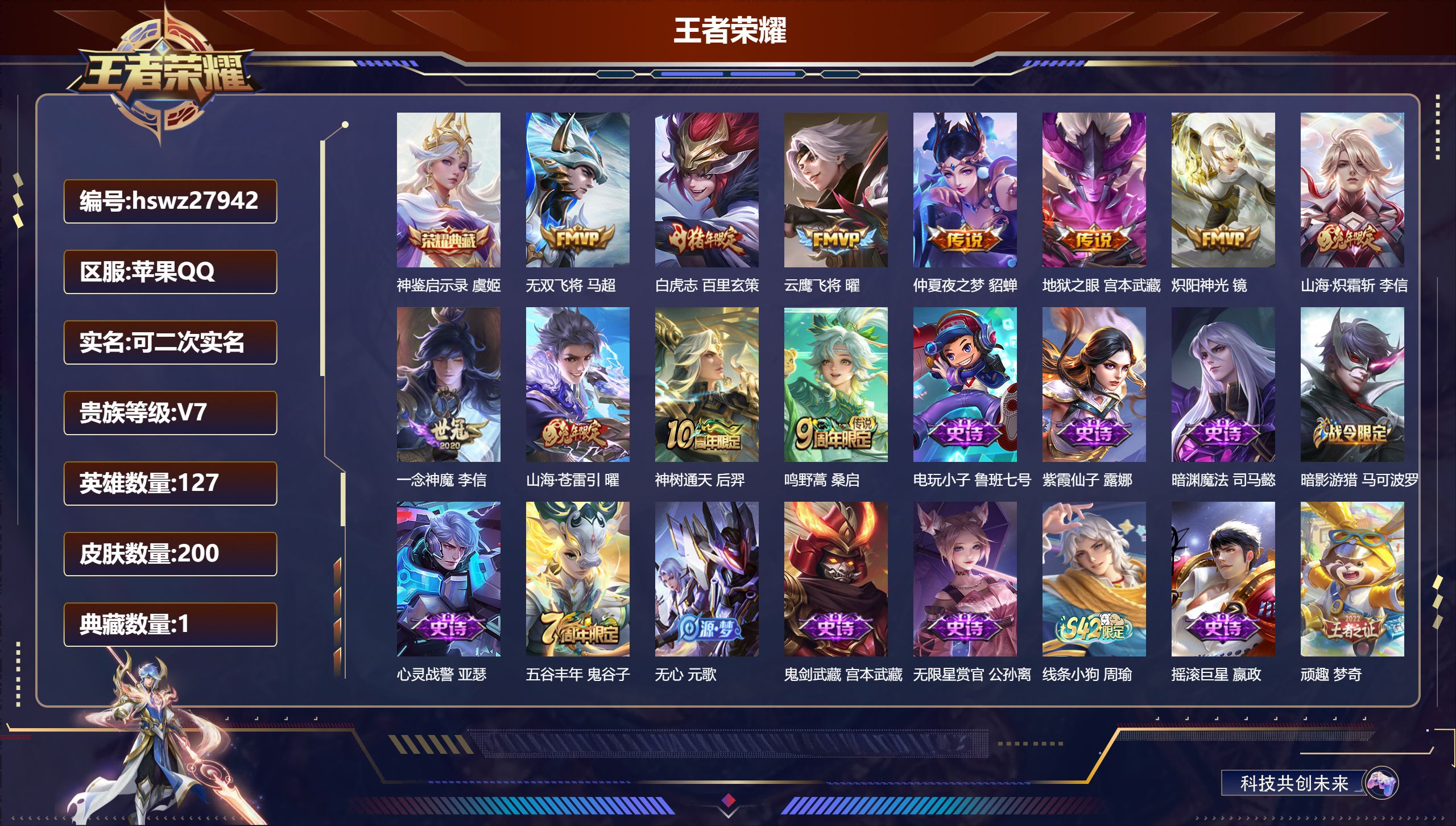 PX_2551523-Q/尊贵铂金/200皮肤/127英雄/1典藏/0珍品无双/0无双/0珍品传说/11传说/54史诗/7稀有英雄 【1,典藏皮肤】神鉴启示录,虞姬, 【11,传说皮肤】无双飞将,马超,白虎志,百里玄策,云鹰飞将,曜,仲夏夜之梦,貂蝉,地狱之眼,宫本武藏,炽阳神光,镜,山海·炽霜斩,李信,一念神魔,李信,山海·苍雷引,曜,神树通天,后羿,鸣野蒿,桑启, 【54,史诗皮肤】电玩小子,鲁班七号,紫霞仙子,露娜,暗渊魔法,司马懿,暗影游猎,马可波罗,心灵战警,亚瑟,五谷丰年,鬼谷子,无心,元歌,鬼剑武藏,宫本武藏,无限星赏官,公孙离,线条小狗,周瑜,摇滚巨星,嬴政,顽趣,梦奇,修罗,橘右京,魅力维加斯,妲己,荣光圣徽,蒙恬,女仆咖啡,妲己,赏金猎手,澜,鹰眼统帅,狄仁杰,孙行者,孙悟空,李小龙,裴擒虎,纤云弄巧,云中君,龙骑士,墨子,金属风暴,墨子,特工魅影,百里守约,猫狗日记,孙策,原初追逐者,百里玄策,逐浪之夏,李元芳,未来纪元,赵云,黎明之约,雅典娜,魔术师,狄仁杰,皇家上将,赵云,冰冠公主,雅典娜,梁祝,上官婉儿,电玩·爆裂旋风,刘禅,云间偶戏,元歌,水晶猎龙者,花木兰,破空之剑,亚连,地狱岩魂,廉颇,茶境仙,孙膑,蔷薇恋人,孙尚香,冰雪圆舞曲,甄姬,千年之狐,李白,曙光守护者,铠,万灵启世,女娲,心灵骇客,安琪拉,箭羽风息,伽罗,乱世虎臣,张飞,绅士熊喵,刘禅,水果甜心,孙尚香,狂想玩偶喵,蒙犽,化蝶舞,阿轲,幽灵船长,曹操,乘风破浪,夏侯惇,暗隐猎兽者,兰陵王, 【93,勇者皮肤】爱心护理,阿轲,太极少年,赵怀真,大漠名商,沈梦溪,缤纷绘卷,张良,纽约教父,刘备,拳王,达摩,大发明家,达摩,龙舞盛年,沈梦溪,乐园追猎者,白起,功夫炙烤,廉颇,沉稳之力,孙尚香,海盐诗旅,桑启,幻泉雾影,海月,醍醐杖,老夫子,归虚梦演,孙膑,汉昭烈帝,刘备,白色死神,白起,黑桃队长,鲁班七号,黄金武士,典韦,阴阳师,狄仁杰,次元突破,哪吒,古海寻踪,张良,科学大爆炸,项羽,功夫老勺,老夫子,鲨炮海盗猫,沈梦溪,海滩派对,项羽,万华元夜,狄仁杰,演武夺筹,程咬金,野性能量,吕布,哥特玫瑰,露娜,守护之力,大乔,原初探秘者,鬼谷子,潮玩探月行,猪八戒,西部大镖客,猪八戒,化身博士,扁鹊,潮玩骑士王,亚瑟,阿尔法小队,后羿,五福同心,张飞,次元傲视,杨戬,星际陆战队,程咬金,幻乐之宴,鬼谷子,虹云星官,明世隐,死亡骑士,亚瑟,危途狂花,戈娅,玩偶对对碰,安琪拉,掌控之力,诸葛亮,海滩丽影,钟无艳,雪境奇遇,西施,炽热元素使,姜子牙,坚韧之力,苏烈,唤灵魔甲,刘禅,万事如意,刘备,擒涛扼浪,裴擒虎,乓乓大师,鲁班大师,探海日志,鲁班大师,女武神,艾琳,天使之翼,孙膑,雾都夜雨,干将莫邪,兔女郎,花木兰,龙腾万里,关羽,金庭之子,兰陵王,未来纪元,宫本武藏,千军破阵,苏烈,荣光之誓,亚瑟,单词大作战,雅典娜,秘密基地,刘禅,教廷特使,韩信,街头霸王,韩信,云中旅人,李元芳,妄想特派,李元芳,西部大镖客,孙悟空,秘证寻踪,小乔,蔚蓝守将,蒙恬,春野闲踪,苏烈,幻想奇妙夜,王昭君,驱傩正仪,钟馗,死霸装,白起,特工战影,狂铁,虚灵犬护,钟馗,神迹守卫,孙悟空,铁骨偃魂,典韦,苍林狼骑,苍,天穹之誓,姜子牙,魅影绮裳,影,访茗客,马超,星梦巡礼,姜子牙,谧流熔炉,太乙真人,鹤鸣心笺,艾琳,线条小狗,周瑜,噬灭天穹,东皇太一,动物派对,亚瑟,敬我三分,盘古,玫蓝誓约,戈娅, 【43,其他皮肤】伊势巫女,大乔,前尘,金蝉,芝加哥教父,黄忠,潮流仙人,老夫子,棒球奇才,沈梦溪,极冰防御线,盾山,龙域领主,铠,生化警戒,钟无艳,超能战警,曹操,爱与和平,苏烈,第七人偶,干将莫邪,万圣前夜,小乔,灼热之刃,李信,海之征途,孙策,木偶奇遇记,鲁班七号,福禄兄弟,鲁班七号,精灵王,后羿,冰刃幻境,镜,碧珀绯影,暃,魇语军师,司马懿,午夜歌剧院,元歌,启蛰,司空震,隐刃,兰陵王,霓裳曲,杨玉环,花间舞,公孙离,异域舞娘,貂蝉,街头旋风,裴擒虎,归虚梦演,鲁班大师,维京掠夺者,苍,激情绿茵,马可波罗,阿摩司公爵,鬼谷子,尼罗河女神,女娲,一千零一夜,张良,归虚梦演,曜,幸存者,马超,绝影神枪,百里守约,孤猎,澜,秩序猎龙将,蒙恬,精准探案法,米莱狄,赤焰之缨,云缨,露花倒影,嫦娥,地府判官,钟馗,西部大镖客,孙悟空, 【7,稀有英雄】不知火舞,橘右京,夏洛特,娜可露露,韩信,艾琳,赵云, 营地ID:,