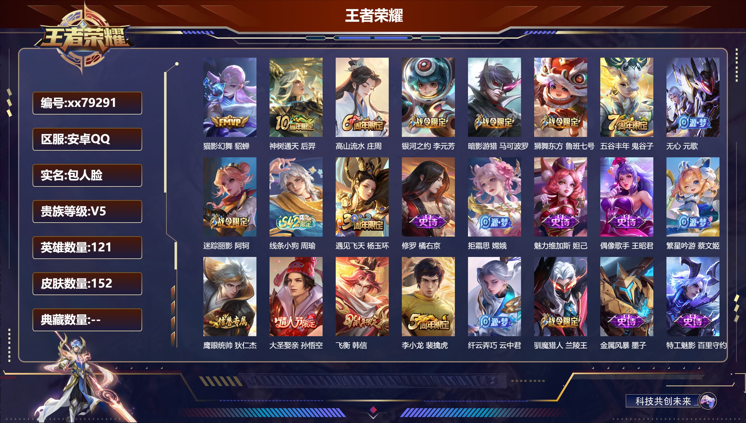 PX_2572336-,包人脸,V5,贵族积分9380,安卓QQ/152皮肤/121英雄/0典藏/0珍品无双/0无双/0珍品传说/2传说/40史诗/7稀有英雄 【2,传说皮肤】,猫影幻舞,貂蝉,神树通天,后羿, 【40,史诗皮肤】,高山流水,庄周,银河之约,李元芳,暗影游猎,马可波罗,狮舞东方,鲁班七号,五谷丰年,鬼谷子,无心,元歌,迷踪丽影,阿轲,线条小狗,周瑜,遇见飞天,杨玉环,修罗,橘右京,拒霜思,嫦娥,魅力维加斯,妲己,偶像歌手,王昭君,繁星吟游,蔡文姬,鹰眼统帅,狄仁杰,大圣娶亲,孙悟空,飞衡,韩信,李小龙,裴擒虎,纤云弄巧,云中君,驯魔猎人,兰陵王,金属风暴,墨子,特工魅影,百里守约,猫狗日记,孙策,皇家上将,赵云,冰冠公主,雅典娜,梁祝,上官婉儿,圣诞恋歌,貂蝉,云间偶戏,元歌,水晶猎龙者,花木兰,圣诞狂欢,吕布,魅语,不知火舞,蔷薇恋人,孙尚香,冰雪圆舞曲,甄姬,节奏热浪,阿轲,曙光守护者,铠,心灵骇客,安琪拉,水果甜心,孙尚香,狂想玩偶喵,蒙犽,幽灵船长,曹操,暗隐猎兽者,兰陵王, 【87,勇者皮肤】,圆桌骑士,盾山,烛龙,曹操,沙漠行僧,达摩,大漠名商,沈梦溪,缤纷绘卷,张良,纽约教父,刘备,拳王,达摩,大发明家,达摩,海盐诗旅,桑启,朔风刀,夏侯惇,醍醐杖,老夫子,朔望之晖,女娲,归虚梦演,孙膑,白色死神,白起,黑桃队长,鲁班七号,黄金武士,典韦,夺宝奇兵,刘邦,御旌,牛魔,阴阳师,狄仁杰,次元突破,哪吒,牛运亨通,牛魔,科学大爆炸,项羽,功夫老勺,老夫子,西部大镖客,牛魔,鲨炮海盗猫,沈梦溪,虎啸剑宗,刘邦,海滩派对,项羽,万华元夜,狄仁杰,制霸全明星,牛魔,演武夺筹,程咬金,红桃皇后,芈月,奇妙博物学,庄周,野性能量,吕布,哥特玫瑰,露娜,守护之力,大乔,瓷语鉴心,露娜,原初探秘者,鬼谷子,星空之诺,沈梦溪,西部大镖客,猪八戒,疑决卦,明世隐,化身博士,扁鹊,潮玩骑士王,亚瑟,五福同心,张飞,次元傲视,杨戬,幻乐之宴,鬼谷子,霸王丸,宫本武藏,虹云星官,明世隐,潮玩牛仔,马可波罗,救世之瞳,扁鹊,赤莲之焰,周瑜,死亡骑士,亚瑟,敏锐之力,李白,玩偶对对碰,安琪拉,海滩丽影,钟无艳,重明,芈月,炽热元素使,姜子牙,坚韧之力,苏烈,万事如意,刘备,乓乓大师,鲁班大师,死亡摇滚,高渐离,天使之翼,孙膑,龙腾万里,关羽,金庭之子,兰陵王,罗小黑战记,哪吒,千军破阵,苏烈,花好人间,甄姬,万象初新,宫本武藏,潮玩造梦师,刘备,御銮,盾山,单词大作战,雅典娜,秘密基地,刘禅,教廷特使,韩信,街头霸王,韩信,云中旅人,李元芳,重装意志,盘古,少女阿狸,妲己,混沌棋,弈星,御霄,米莱狄,契约魔法,米莱狄,幻想奇妙夜,王昭君,驱傩正仪,钟馗,神迹守卫,钟馗,御狮,狂铁,白执事,赵云,饕餮,太乙真人,鹤鸣心笺,艾琳,线条小狗,周瑜, 【24,其他皮肤】,芝加哥教父,黄忠,三太子,哪吒,花见巫女,伽罗,第七人偶,干将莫邪,灼热之刃,李信,海之征途,孙策,精灵王,后羿,星航指挥官,诸葛亮,午夜歌剧院,元歌,隐刃,兰陵王,霓裳曲,杨玉环,异域舞娘,貂蝉,街头旋风,裴擒虎,范海辛,李白,激情绿茵,马可波罗,埃及法老,杨戬,归虚梦演,曜,威尼斯狂欢,百里玄策,创世神祝,盘古,加勒比小姐,虞姬,精灵公主,王昭君,赤焰之缨,云缨,露花倒影,嫦娥,美梦成真,梦奇, 【7,稀有英雄】,不知火舞,橘右京,夏洛特,娜可露露,韩信,艾琳,赵云, 营地ID:,