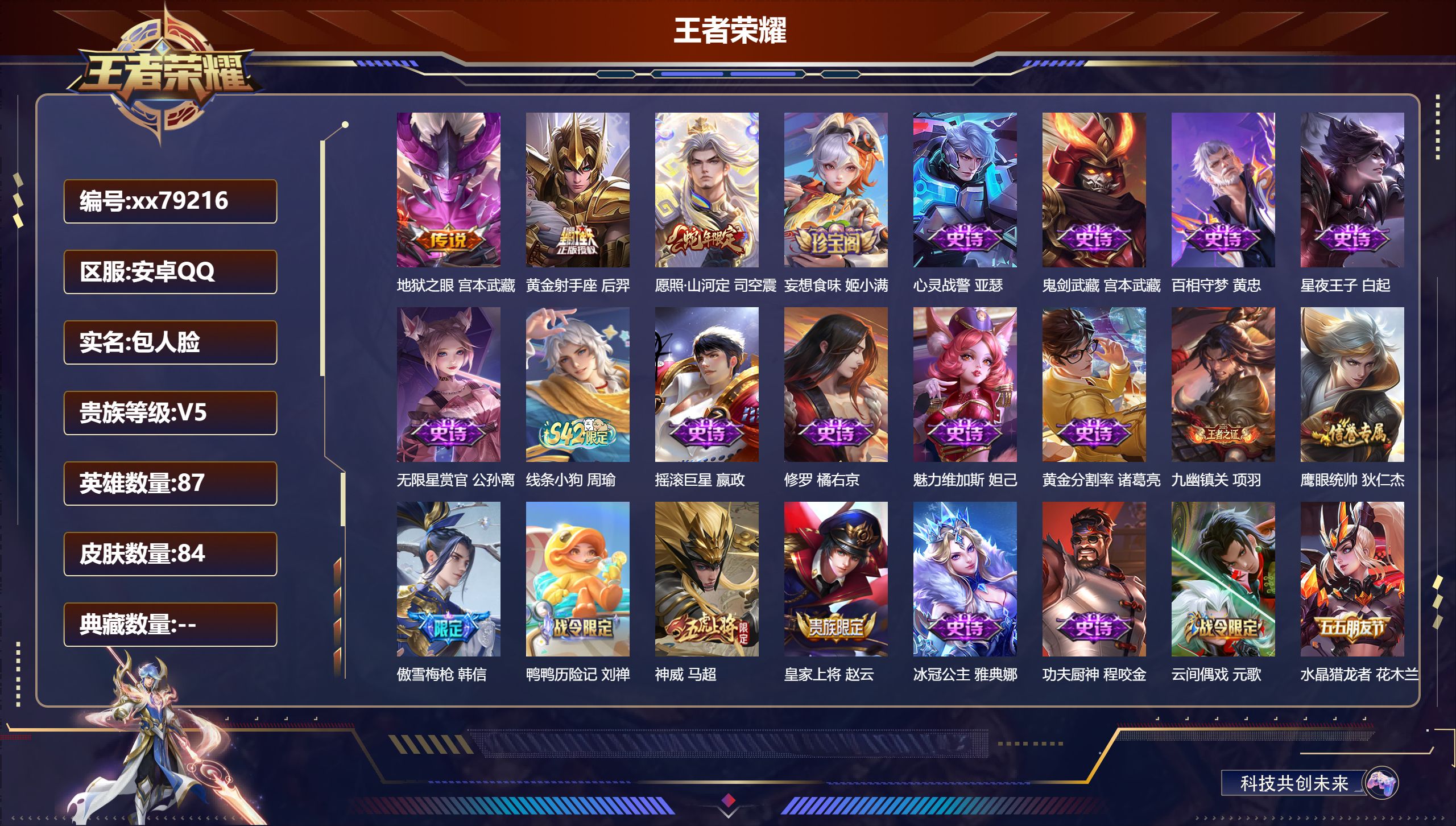 PX_2572247-,包人脸,V5,贵族积分9355,安卓QQ/84皮肤/87英雄/0典藏/0珍品无双/0无双/0珍品传说/3传说/29史诗/5稀有英雄 【3,传说皮肤】,地狱之眼,宫本武藏,黄金射手座,后羿,愿照·山河定,司空震, 【29,史诗皮肤】,妄想食味,姬小满,心灵战警,亚瑟,鬼剑武藏,宫本武藏,百相守梦,黄忠,星夜王子,白起,无限星赏官,公孙离,线条小狗,周瑜,摇滚巨星,嬴政,修罗,橘右京,魅力维加斯,妲己,黄金分割率,诸葛亮,九幽镇关,项羽,鹰眼统帅,狄仁杰,傲雪梅枪,韩信,鸭鸭历险记,刘禅,神威,马超,皇家上将,赵云,冰冠公主,雅典娜,功夫厨神,程咬金,云间偶戏,元歌,水晶猎龙者,花木兰,涂山容容,公孙离,青蛇,小乔,千年之狐,李白,万灵启世,女娲,百相守梦,周瑜,缤纷独角兽,小乔,水果甜心,孙尚香,幽灵船长,曹操, 【34,勇者皮肤】,沙漠行僧,达摩,大漠名商,沈梦溪,丁香结,小乔,沉稳之力,孙尚香,海盐诗旅,桑启,阴阳师,狄仁杰,径山谋武,孙权,古海寻踪,张良,海滩派对,项羽,踏浪烽翎,莱西奥,阿尔法小队,后羿,死亡骑士,亚瑟,危途狂花,戈娅,溯影追猎,虞姬,极光幻客,蚩奼,天使之翼,孙膑,兔女郎,花木兰,龙腾万里,关羽,罗小黑战记,哪吒,千军破阵,苏烈,荣光之誓,亚瑟,万象初新,宫本武藏,街头霸王,韩信,云中旅人,李元芳,西部大镖客,孙悟空,驱傩正仪,钟馗,鸭鸭历险记,沈梦溪,剑破天穹,刘邦,苍林狼骑,苍,谧流熔炉,太乙真人,鹤鸣心笺,艾琳,逆浪荇歌,甄姬,百相守梦,孙策,线条小狗,周瑜, 【20,其他皮肤】,棒球奇才,沈梦溪,灼热之刃,李信,福禄兄弟,鲁班七号,冰刃幻境,镜,碧珀绯影,暃,午夜歌剧院,元歌,霓裳曲,杨玉环,花间舞,公孙离,街头旋风,裴擒虎,范海辛,李白,维京掠夺者,苍,激情绿茵,马可波罗,锦衣卫,狄仁杰,一千零一夜,张良,归虚梦演,曜,幸存者,马超,创世神祝,盘古,孤猎,澜,赤焰之缨,云缨,西部大镖客,孙悟空, 【5,稀有英雄】,不知火舞,橘右京,娜可露露,韩信,赵云, 营地ID:,