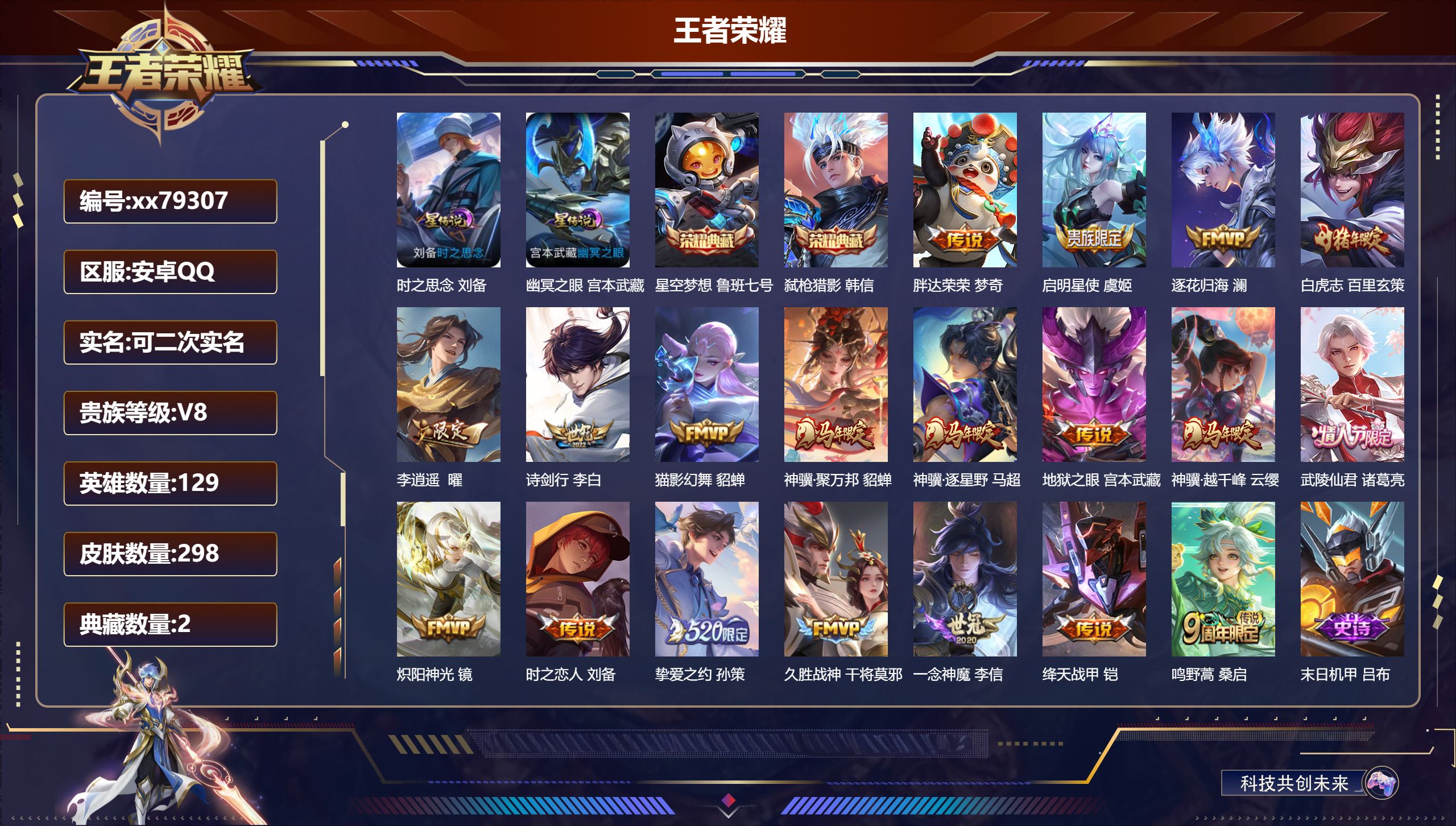 PX_2572439-,可二次,V8,贵族积分51661,安卓QQ/298皮肤/129英雄/2典藏/0珍品无双/0无双/0珍品传说/19传说/84史诗/9稀有英雄 【2,星传说皮肤】,时之思念,刘备,幽冥之眼,宫本武藏, 【2,典藏皮肤】,星空梦想,鲁班七号,弑枪猎影,韩信, 【19,传说皮肤】,胖达荣荣,梦奇,启明星使,虞姬,逐花归海,澜,白虎志,百里玄策,李逍遥,,曜,诗剑行,李白,猫影幻舞,貂蝉,神骥·聚万邦,貂蝉,神骥·逐星野,马超,地狱之眼,宫本武藏,神骥·越千峰,云缨,武陵仙君,诸葛亮,炽阳神光,镜,时之恋人,刘备,挚爱之约,孙策,久胜战神,干将莫邪,一念神魔,李信,绛天战甲,铠,鸣野蒿,桑启, 【84,史诗皮肤】,末日机甲,吕布,紫霞仙子,露娜,高山流水,庄周,云端筑梦师,庄周,暗影游猎,马可波罗,苍穹之光,项羽,天秀·启明,杨戬,妄想食味,姬小满,德古拉伯爵,刘邦,山海·玄木吟,马可波罗,心灵战警,亚瑟,五谷丰年,鬼谷子,无心,元歌,鬼剑武藏,宫本武藏,百相守梦,黄忠,星夜王子,白起,地狱燃心,司空震,线条小狗,周瑜,撼世英歌,盘古,摇滚巨星,嬴政,电玩高手,狂铁,修罗,橘右京,魅力维加斯,妲己,偶像歌手,王昭君,荣光圣徽,蒙恬,女仆咖啡,妲己,星界游侠,暃,舞动绿茵,蔡文姬,繁星吟游,蔡文姬,鹰眼统帅,狄仁杰,胡桃异想国,米莱狄,末日机甲,莱西奥,孙行者,孙悟空,李小龙,裴擒虎,光弋星穹,莱西奥,纤云弄巧,云中君,如梦令,后羿,金属风暴,墨子,特工魅影,百里守约,猫狗日记,孙策,逐浪之夏,李元芳,奇幻香踪,扁鹊,鸭鸭历险记,刘禅,魔术师,狄仁杰,热力回旋,百里玄策,龙之律动,狂铁,神威,马超,皇家上将,赵云,冰冠公主,雅典娜,至尊宝,孙悟空,功夫厨神,程咬金,电玩·爆裂旋风,刘禅,天才门将,刘禅,圣诞恋歌,貂蝉,云间偶戏,元歌,水晶猎龙者,花木兰,破空之剑,亚连,一生所爱,露娜,御风骁将,吕布,天狼绘梦者,上官婉儿,地狱岩魂,廉颇,蔷薇恋人,孙尚香,冰雪圆舞曲,甄姬,火炮绅士,黄忠,月团寄思,沈梦溪,航海奇遇记,老夫子,千年之狐,李白,节奏热浪,阿轲,超时空战士,钟无艳,游园惊梦,甄姬,曙光守护者,铠,万灵启世,女娲,心灵骇客,安琪拉,乱世虎臣,张飞,吟游魔法,明世隐,绅士熊喵,刘禅,缤纷独角兽,小乔,真爱魔法,干将莫邪,水果甜心,孙尚香,狂想玩偶喵,蒙犽,江河有灵,阿古朵,幽灵船长,曹操,乘风破浪,夏侯惇,暗隐猎兽者,兰陵王, 【141,勇者皮肤】,时空谍影,海诺,圆桌骑士,盾山,星际陆战队,达摩,沙漠行僧,达摩,大漠名商,沈梦溪,缤纷绘卷,张良,纽约教父,刘备,大发明家,达摩,龙舞盛年,沈梦溪,乐园追猎者,白起,丁香结,小乔,功夫炙烤,廉颇,铁甲之心,典韦,沉稳之力,孙尚香,幻夜卜梦,芈月,爱与正义,程咬金,海盐诗旅,桑启,朔风刀,夏侯惇,醍醐杖,老夫子,归虚梦演,孙膑,汉昭烈帝,刘备,白色死神,白起,黄金武士,典韦,王牌新星,海月,落雪兰心,甄姬,御旌,牛魔,阴阳师,狄仁杰,径山谋武,孙权,次元突破,哪吒,古海寻踪,张良,牛运亨通,牛魔,科学大爆炸,项羽,功夫老勺,老夫子,鲨炮海盗猫,沈梦溪,虎啸剑宗,刘邦,海滩派对,项羽,完美运算,后羿,万华元夜,狄仁杰,踏浪烽翎,莱西奥,演武夺筹,程咬金,奇妙博物学,庄周,美猴王,孙悟空,哥特玫瑰,露娜,守护之力,大乔,无双福将,程咬金,百相守梦,影,原初探秘者,鬼谷子,潮玩探月行,猪八戒,天穹祈灯,鬼谷子,西部大镖客,猪八戒,疑决卦,明世隐,化身博士,扁鹊,潮玩骑士王,亚瑟,阿尔法小队,后羿,五福同心,张飞,夜都怪侠,白起,次元傲视,杨戬,星际陆战队,程咬金,幻乐之宴,鬼谷子,东方不败,武则天,虹云星官,明世隐,雾影缉谜,兰陵王,救世之瞳,扁鹊,赤刃凌霄,敖隐,潮玩骑兵,杨戬,死亡骑士,亚瑟,危途狂花,戈娅,破局者,亚连,幽兰居士,张良,玩偶对对碰,安琪拉,海滩丽影,钟无艳,圣弓游侠,后羿,忍·炎影,赵云,雪境奇遇,西施,重明,芈月,坚韧之力,苏烈,唤灵魔甲,刘禅,万事如意,刘备,逐霄战戟,吕布,擒涛扼浪,裴擒虎,苍云破阵,蒙恬,糖果风暴,安琪拉,乓乓大师,鲁班大师,溯影追猎,虞姬,极光幻客,蚩奼,探海日志,鲁班大师,女武神,艾琳,天使之翼,孙膑,兔女郎,花木兰,龙腾万里,关羽,金庭之子,兰陵王,千军破阵,苏烈,往忆晖光,明世隐,零食大作战,姬小满,荣光之誓,亚瑟,花好人间,甄姬,万象初新,宫本武藏,御銮,盾山,单词大作战,雅典娜,秘密基地,刘禅,教廷特使,韩信,街头霸王,韩信,云中旅人,李元芳,妄想特派,李元芳,西部大镖客,孙悟空,紫罗兰之誓,妲己,神迹守卫,墨子,重装意志,盘古,凯尔特女王,虞姬,进击墨子号,墨子,少女阿狸,妲己,混沌棋,弈星,御霄,米莱狄,契约魔法,米莱狄,布丁狗之约,阿古朵,暖冬·兔眠,嫦娥,午后时光,王昭君,幻想奇妙夜,王昭君,灵野札记,张良,驱傩正仪,钟馗,鸭鸭历险记,沈梦溪,命运角斗场,狂铁,死霸装,白起,特工战影,狂铁,虚灵犬护,钟馗,白执事,赵云,劲辣红锅,太乙真人,神迹守卫,孙悟空,铁骨偃魂,典韦,苍林狼骑,苍,天穹之誓,姜子牙,魅影绮裳,影,星梦巡礼,姜子牙,谧流熔炉,太乙真人,暗都幽影,大司命,鹤鸣心笺,艾琳,云械蓝图,云中君,逆浪荇歌,甄姬,线条小狗,周瑜,噬灭天穹,东皇太一,景韶洛都,明世隐, 【54,其他皮肤】,伊势巫女,大乔,前尘,金蝉,战争骑士,夏侯惇,芝加哥教父,黄忠,潮流仙人,老夫子,三太子,哪吒,棒球奇才,沈梦溪,生化警戒,钟无艳,超能战警,曹操,爱与和平,苏烈,未来旅行,孙膑,第七人偶,干将莫邪,万圣前夜,小乔,灼热之刃,李信,熊喵少女,阿古朵,福禄兄弟,鲁班七号,精灵王,后羿,冰刃幻境,镜,魇语军师,司马懿,