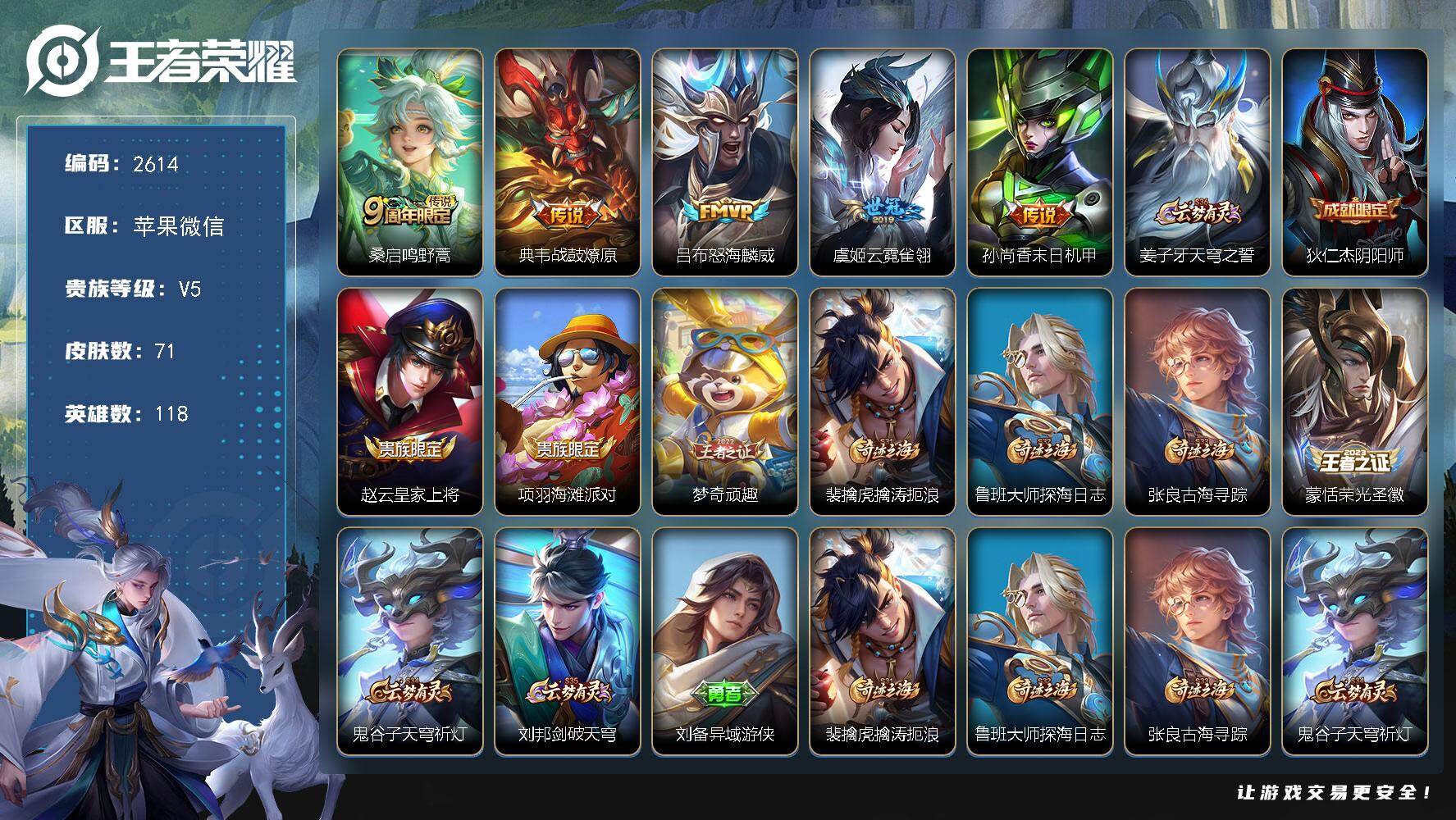 PX_2527381-WX-V5-至尊星耀IV段位-发育路33段,游走27段,1金标典韦,1星元未来机甲,118英雄-71皮肤-5传说-12史诗 【传说皮肤】:桑启鸣野蒿,典韦战鼓燎原,吕布怒海麟威,虞姬云霓雀翎,孙尚香末日机甲 【限定皮肤】:姜子牙天穹之誓,狄仁杰阴阳师,赵云皇家上将,项羽海滩派对,梦奇顽趣,裴擒虎擒涛扼浪,鲁班大师探海日志,张良古海寻踪,蒙恬荣光圣徽,鬼谷子天穹祈灯,刘邦剑破天穹,刘备异域游侠 【赛季限定】:裴擒虎擒涛扼浪,鲁班大师探海日志,张良古海寻踪,鬼谷子天穹祈灯,刘邦剑破天穹,姜子牙天穹之誓,东皇太一噬灭天穹,太乙真人谧流熔炉,钟馗虚灵犬护,甄姬逆浪荇歌,梦奇顽趣,蒙恬荣光圣徽,牛魔星界战将,项羽九幽镇关 【史诗皮肤】:项羽九幽镇关,苍狼魂孤将,牛魔星界战将,黄忠怒海争锋,蒙恬荣光圣徽,梦奇顽趣,狄仁杰鹰眼统帅,张飞乱世虎臣,妲己魅力维加斯,孙尚香水果甜心,宫本武藏鬼剑武藏,赵云皇家上将 【其他皮肤】:甄姬逆浪荇歌,阿古朵布丁狗之约,张良灵野札记,苏烈春野闲踪,钟馗虚灵犬护,戈娅玫蓝誓约,太乙真人谧流熔炉,干将莫邪雾都夜雨,东皇太一噬灭天穹,姜子牙天穹之誓,刘备异域游侠,大司命暗都幽影,刘邦剑破天穹,鬼谷子天穹祈灯,张良古海寻踪,鲁班大师探海日志,裴擒虎擒涛扼浪,鲁班大师乓乓大师,明世隐虹云星官,诸葛亮掌控之力,狂铁命运角斗场,关羽龙腾万里,狄仁杰阴阳师,后羿阿尔法小队,宫本武藏万象初新,刘备万事如意,甄姬花好人间,张飞五福同心,花木兰兔女郎,达摩拳王,亚瑟死亡骑士,典韦黄金武士,孙膑天使之翼,庄周鲤鱼之梦,武则天东方不败,牛魔西部大镖客,白起白色死神,赵云忍炎影,达摩大发明家,韩信教廷特使,项羽海滩派对,蒙犽归虚梦演,瑶森,李信灼热之刃,沈梦溪棒球奇才,铠龙域领主,干将莫邪第七人偶,黄忠芝加哥教父,夏侯惇战争骑士,关羽天启骑士,李元芳特种部队,孙悟空西部大镖客,狄仁杰锦衣卫,鲁班七号木偶奇遇记 【营地ID】:1759741897