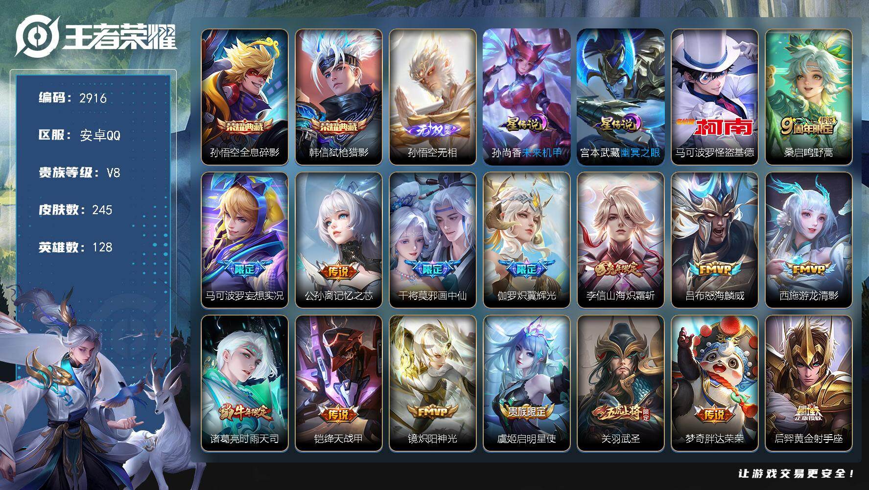 PX_2552864-Q-V8-永恒钻石II段位-128英雄-245皮肤-2典藏皮肤-1无双-1珍品传说-18传说-68史诗 【英雄全皮】:孙权全皮,敖隐全皮,影全皮 【荣耀典藏】:孙悟空全息碎影,韩信弑枪猎影 【无双皮肤】:孙悟空无相 【珍品传说】:马可波罗怪盗基德 【传说皮肤】:桑启鸣野蒿,马可波罗妄想实况,公孙离记忆之芯,干将莫邪画中仙,伽罗炽翼辉光,李信山海炽霜斩,吕布怒海麟威,西施游龙清影,诸葛亮时雨天司,铠绛天战甲,镜炽阳神光,虞姬启明星使,关羽武圣,梦奇胖达荣荣,后羿黄金射手座,孙尚香末日机甲,宫本武藏地狱之眼,狄仁杰超时空战士 【限定皮肤】:暃埋骨钱,姜子牙天穹之誓,杨戬破阵退雄兵,李白谪仙醉月,狄仁杰阴阳师,赵云皇家上将,孙尚香蔷薇恋人,庄周高山流水,夏侯惇朔风刀,夏侯惇匿光决锋者,马可波罗妄想实况,狄仁杰魔术师,狄仁杰万华元夜,达摩沙漠行僧,项羽海滩派对,老夫子醍醐杖,关羽武圣,貂蝉逐梦之音,程咬金演武夺筹,兰陵王金庭之子,李元芳匿光侦查者,李元芳云中旅人,虞姬启明星使,钟馗驱傩正仪,杨玉环遇见飞天,干将莫邪画中仙,鬼谷子原初探秘者,诸葛亮时雨天司,苏烈千军破阵,百里玄策原初追逐者,弈星混沌棋,沈梦溪大漠名商,明世隐疑决卦,裴擒虎李小龙,裴擒虎擒涛扼浪,米莱狄御霄,云中君纤云弄巧,李信山海炽霜斩,伽罗炽翼辉光,盾山御銮,嫦娥拒霜思,西施玲珑珍味,鲁班大师探海日志,桑启海盐诗旅,戈娅驭风魔法,艾琳流音漫舞,司空震地狱燃心,阿古朵江河有灵,张良古海寻踪,蒙犽百解令,蒙恬荣光圣徽,高渐离燃音魔法,妲己灵卜魔法,鬼谷子天穹祈灯,姬小满妄想食味,沈梦溪龙舞盛年,刘邦剑破天穹,程咬金群星魔术团,镜青焰无极,项羽苍威无极,芈月浮光幕影,周瑜熔金海岸 【年限皮肤】:诸葛亮时雨天司,李信山海炽霜斩 【赛季限定】:米莱狄御霄,盾山御銮,夏侯惇朔风刀,弈星混沌棋,明世隐疑决卦,老夫子醍醐杖,鬼谷子原初探秘者,狄仁杰万华元夜,程咬金演武夺筹,钟馗驱傩正仪,苏烈千军破阵,达摩沙漠行僧,兰陵王金庭之子,沈梦溪大漠名商,李元芳云中旅人,桑启海盐诗旅,裴擒虎擒涛扼浪,鲁班大师探海日志,张良古海寻踪,鬼谷子天穹祈灯,刘邦剑破天穹,姜子牙天穹之誓,东皇太一噬灭天穹,太乙真人谧流熔炉,亚瑟荣光之誓,百里玄策原初追逐者,蒙恬荣光圣徽,牛魔星界战将,项羽九幽镇关 【战令限定】:戈娅驭风魔法,西施玲珑珍味