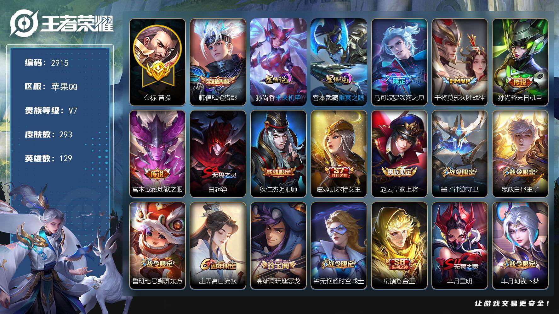 PX_2552871-Q-V7-至尊星耀V段位-129英雄-293皮肤-1典藏皮肤-4传说-81史诗 【英雄全皮】:戈娅全皮,影全皮 【荣耀典藏】:韩信弑枪猎影 【传说皮肤】:马可波罗深海之息,干将莫邪久胜战神,孙尚香末日机甲,宫本武藏地狱之眼 【限定皮肤】:白起狰,狄仁杰阴阳师,虞姬凯尔特女王,赵云皇家上将,墨子神迹守卫,嬴政白昼王子,鲁班七号狮舞东方,庄周高山流水,高渐离玩趣恶龙,钟无艳超时空战士,扁鹊炼金王,芈月重明,芈月幻夜卜梦,吕布猎兽之王,元歌云间偶戏,元歌无心,夏侯惇朔风刀,甄姬落雪兰心,曹操烛龙,典韦穷奇,马可波罗暗影游猎,马可波罗深海之息,狄仁杰魔术师,狄仁杰万华元夜,达摩星际陆战队,达摩沙漠行僧,项羽海滩派对,老夫子醍醐杖,老夫子航海奇遇记,程咬金演武夺筹,兰陵王金庭之子,花木兰默契交锋,亚瑟潮玩骑士王,孙悟空至尊宝,后羿圣弓游侠,李元芳云中旅人,虞姬霸王别姬,钟馗神迹守卫,钟馗驱傩正仪,女娲朔望之晖,干将莫邪真爱魔法,雅典娜单词大作战,雅典娜黎明之约,蔡文姬繁星吟游,太乙真人饕餮,鬼谷子原初探秘者,鬼谷子五谷丰年,黄忠火炮绅士,苏烈千军破阵,百里玄策原初追逐者,弈星混沌棋,梦奇顽趣,沈梦溪大漠名商,明世隐疑决卦,裴擒虎李小龙,裴擒虎擒涛扼浪,狂铁御狮,米莱狄御霄,米莱狄胡桃异想国,云中君纤云弄巧,伽罗天狼溯光者,猪八戒西部大镖客,猪八戒猪悟能,上官婉儿梁祝,嫦娥拒霜思,嫦娥暖冬兔眠,西施玲珑珍味,蒙犽狂想玩偶喵,鲁班大师探海日志,镜匿光追影者,桑启海盐诗旅,暃星界游侠,戈娅驭风魔法,艾琳女武神,艾琳流音漫舞,司空震地狱燃心,阿古朵江河有灵,张良古海寻踪,蒙恬荣光圣徽,鬼谷子天穹祈灯,姬小满妄想食味,刘邦剑破天穹,刘备异域游侠 【赛季限定】:扁鹊炼金王,虞姬凯尔特女王,白起狰,太乙真人饕餮,曹操烛龙,芈月重明,典韦穷奇,狂铁御狮,米莱狄御霄,夏侯惇朔风刀,弈星混沌棋,明世隐疑决卦,老夫子醍醐杖,鬼谷子原初探秘者,狄仁杰万华元夜,程咬金演武夺筹,钟馗驱傩正仪,苏烈千军破阵,达摩沙漠行僧,兰陵王金庭之子,沈梦溪大漠名商,李元芳云中旅人,桑启海盐诗旅,裴擒虎擒涛扼浪,鲁班大师探海日志,张良古海寻踪,鬼谷子天穹祈灯,刘邦剑破天穹,东皇太一噬灭天穹,太乙真人谧流熔炉,钟馗虚灵犬护,甄姬逆浪荇歌,百里玄策原初追逐者,雅典娜黎明之约,梦奇顽趣,蒙恬荣光圣徽,项羽九幽镇关 【战