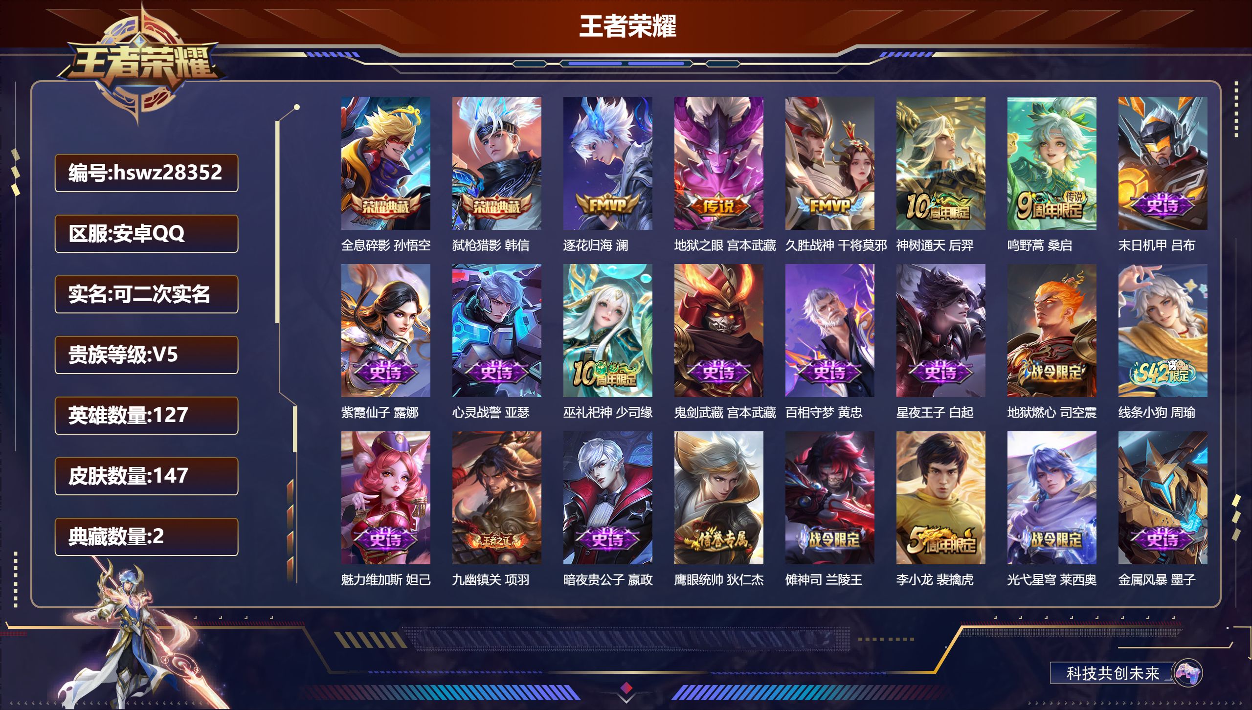 PX_2559515-Q/至尊星耀/147皮肤/127英雄/2典藏/0珍品无双/0无双/0珍品传说/5传说/43史诗/8稀有英雄 【2,典藏皮肤】全息碎影,孙悟空,弑枪猎影,韩信, 【5,传说皮肤】逐花归海,澜,地狱之眼,宫本武藏,久胜战神,干将莫邪,神树通天,后羿,鸣野蒿,桑启, 【43,史诗皮肤】末日机甲,吕布,紫霞仙子,露娜,心灵战警,亚瑟,巫礼祀神,少司缘,鬼剑武藏,宫本武藏,百相守梦,黄忠,星夜王子,白起,地狱燃心,司空震,线条小狗,周瑜,魅力维加斯,妲己,九幽镇关,项羽,暗夜贵公子,嬴政,鹰眼统帅,狄仁杰,傩神司,兰陵王,李小龙,裴擒虎,光弋星穹,莱西奥,金属风暴,墨子,原初追逐者,百里玄策,未来纪元,赵云,灵蛊蚀心,扁鹊,鸭鸭历险记,刘禅,龙之律动,狂铁,顽岩魄,蒙犽,皇家上将,赵云,至尊宝,孙悟空,圣诞恋歌,貂蝉,云间偶戏,元歌,水晶猎龙者,花木兰,罗小黑战记,百里玄策,星界战将,牛魔,地狱岩魂,廉颇,蔷薇恋人,孙尚香,冰雪圆舞曲,甄姬,青蛇,小乔,曙光守护者,铠,心灵骇客,安琪拉,百相守梦,周瑜,线条小狗,小乔,水果甜心,孙尚香,化蝶舞,阿轲,幽灵船长,曹操,乘风破浪,夏侯惇,暗隐猎兽者,兰陵王, 【78,勇者皮肤】时空谍影,海诺,太极少年,赵怀真,纽约教父,刘备,龙舞盛年,沈梦溪,铁甲之心,典韦,沉稳之力,孙尚香,白色死神,白起,黄金武士,典韦,王牌新星,海月,阴阳师,狄仁杰,径山谋武,孙权,戏梦巡演,空空儿,功夫老勺,老夫子,海滩派对,项羽,克喵,鬼谷子,踏浪烽翎,莱西奥,野性能量,吕布,哥特玫瑰,露娜,百相守梦,影,潮玩探月行,猪八戒,天穹祈灯,鬼谷子,阿尔法小队,后羿,死亡骑士,亚瑟,浪漫序章,刘备,敏锐之力,李白,掌控之力,诸葛亮,海滩丽影,钟无艳,忍·炎影,赵云,雪境奇遇,西施,逐霄战戟,吕布,糖果风暴,安琪拉,乓乓大师,鲁班大师,溯影追猎,虞姬,雾都夜雨,干将莫邪,未来纪元,宫本武藏,罗小黑战记,哪吒,往忆晖光,明世隐,荣光之誓,亚瑟,花好人间,甄姬,秘密基地,刘禅,教廷特使,韩信,街头霸王,韩信,西部大镖客,孙悟空,紫罗兰之誓,妲己,少女阿狸,妲己,蔚蓝守将,蒙恬,春野闲踪,苏烈,布丁狗之约,阿古朵,命运加冕,露娜,小满鸭,姬小满,幻想奇妙夜,王昭君,灵野札记,张良,潮玩士官长,雅典娜,鸭鸭历险记,沈梦溪,死霸装,白起,特工战影,狂铁,虚灵犬护,钟馗,白执事,赵云,神迹守卫,孙悟空,剑破天穹,刘邦,苍威无极,项羽,铁骨偃魂,典韦,熔金海岸,周瑜,苍林狼骑,苍,天穹之誓,姜子牙,星梦巡礼,姜子牙,谧流熔炉,太乙真人,暗都幽影,大司命,鹤鸣心笺,艾琳,锦麟游梦,庄周,逆浪荇歌,甄姬,百相守梦,孙策,海之女神,海月,线条小狗,周瑜,噬灭天穹,东皇太一,敬我三分,盘古,玫蓝誓约,戈娅,景韶洛都,明世隐, 【21,其他皮肤】芝加哥教父,黄忠,龙域领主,铠,花见巫女,伽罗,灼热之刃,李信,福禄兄弟,鲁班七号,帝国元帅,项羽,精灵王,后羿,魇语军师,司马懿,隐刃,兰陵王,修竹墨客,上官婉儿,剑舞者,花木兰,维京掠夺者,苍,占星师,明世隐,归虚梦演,蒙犽,激情绿茵,马可波罗,创世神祝,盘古,绝影神枪,百里守约,孤猎,澜,加勒比小姐,虞姬,赤焰之缨,云缨,西部大镖客,孙悟空, 【8,稀有英雄】嬴政,不知火舞,橘右京,夏洛特,娜可露露,韩信,艾琳,赵云, 营地ID:,