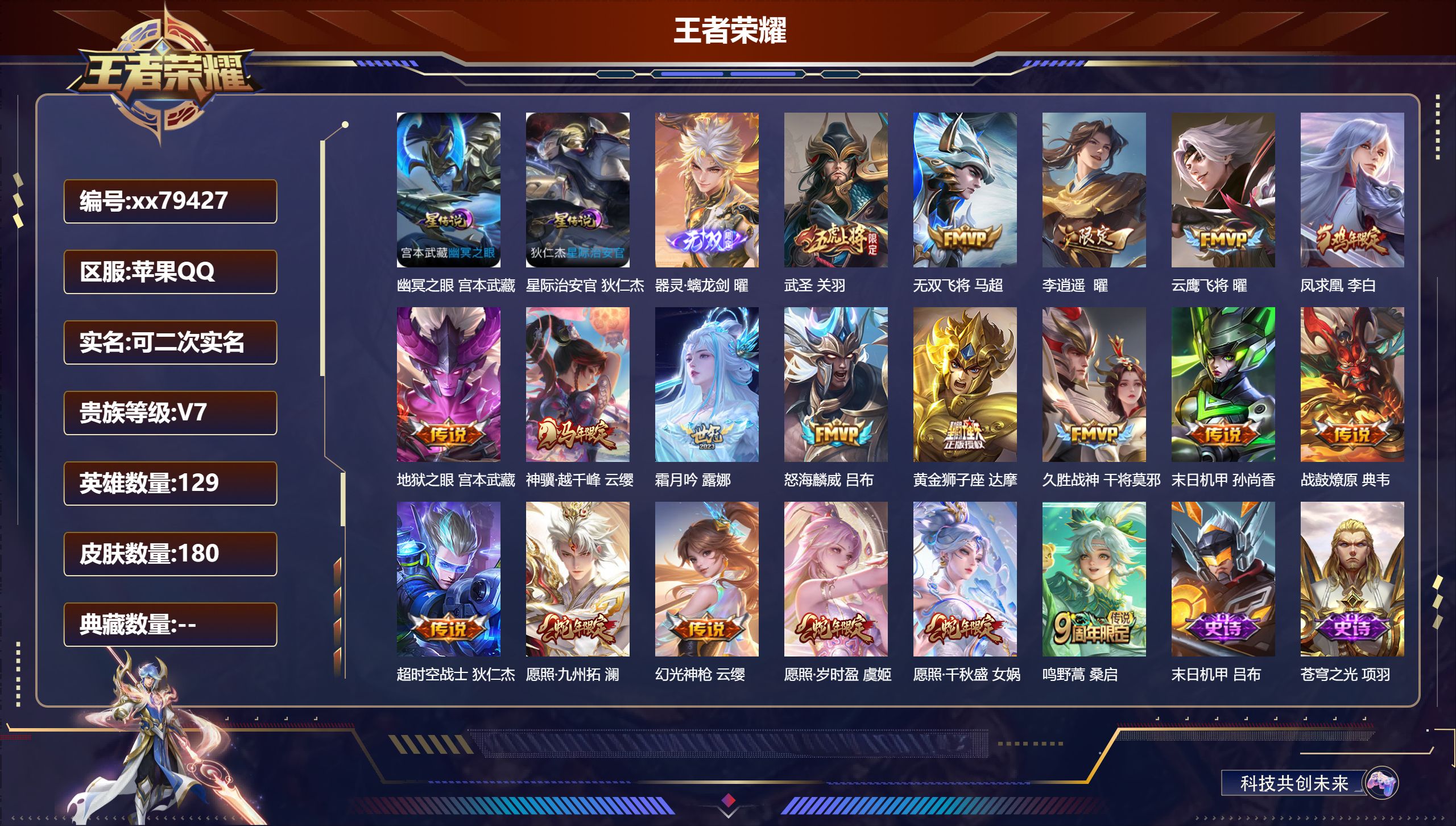 PX_2574572-,可二次,V7,贵族积分24006,苹果QQ/180皮肤/129英雄/0典藏/0珍品无双/1无双/0珍品传说/19传说/53史诗/9稀有英雄 【2,星传说皮肤】,幽冥之眼,宫本武藏,星际治安官,狄仁杰, 【1,无双皮肤】,器灵·螭龙剑,曜, 【19,传说皮肤】,武圣,关羽,无双飞将,马超,李逍遥,,曜,云鹰飞将,曜,凤求凰,李白,地狱之眼,宫本武藏,神骥·越千峰,云缨,霜月吟,露娜,怒海麟威,吕布,黄金狮子座,达摩,久胜战神,干将莫邪,末日机甲,孙尚香,战鼓燎原,典韦,超时空战士,狄仁杰,愿照·九州拓,澜,幻光神枪,云缨,愿照·岁时盈,虞姬,愿照·千秋盛,女娲,鸣野蒿,桑启, 【53,史诗皮肤】,末日机甲,吕布,苍穹之光,项羽,德古拉伯爵,刘邦,心灵战警,亚瑟,五谷丰年,鬼谷子,无心,元歌,鬼剑武藏,宫本武藏,百相守梦,黄忠,线条小狗,周瑜,摇滚巨星,嬴政,魅力维加斯,妲己,黄金分割率,诸葛亮,偶像歌手,王昭君,赏金猎手,澜,九幽镇关,项羽,暗夜贵公子,嬴政,鹰眼统帅,狄仁杰,飞衡,韩信,孙行者,孙悟空,龙骑士,墨子,傲雪梅枪,韩信,特工魅影,百里守约,猫狗日记,孙策,原初追逐者,百里玄策,未来纪元,赵云,魔术师,狄仁杰,热力回旋,百里玄策,埋骨钱,暃,龙之律动,狂铁,皇家上将,赵云,至尊宝,孙悟空,功夫厨神,程咬金,电玩·爆裂旋风,刘禅,圣诞恋歌,貂蝉,水晶猎龙者,花木兰,圣诞狂欢,吕布,罗小黑战记,百里玄策,夏日便利店,蔡文姬,星界战将,牛魔,地狱岩魂,廉颇,蔷薇恋人,孙尚香,千年之狐,李白,节奏热浪,阿轲,暗夜猫娘,阿轲,曙光守护者,铠,万灵启世,女娲,箭羽风息,伽罗,乱世虎臣,张飞,水果甜心,孙尚香,化蝶舞,阿轲,幽灵船长,曹操,乘风破浪,夏侯惇,暗隐猎兽者,兰陵王, 【83,勇者皮肤】,爱心护理,阿轲,太极少年,赵怀真,大漠名商,沈梦溪,纽约教父,刘备,拳王,达摩,大发明家,达摩,龙舞盛年,沈梦溪,功夫炙烤,廉颇,沉稳之力,孙尚香,海盐诗旅,桑启,汉昭烈帝,刘备,白色死神,白起,黄金武士,典韦,阴阳师,狄仁杰,古海寻踪,张良,戏梦巡演,空空儿,海滩派对,项羽,克喵,鬼谷子,踏浪烽翎,莱西奥,野性能量,吕布,哥特玫瑰,露娜,守护之力,大乔,百相守梦,影,天穹祈灯,鬼谷子,阿尔法小队,后羿,五福同心,张飞,虹云星官,明世隐,死亡骑士,亚瑟,敏锐之力,李白,玩偶对对碰,安琪拉,掌控之力,诸葛亮,海滩丽影,钟无艳,忍·炎影,赵云,雪境奇遇,西施,坚韧之力,苏烈,擒涛扼浪,裴擒虎,乓乓大师,鲁班大师,逐霄之志,曹操,溯影追猎,虞姬,极光幻客,蚩奼,探海日志,鲁班大师,玩趣恶龙,高渐离,兔女郎,花木兰,龙腾万里,关羽,未来纪元,宫本武藏,罗小黑战记,哪吒,荣光之誓,亚瑟,花好人间,甄姬,万象初新,宫本武藏,时尚教父,姜子牙,春野之旅,钟无艳,教廷特使,韩信,街头霸王,韩信,云中旅人,李元芳,妄想特派,李元芳,蔚蓝守将,蒙恬,春野闲踪,苏烈,布丁狗之约,阿古朵,命运加冕,露娜,小满鸭,姬小满,灵野札记,张良,命运角斗场,狂铁,死霸装,白起,特工战影,狂铁,虚灵犬护,钟馗,剑破天穹,刘邦,铁骨偃魂,典韦,熔金海岸,周瑜,苍林狼骑,苍,天穹之誓,姜子牙,星梦巡礼,姜子牙,谧流熔炉,太乙真人,群星魔术团,程咬金,夏日便利店,虞姬,鹤鸣心笺,艾琳,锦麟游梦,庄周,逆浪荇歌,甄姬,海之女神,海月,线条小狗,周瑜,噬灭天穹,东皇太一,爆裂喵拳,达摩,玫蓝誓约,戈娅,景韶洛都,明世隐, 【25,其他皮肤】,前尘,金蝉,芝加哥教父,黄忠,龙域领主,铠,灼热之刃,李信,熊喵少女,阿古朵,绯红之刃,露娜,魇语军师,司马懿,启蛰,司空震,花间舞,公孙离,东海龙王,东皇太一,修竹墨客,上官婉儿,维京掠夺者,苍,占星师,明世隐,归虚梦演,蒙犽,激情绿茵,马可波罗,年年有余,猪八戒,尼罗河女神,女娲,归虚梦演,曜,幸存者,马超,战争女神,雅典娜,特种部队,李元芳,绝影神枪,百里守约,加勒比小姐,虞姬,赤焰之缨,云缨,地府判官,钟馗, 【9,稀有英雄】,敖隐,嬴政,不知火舞,橘右京,夏洛特,娜可露露,韩信,艾琳,赵云, 营地ID:,