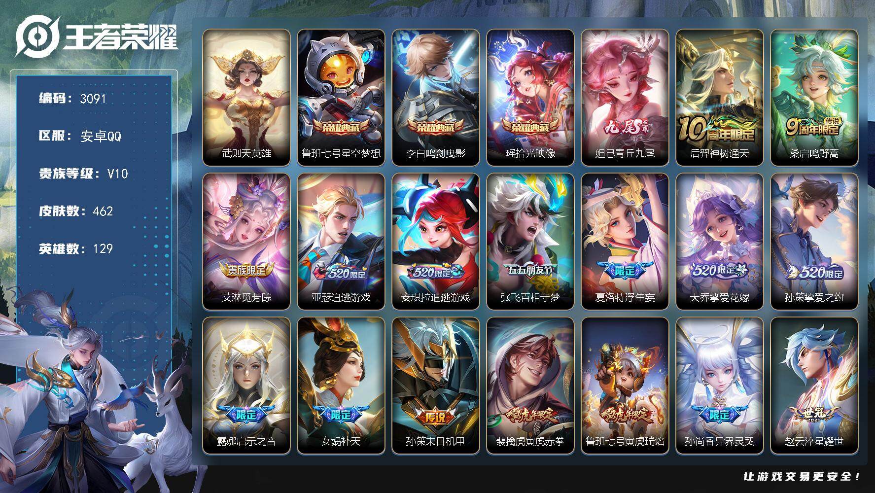 PX_2567566-制,金标万战虞姬,3星传说,游戏禁言4.28结束安卓Q-V10-至尊星耀II段位-129英雄-462皮肤-3典藏皮肤-1典藏英雄-1无双-37传说-152史诗 【英雄全皮】:刘邦全皮,孙权全皮,苏烈全皮,猪八戒全皮,敖隐全皮,夏洛特全皮,金蝉全皮,空空儿全皮,影全皮 【荣耀典藏】:武则天英雄,鲁班七号星空梦想,李白鸣剑曳影,瑶拾光映像 【无双皮肤】:妲己青丘九尾 【传说皮肤】:后羿神树通天,桑启鸣野蒿,艾琳觅芳踪,亚瑟追逃游戏,安琪拉追逃游戏,张飞百相守梦,夏洛特浮生妄,大乔挚爱花嫁,孙策挚爱之约,露娜启示之音,女娲补天,孙策末日机甲,裴擒虎寅虎赤拳,鲁班七号寅虎瑞焰,孙尚香异界灵契,赵云淬星耀世,周瑜音你心动,诸葛亮时雨天司,虞姬启明星使,关羽武圣,曜云鹰飞将,李信一念神魔,刘备时之恋人,伽罗太华,貂蝉猫影幻舞,达摩黄金狮子座,百里玄策白虎志,后羿黄金射手座,杨戬永曜之星,诸葛亮武陵仙君,李白凤求凰,孙尚香末日机甲,宫本武藏地狱之眼,孙悟空地狱火,吕布天魔缭乱,武则天海洋之心,狄仁杰超时空战士 【限定皮肤】:白起狰,姜子牙天穹之誓,狄仁杰阴阳师,小乔纯白花嫁,虞姬凯尔特女王,廉颇寅虎御盾,赵云皇家上将,赵云百木心枪,墨子神迹守卫,妲己热情桑巴,嬴政优雅恋人,嬴政白昼王子,孙尚香蔷薇恋人,孙尚香异界灵契,鲁班七号狮舞东方,鲁班七号寅虎瑞焰,庄周云端筑梦师,庄周高山流水,高渐离死亡摇滚,阿轲迷踪丽影,孙膑天狼运算者,孙膑寅虎展翼,扁鹊奇幻香踪,白起夜都怪侠,芈月重明,芈月幻夜卜梦,吕布天魔缭乱,吕布猎兽之王,周瑜赤莲之焰,元歌云间偶戏,元歌无心,夏侯惇朔风刀,夏侯惇匿光决锋者,甄姬女儿国国王,甄姬游园惊梦,曹操烛龙,曹操天狼征服者,典韦穷奇,典韦蓝屏警告,马可波罗逐梦之星,马可波罗暗影游猎,狄仁杰魔术师,狄仁杰万华元夜,达摩星际陆战队,达摩沙漠行僧,项羽海滩派对,项羽霸王别姬,老夫子醍醐杖,老夫子航海奇遇记,关羽冰锋战神,关羽武圣,关羽百相守梦,貂蝉逐梦之音,安琪拉魔法小厨娘,安琪拉追逃游戏,程咬金演武夺筹,露娜一生所爱,露娜启示之音,刘邦夺宝奇兵,韩信飞衡,韩信傲雪梅枪,王昭君凤凰于飞,兰陵王驯魔猎人,兰陵王金庭之子,花木兰青春决赛季,花木兰瑞麟志,花木兰默契交锋,亚瑟潮玩骑士王,亚瑟追逃游戏,孙悟空至尊宝,孙悟空大圣娶亲,孙悟空孙行者,牛魔御旌,后羿辉光之辰