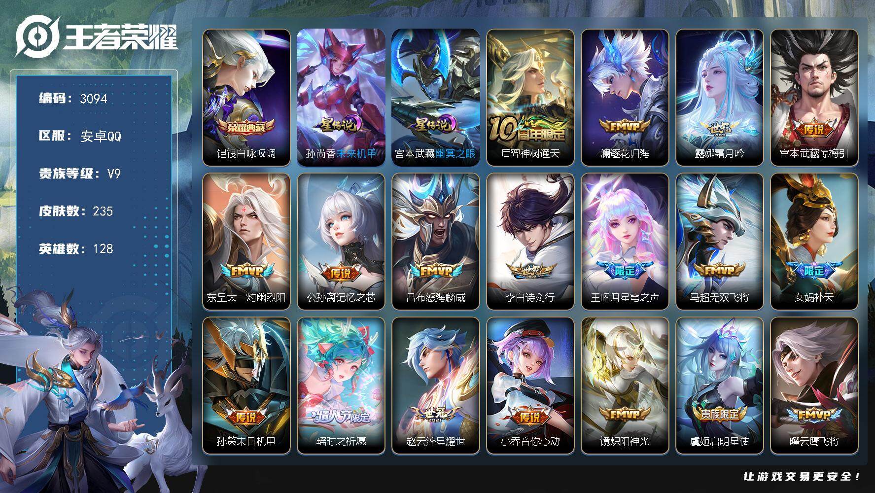 PX_2567571-时之愿境,幽冥之眼星际治安官,未来机甲,安卓Q-V9-尊贵铂金I段位-128英雄-235皮肤-1典藏皮肤-29传说-67史诗 【英雄全皮】:莱西奥全皮 【荣耀典藏】:铠银白咏叹调 【传说皮肤】:后羿神树通天,澜逐花归海,露娜霜月吟,宫本武藏惊梅引,东皇太一灼幽烈阳,公孙离记忆之芯,吕布怒海麟威,李白诗剑行,王昭君星穹之声,马超无双飞将,女娲补天,孙策末日机甲,瑶时之祈愿,赵云淬星耀世,小乔音你心动,镜炽阳神光,虞姬启明星使,曜云鹰飞将,李信一念神魔,刘备时之恋人,干将莫邪久胜战神,虞姬云霓雀翎,达摩黄金狮子座,梦奇胖达荣荣,貂蝉仲夏夜之梦,孙尚香末日机甲,宫本武藏地狱之眼,孙悟空地狱火,狄仁杰超时空战士 【限定皮肤】:狄仁杰阴阳师,赵云皇家上将,高渐离玩趣恶龙,扁鹊奇幻香踪,元歌无心,甄姬游园惊梦,狄仁杰魔术师,项羽海滩派对,老夫子航海奇遇记,关羽百相守梦,王昭君星穹之声,刘备百相守梦,李元芳云中旅人,虞姬启明星使,杨戬潮玩骑兵,女娲补天,蔡文姬繁星吟游,鬼谷子五谷丰年,裴擒虎李小龙,裴擒虎擒涛扼浪,瑶时之祈愿,云中君纤云弄巧,嫦娥拒霜思,嫦娥暖冬兔眠,鲁班大师探海日志,桑启海盐诗旅,暃星界游侠,艾琳流音漫舞,司空震地狱燃心,阿古朵江河有灵,张良古海寻踪,高渐离燃音魔法,妲己灵卜魔法,鬼谷子天穹祈灯,刘邦剑破天穹,周瑜熔金海岸 【赛季限定】:李元芳云中旅人,桑启海盐诗旅,裴擒虎擒涛扼浪,鲁班大师探海日志,张良古海寻踪,鬼谷子天穹祈灯,刘邦剑破天穹,东皇太一噬灭天穹,钟馗虚灵犬护,甄姬逆浪荇歌,亚瑟荣光之誓 【战令限定】:老夫子航海奇遇记,暃星界游侠,嫦娥暖冬兔眠,扁鹊奇幻香踪,杨戬潮玩骑兵,司空震地狱燃心,艾琳流音漫舞,高渐离燃音魔法,妲己灵卜魔法,莱西奥光弋星穹,明世隐往忆晖光,周瑜线条小狗 【史诗皮肤】:周瑜线条小狗,少司缘巫礼祀神,莱西奥光弋星穹,扁鹊灵蛊蚀心,狂铁龙之律动,高渐离燃音魔法,妲己灵卜魔法,阿古朵江河有灵,司空震地狱燃心,莱西奥末日机甲,百里守约真我赫兹,刘禅电玩爆裂旋风,关羽百相守梦,刘备百相守梦,扁鹊奇幻香踪,杨玉环银翎春语,暃星界游侠,元歌无心,鬼谷子五谷丰年,弈星滕王阁序,张良千筹问战,貂蝉唤灵魅影,夏洛特永昼,嫦娥拒霜思,司马懿暗渊魔法,钟馗乐园奇幻夜,杨戬天秀启明,老夫子航海奇遇记,百里玄策热力回旋,西施诗语江南,云中君纤云弄巧