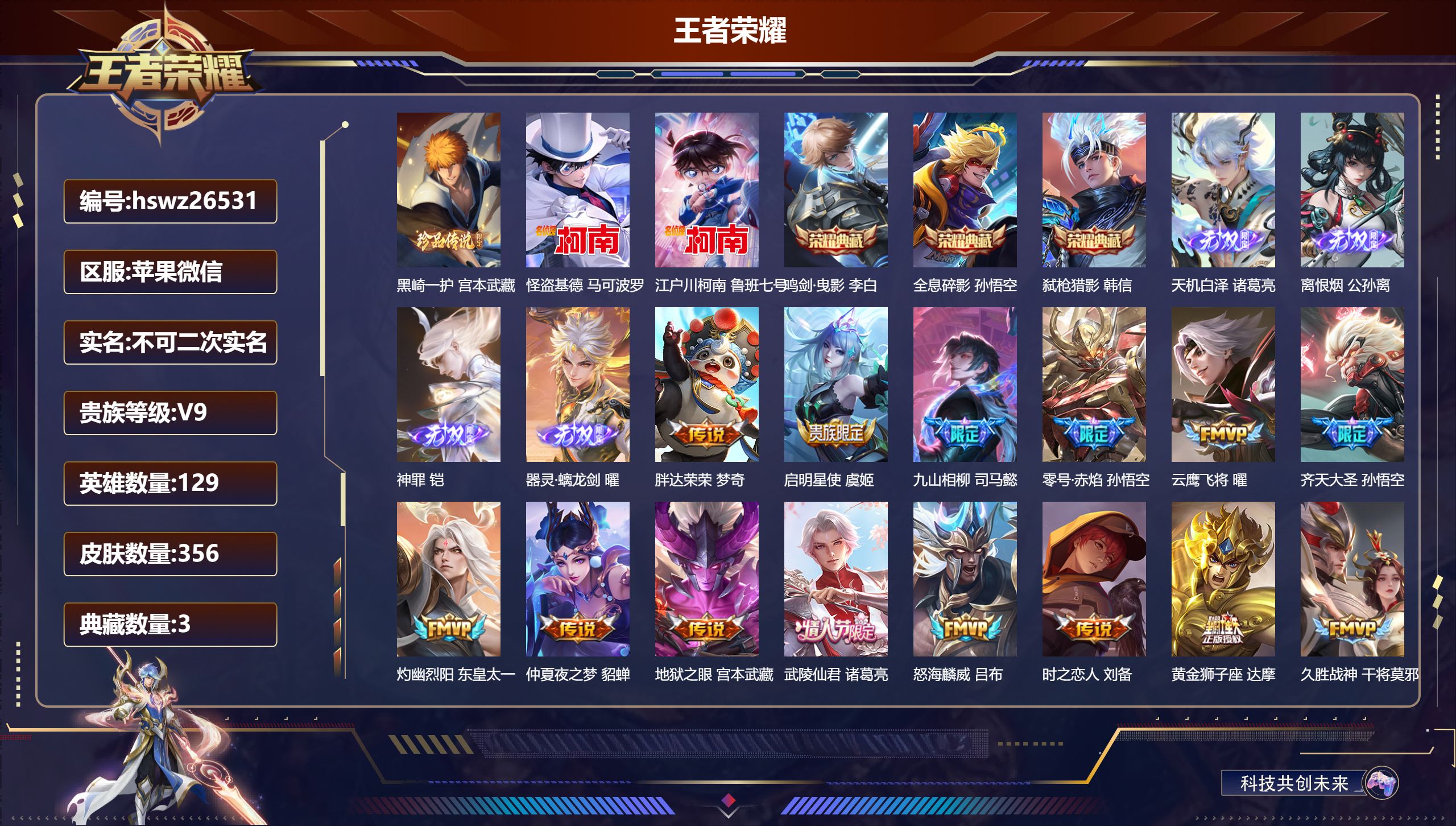 PX_2558035-??信/至尊星耀/356皮肤/129英雄/3典藏/0珍品无双/4无双/3珍品传说/27传说/114史诗/9稀有英雄 【3,珍品传说】黑崎一护,宫本武藏,怪盗基德,马可波罗,江户川柯南,鲁班七号, 【3,典藏皮肤】鸣剑·曳影,李白,全息碎影,孙悟空,弑枪猎影,韩信, 【4,无双皮肤】天机白泽,诸葛亮,离恨烟,公孙离,神罪,铠,器灵·螭龙剑,曜, 【27,传说皮肤】胖达荣荣,梦奇,启明星使,虞姬,九山相柳,司马懿,零号·赤焰,孙悟空,云鹰飞将,曜,齐天大圣,孙悟空,灼幽烈阳,东皇太一,仲夏夜之梦,貂蝉,地狱之眼,宫本武藏,武陵仙君,诸葛亮,怒海麟威,吕布,时之恋人,刘备,黄金狮子座,达摩,久胜战神,干将莫邪,异界灵契,孙尚香,山海·炽霜斩,李信,一念神魔,李信,战鼓燎原,典韦,山海·琳琅生,小乔,绛天战甲,铠,寅虎·赤拳,裴擒虎,山海·苍雷引,曜,黄金白羊座,张良,玄雷天君,嬴政,神树通天,后羿,幻光神枪,云缨,鸣野蒿,桑启, 【114,史诗皮肤】电玩小子,鲁班七号,末日机甲,吕布,紫霞仙子,露娜,高山流水,庄周,匿光追影者,镜,奇遇舞章,艾琳,暗渊魔法,司马懿,暗影游猎,马可波罗,燃音魔法,高渐离,天秀·音浪,高渐离,苍穹之光,项羽,天秀·启明,杨戬,猫狗日记,大乔,德古拉伯爵,刘邦,山海·玄木吟,马可波罗,心灵战警,亚瑟,五谷丰年,鬼谷子,无心,元歌,巫礼祀神,少司缘,鬼剑武藏,宫本武藏,百相守梦,黄忠,迷踪丽影,阿轲,星夜王子,白起,无限星赏官,公孙离,地狱燃心,司空震,线条小狗,周瑜,百晓客,明世隐,摇滚巨星,嬴政,顽趣,梦奇,冰锋战神,关羽,百相守梦,关羽,修罗,橘右京,魅力维加斯,妲己,黄金分割率,诸葛亮,偶像歌手,王昭君,荣光圣徽,蒙恬,女仆咖啡,妲己,白蛇,大乔,赏金猎手,澜,九幽镇关,项羽,星界游侠,暃,晚萤,娜可露露,鹰眼统帅,狄仁杰,胡桃异想国,米莱狄,飞衡,韩信,孙行者,孙悟空,傩神司,兰陵王,李小龙,裴擒虎,光弋星穹,莱西奥,纤云弄巧,云中君,金属风暴,墨子,逐梦之影,韩信,冰霜神祇,盘古,特工魅影,百里守约,猫狗日记,孙策,原初追逐者,百里玄策,逐浪之夏,李元芳,奇幻香踪,扁鹊,未来纪元,赵云,灵蛊蚀心,扁鹊,黎明之约,雅典娜,优雅恋人,嬴政,鸭鸭历险记,刘禅,魔术师,狄仁杰,热力回旋,百里玄策,龙之律动,狂铁,神威,马超,顽岩魄,蒙犽,皇家上将,赵云,冰冠公主,雅典娜,至尊宝,孙悟空,梁祝,上官婉儿,天才门将,刘禅,圣诞恋歌,貂蝉,水晶猎龙者,花木兰,山海·碧波行,瑶,撼地雄心,廉颇,涂山容容,公孙离,破空之剑,亚连,圣诞狂欢,吕布,魅语,不知火舞,器灵·浮梦炉,赵怀真,罗小黑战记,百里玄策,夏日便利店,蔡文姬,岱宗,典韦,星界战将,牛魔,永昼,夏洛特,地狱岩魂,廉颇,茶境仙,孙膑,蔷薇恋人,孙尚香,冰雪圆舞曲,甄姬,火炮绅士,黄忠,千年之狐,李白,节奏热浪,阿轲,暗夜猫娘,阿轲,游园惊梦,甄姬,曙光守护者,铠,万灵启世,女娲,心灵骇客,安琪拉,乱世虎臣,张飞,百相守梦,周瑜,万物之道,弈星,绅士熊喵,刘禅,缤纷独角兽,小乔,百相守梦,百里守约,线条小狗,小乔,真爱魔法,干将莫邪,水果甜心,孙尚香,狂想玩偶喵,蒙犽,江河有灵,阿古朵,狼魂孤将,苍,幽灵船长,曹操,乘风破浪,夏侯惇,暗隐猎兽者,兰陵王, 【155,勇者皮肤】玲珑珍味,西施,圆桌骑士,盾山,星际陆战队,达摩,沙漠行僧,达摩,大漠名商,沈梦溪,缤纷绘卷,张良,纽约教父,刘备,拳王,达摩,大发明家,达摩,龙舞盛年,沈梦溪,丁香结,小乔,功夫炙烤,廉颇,铁甲之心,典韦,沉稳之力,孙尚香,幻夜卜梦,芈月,海盐诗旅,桑启,幻泉雾影,海月,朔风刀,夏侯惇,醍醐杖,老夫子,归虚梦演,孙膑,汉昭烈帝,刘备,白色死神,白起,黄金武士,典韦,阴阳师,狄仁杰,径山谋武,孙权,次元突破,哪吒,古海寻踪,张良,牛运亨通,牛魔,戏梦巡演,空空儿,功夫老勺,老夫子,西部大镖客,牛魔,鲨炮海盗猫,沈梦溪,虎啸剑宗,刘邦,海滩派对,项羽,完美运算,后羿,万华元夜,狄仁杰,无尽征程,廉颇,克喵,鬼谷子,制霸全明星,牛魔,踏浪烽翎,莱西奥,演武夺筹,程咬金,红桃皇后,芈月,奇妙博物学,庄周,野性能量,吕布,哥特玫瑰,露娜,守护之力,大乔,无双福将,程咬金,百相守梦,影,原初探秘者,鬼谷子,潮玩探月行,猪八戒,天穹祈灯,鬼谷子,决胜大满贯,曹操,疑决卦,明世隐,化身博士,扁鹊,阿尔法小队,后羿,五福同心,张飞,金色潮汐,朵莉亚,次元傲视,杨戬,星际陆战队,程咬金,幻乐之宴,鬼谷子,虹云星官,明世隐,雾影缉谜,兰陵王,潮玩牛仔,马可波罗,舞狮寰,吕布,赤刃凌霄,敖隐,潮玩骑兵,杨戬,死亡骑士,亚瑟,浪漫序章,刘备,危途狂花,戈娅,玩偶对对碰,安琪拉,海滩丽影,钟无艳,圣弓游侠,后羿,忍·炎影,赵云,雪境奇遇,西施,坚韧之力,苏烈,万事如意,刘备,擒涛扼浪,裴擒虎,苍云破阵,蒙恬,糖果风暴,安琪拉,乓乓大师,鲁班大师,逐霄之志,曹操,死亡摇滚,高渐离,溯影追猎,虞姬,极光幻客,蚩奼,探海日志,鲁班大师,天使之翼,孙膑,雾都夜雨,干将莫邪,兔女郎,花木兰,龙腾万里,关羽,流音漫舞,艾琳,金庭之子,兰陵王,罗小黑战记,哪吒,千军破阵,苏烈,往忆晖光,明世隐,零食大作战,姬小满,荣光之誓,亚瑟,花好人间,甄姬,万象初新,宫本武藏,御銮,盾山,单词大作战,雅典娜,时尚教父,姜子牙,秘密基地,刘禅,教廷特使,韩信,街头霸王,韩信,云中旅人,李元芳,妄想特派,李元芳,西部大镖客,孙悟空,蔬乡物语,李元芳,少女阿狸,妲己,混沌棋,弈星,秘证寻踪,小乔,蔚蓝守将,蒙恬,春野闲踪,苏烈,契约魔法,米莱狄,布丁狗之约,阿古朵,暖冬·兔眠,嫦娥,命运加冕,露娜,午后时光,王